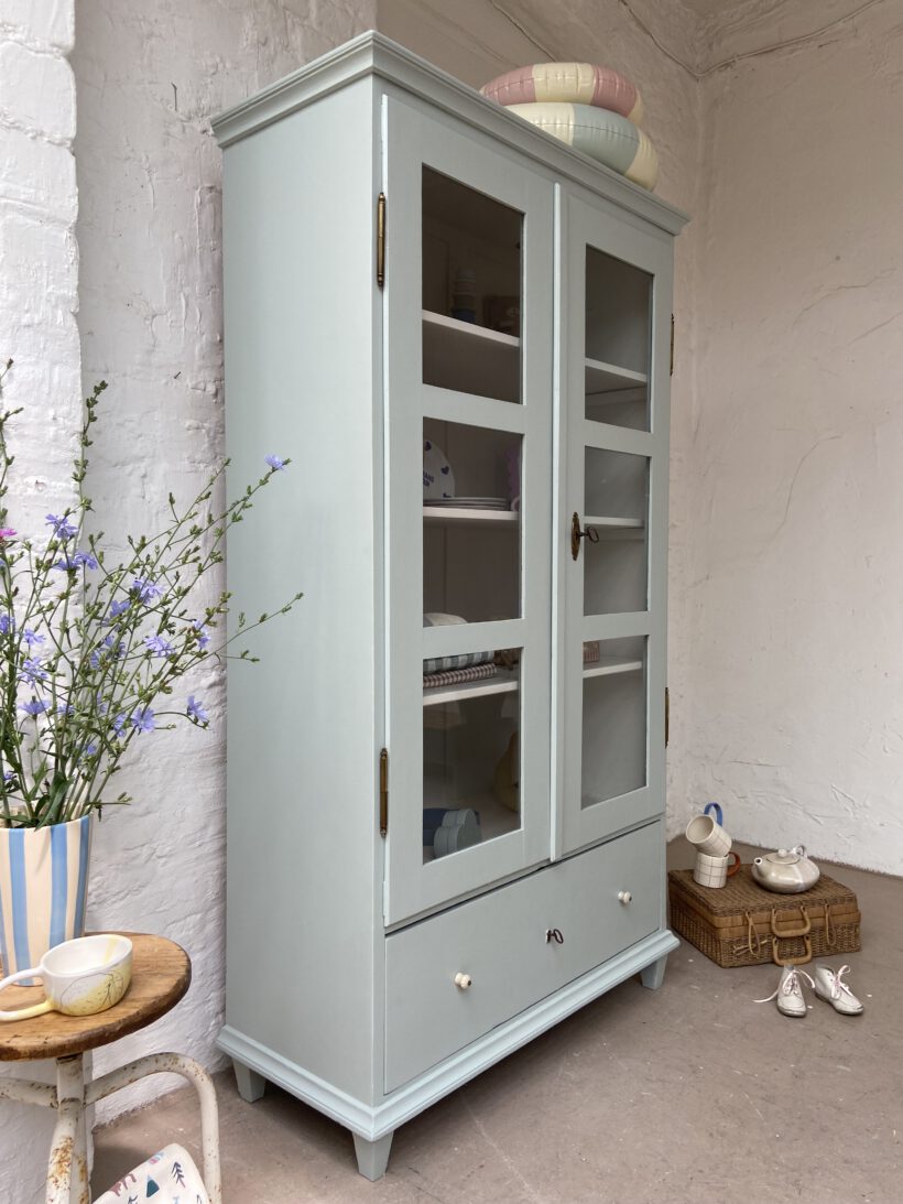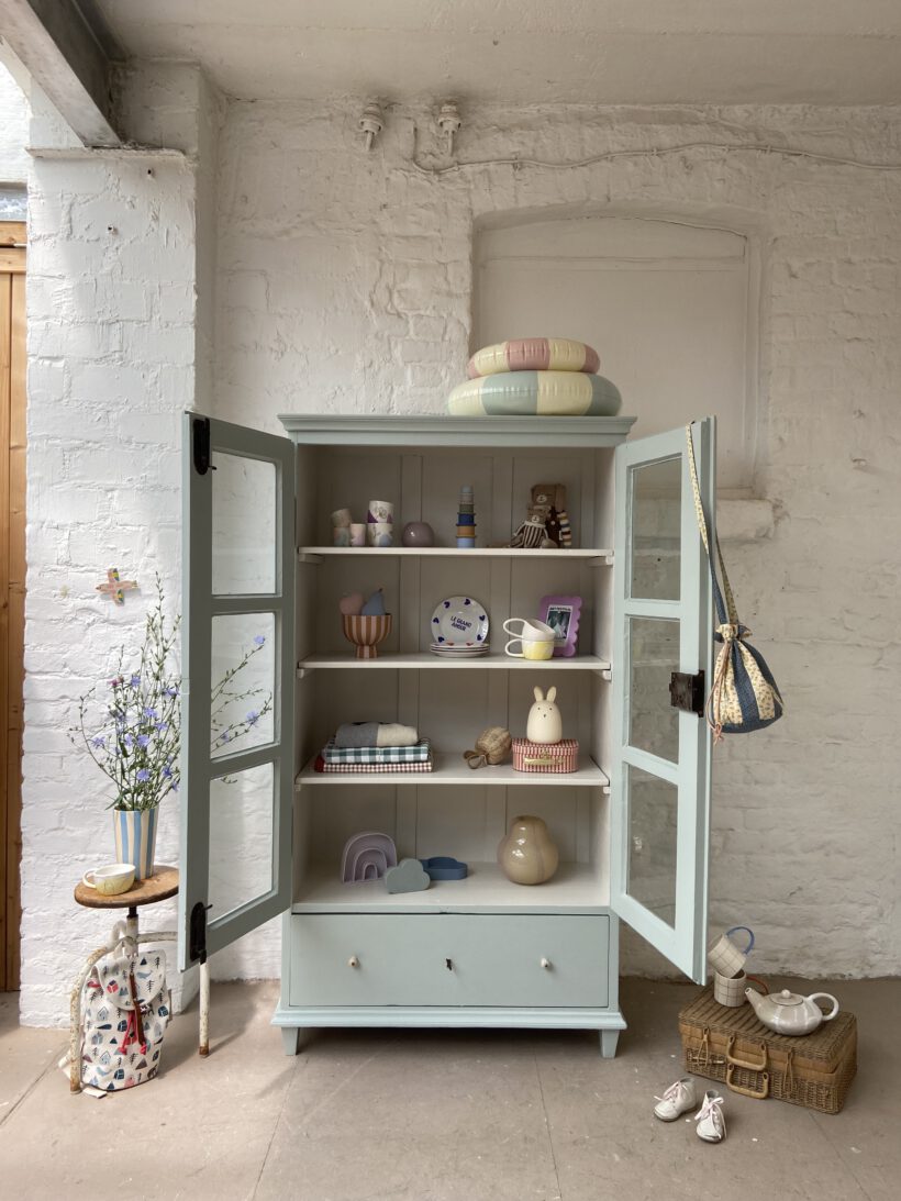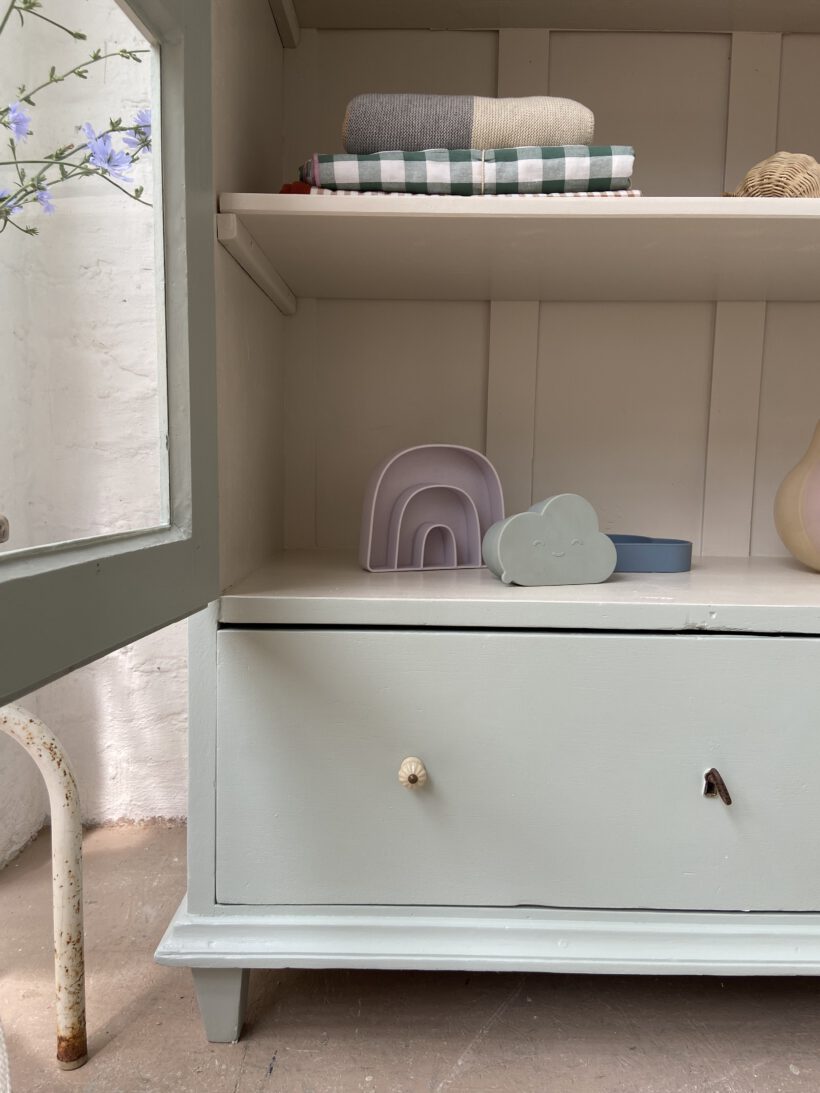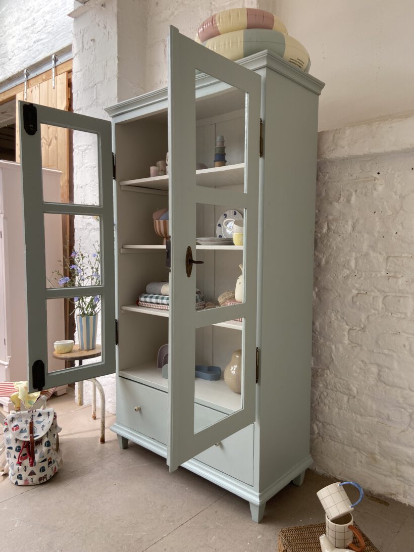 Wir haben Aaron zweifarbig aufbereitet. Er wurde restauriert, grundiert und zwei Mal mit Farrow & Ball Farben lackiert. Innen trägt er ein cremeweiß, außen einen zauberhaften hellen grünblau Farbton. Definitiv Love!
