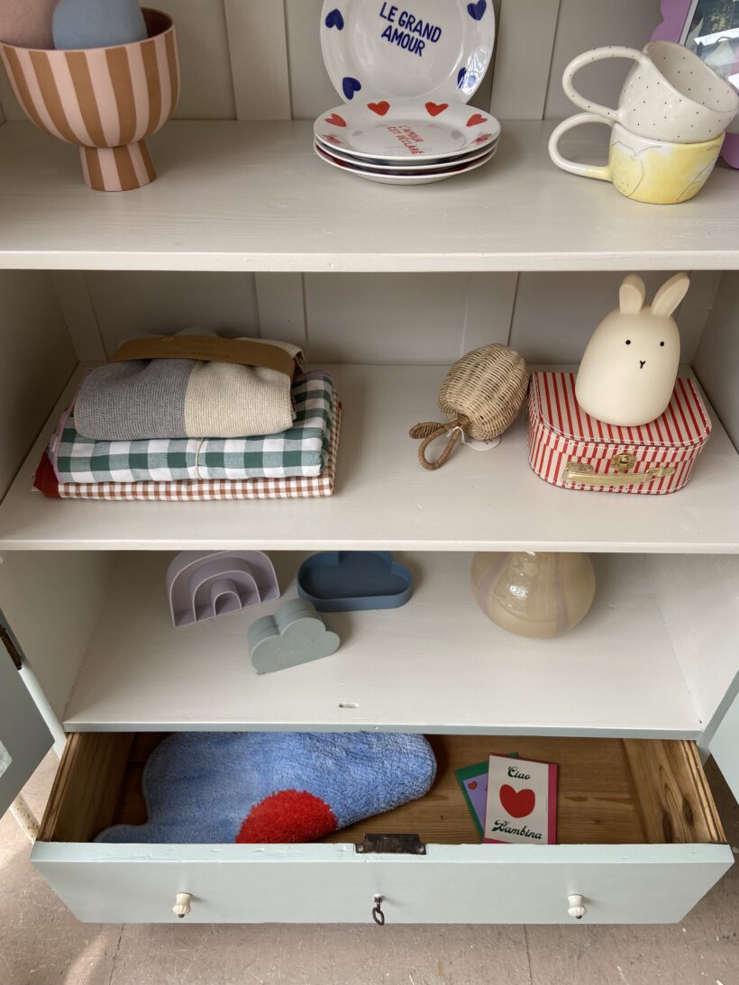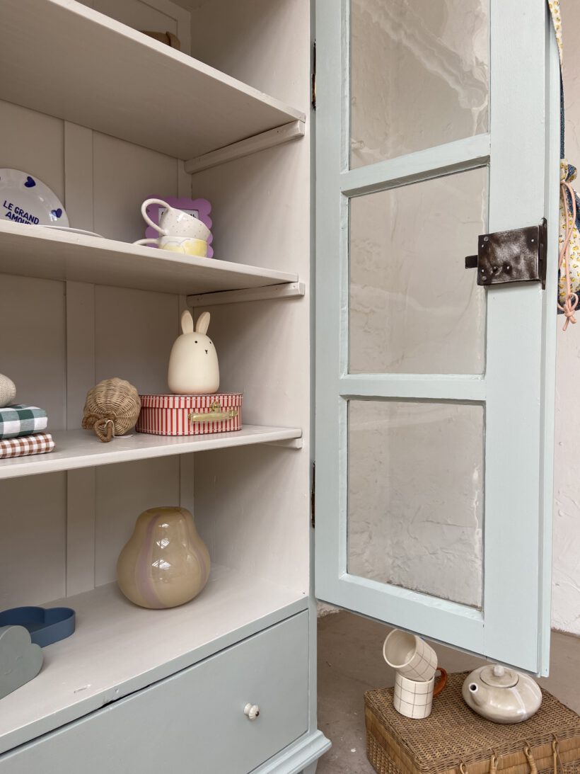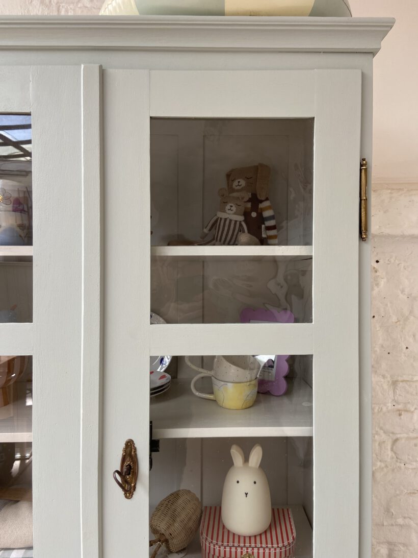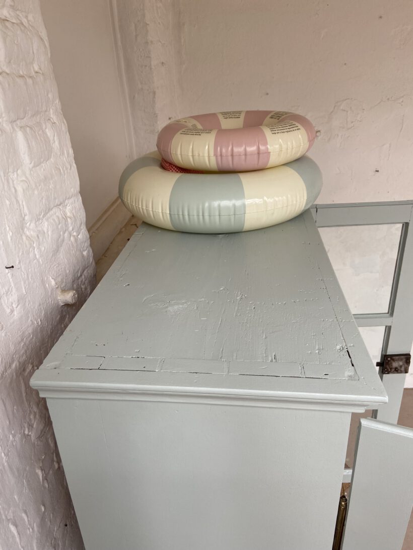 Wir haben Aaron zweifarbig aufbereitet. Er wurde restauriert, grundiert und zwei Mal mit Farrow & Ball Farben lackiert. Innen trägt er ein cremeweiß, außen einen zauberhaften hellen grünblau Farbton. Definitiv Love!
