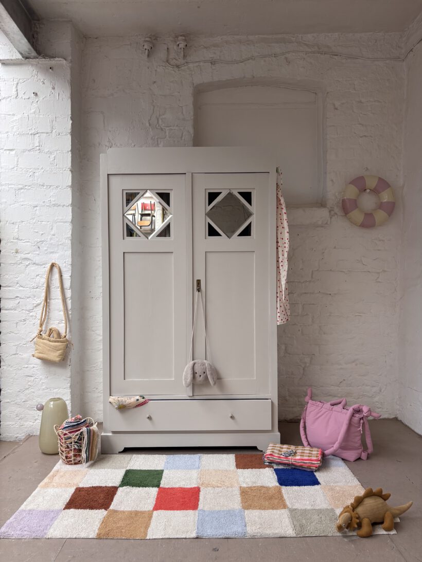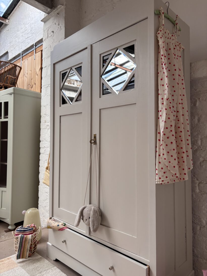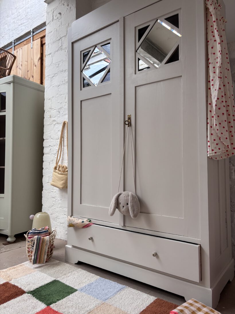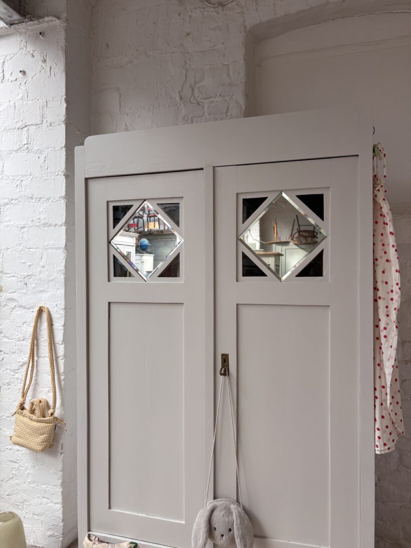 Innen hat sie von uns einen Boden und Kleiderstange bekommen. Außen ist sie in einem schlichten weiß von Farrow and Ball lackiert. Sie wurde geschliffen, grundiert und drei mal lackiert. Die dreieckigen vormals grasgrünen Fenster haben wir ersetzt durch schlichte Fenster. Die Tür schließt per Magnet, da kein Schlüssel mehr vorhanden ist.
