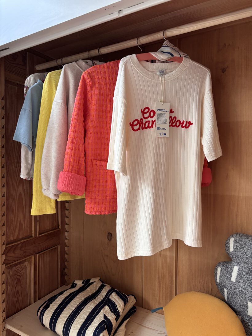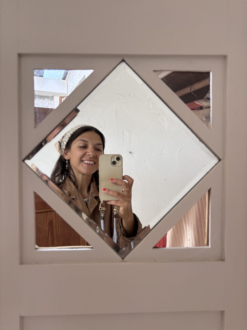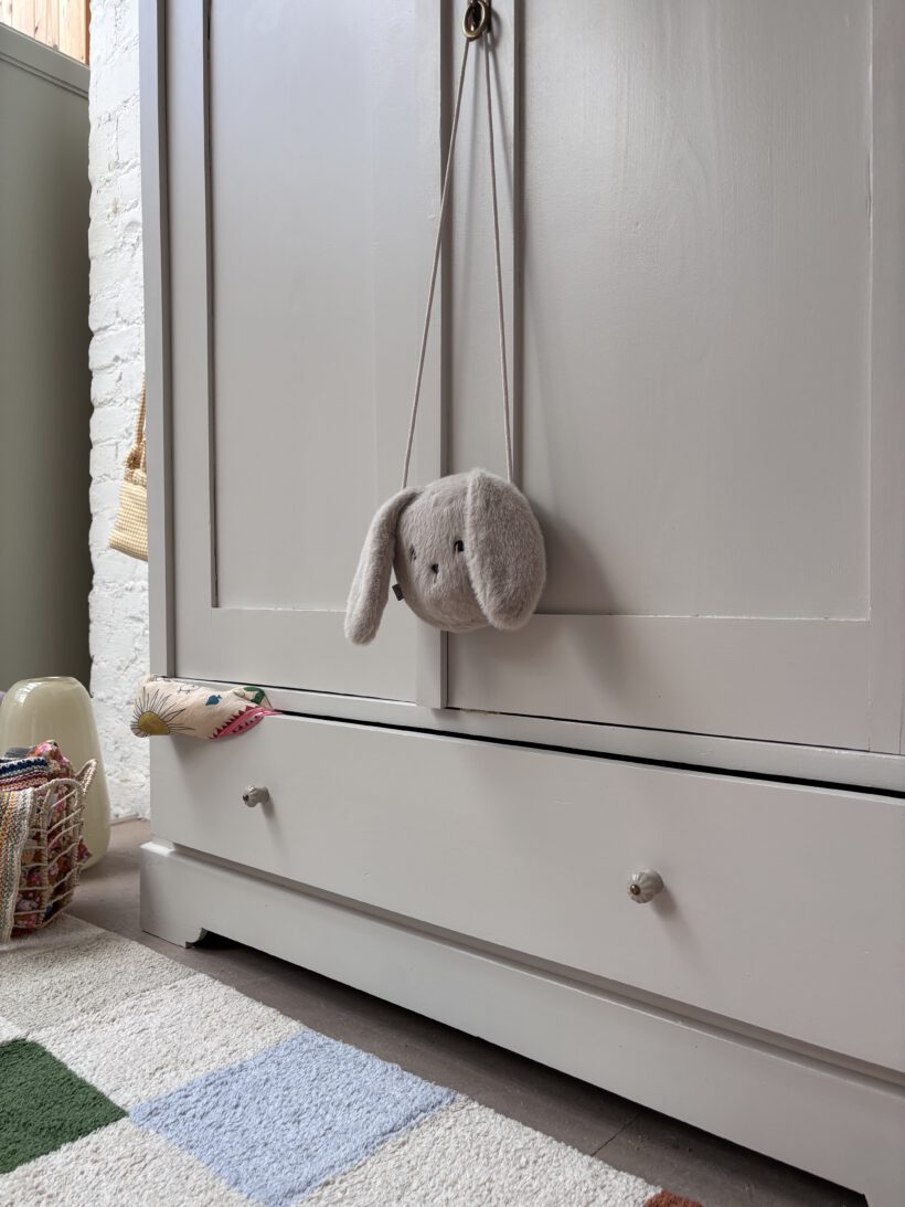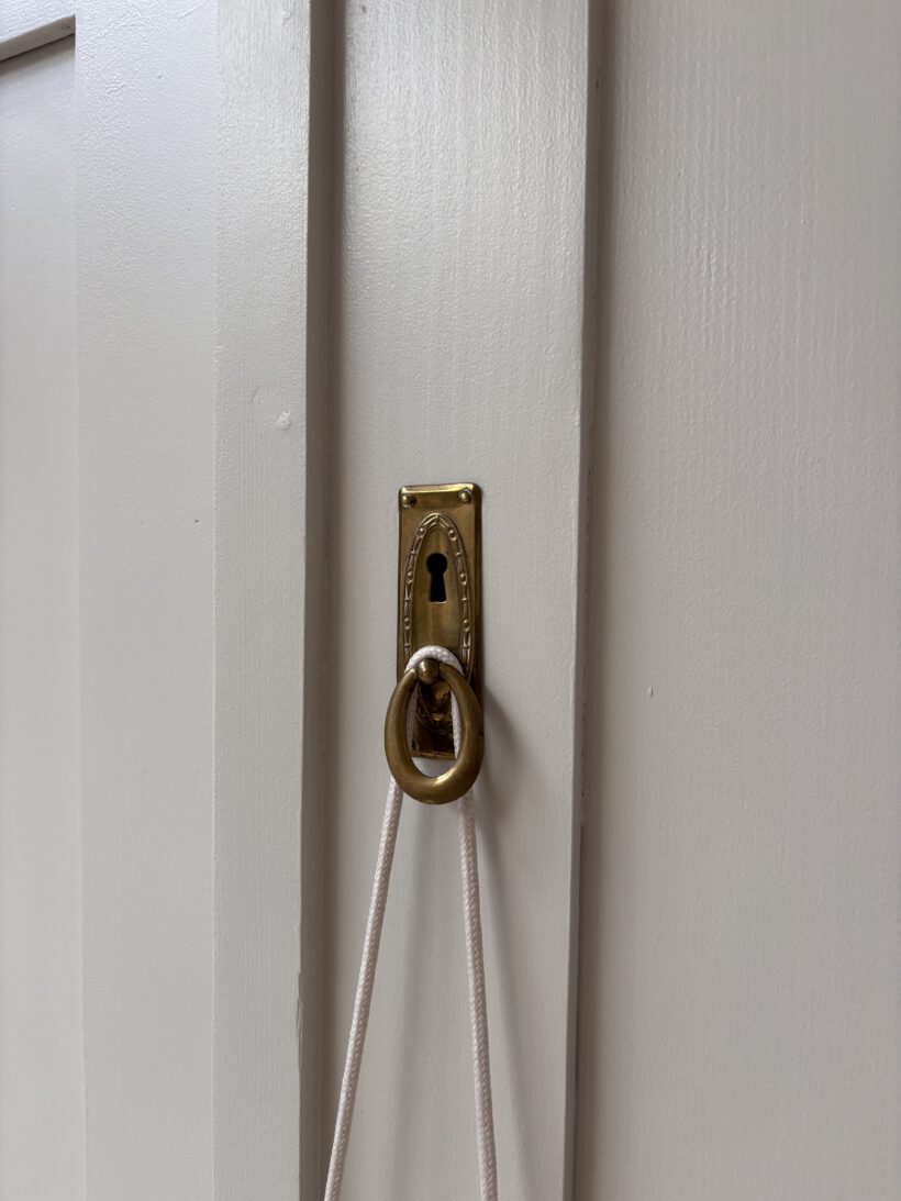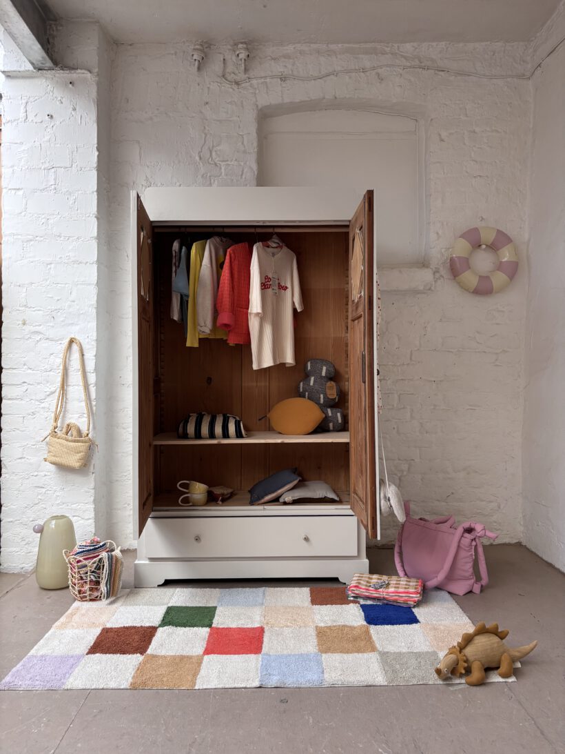 Innen hat sie von uns einen Boden und Kleiderstange bekommen. Außen ist sie in einem schlichten weiß von Farrow and Ball lackiert. Sie wurde geschliffen, grundiert und drei mal lackiert. Die dreieckigen vormals grasgrünen Fenster haben wir ersetzt durch schlichte Fenster. Die Tür schließt per Magnet, da kein Schlüssel mehr vorhanden ist.