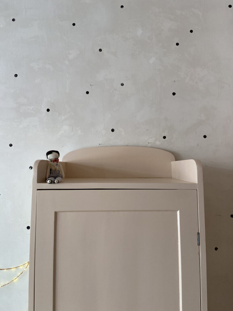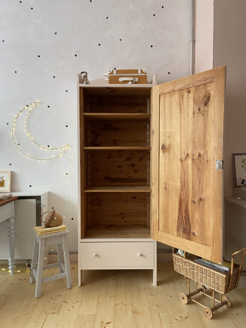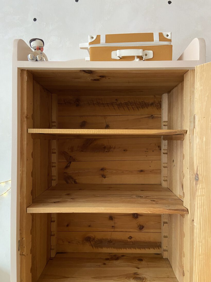 Diese hübsche antike Lady kommt aus Schweden. Sie hat ganz traumhafte Maße, denn gerade schmale Schränke gibt es selten. Agda ist gerade mal 71cm breit, dafür schön hoch und sie hat eine sehr charmante Erhöhung auf ihrem Kopf, für so manches Hübsches, was man oben aufstellen kann. Innen sind vier Fächer.