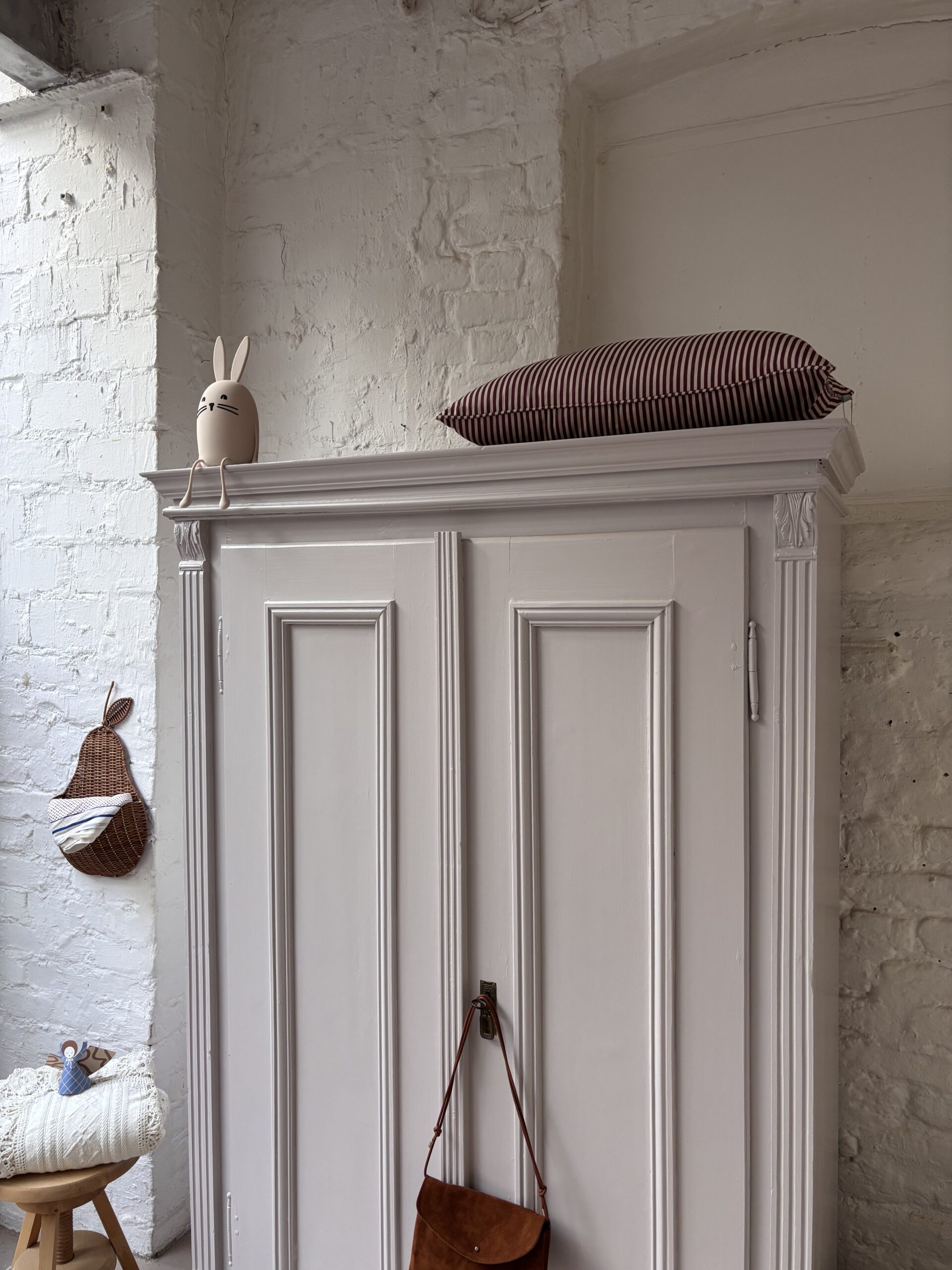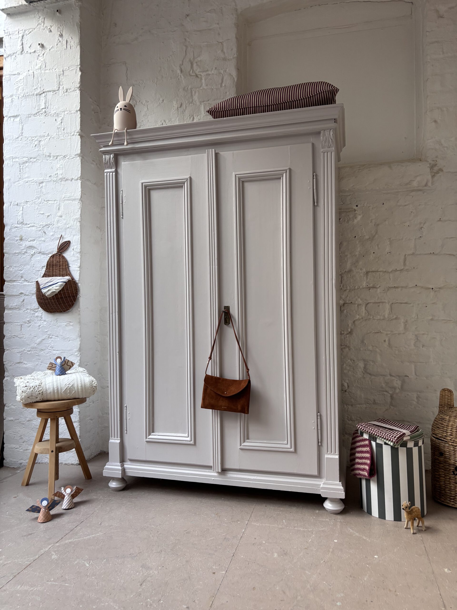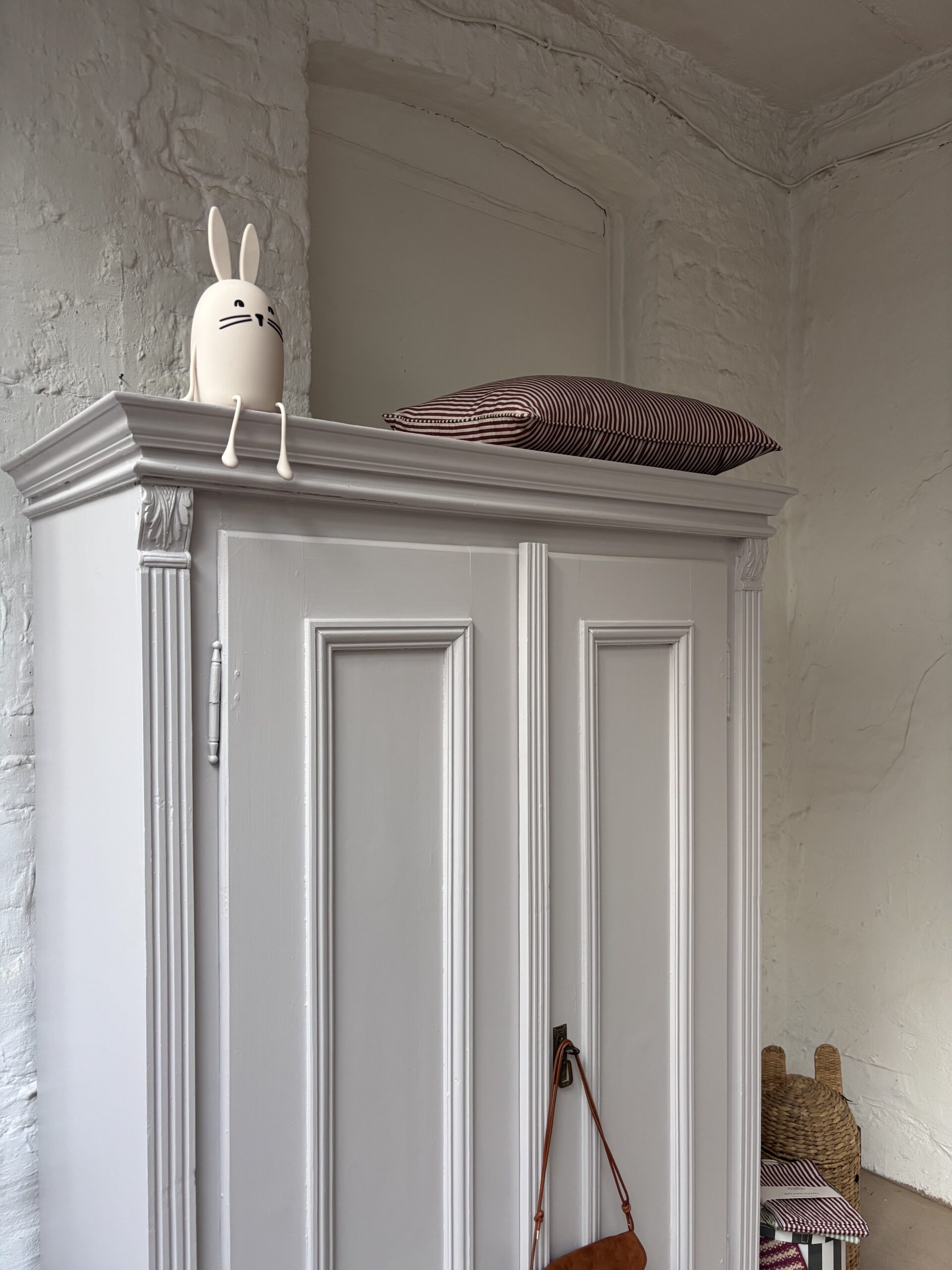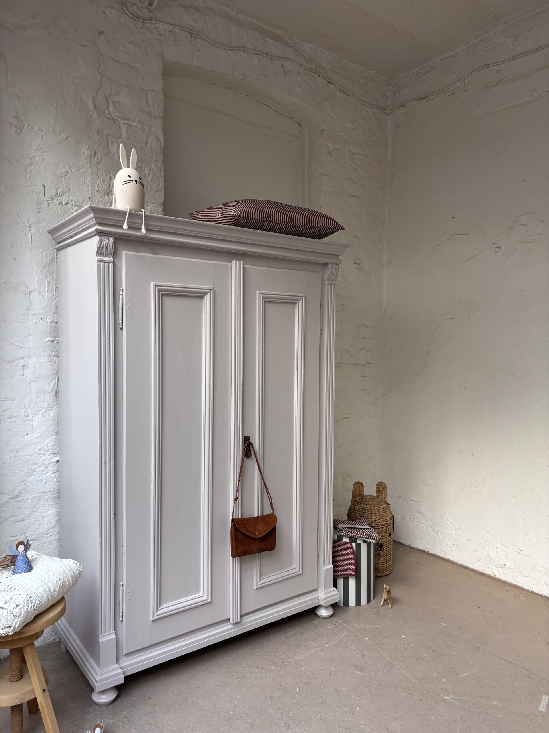 Sie fügt sich in jedem Zimmer entspannt ein und ist wunderschön. Agneta stammt aus Prag aus der Jahrhundertwende. Sie hat einfache und zeitlose Formen und dezente Verzierungen. Innen hat die von uns einen Boden und eine Kleiderstange bekommen. An ihrer Rückwand innen hinten zieren antike hacken den Schrank. Praktisch und sweet für Taschen, Schals und Co. Die Türe schließt rechts per Schlüssel, links per Hacken oben und unten.