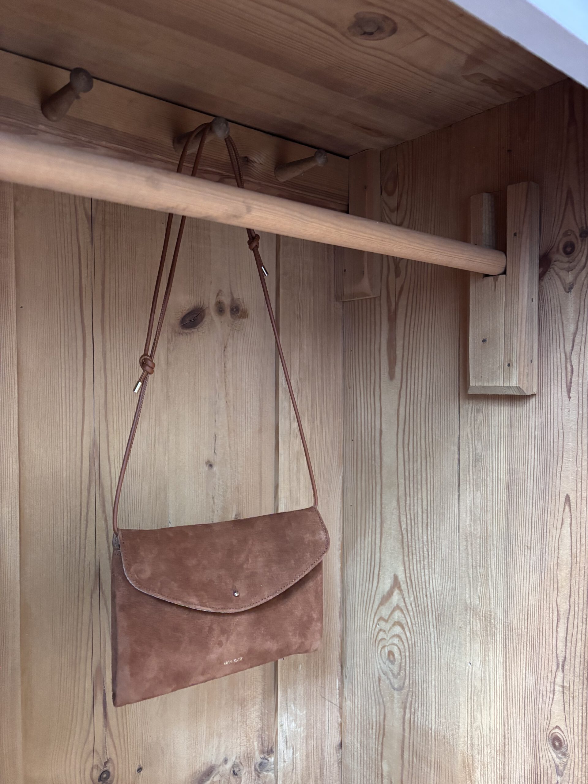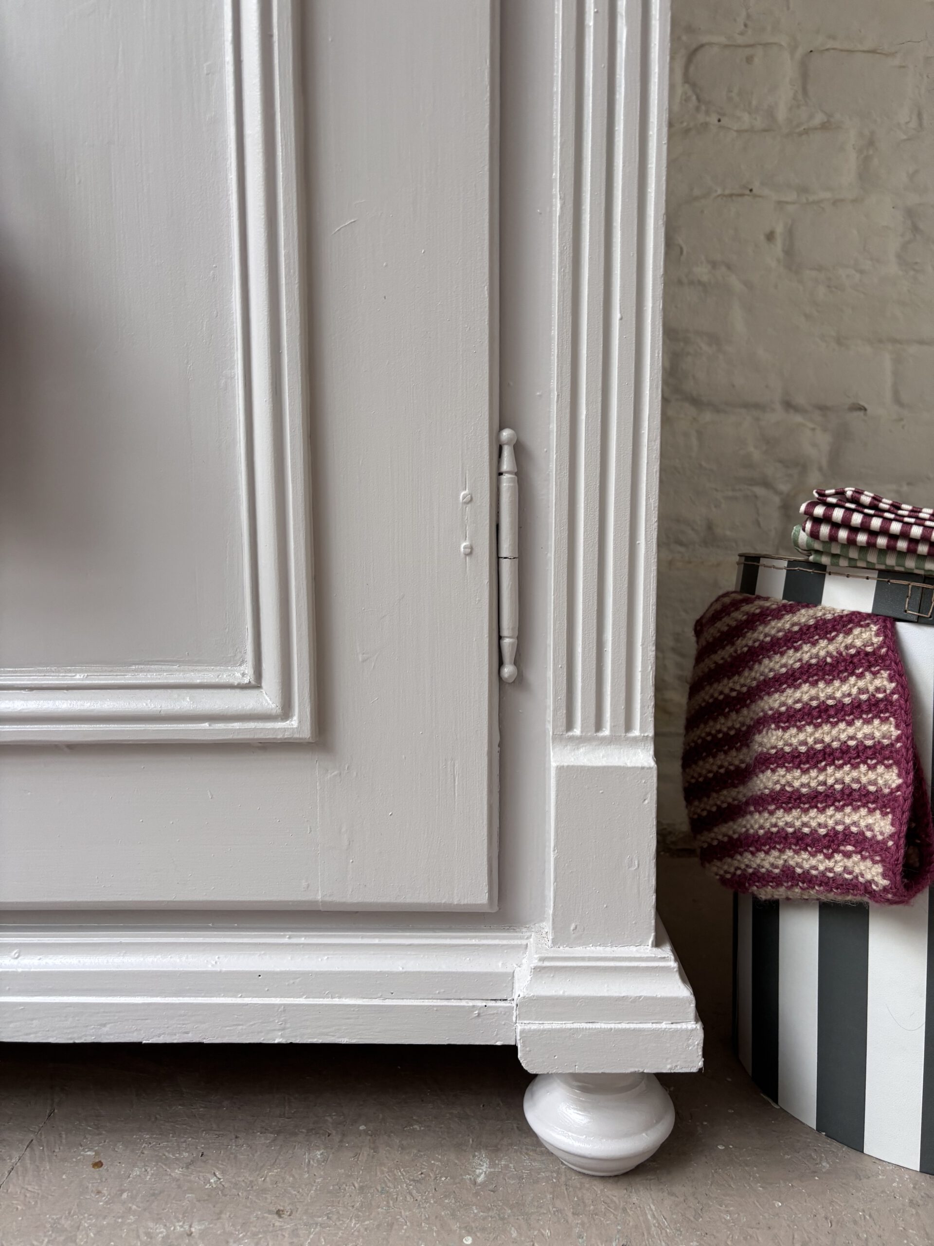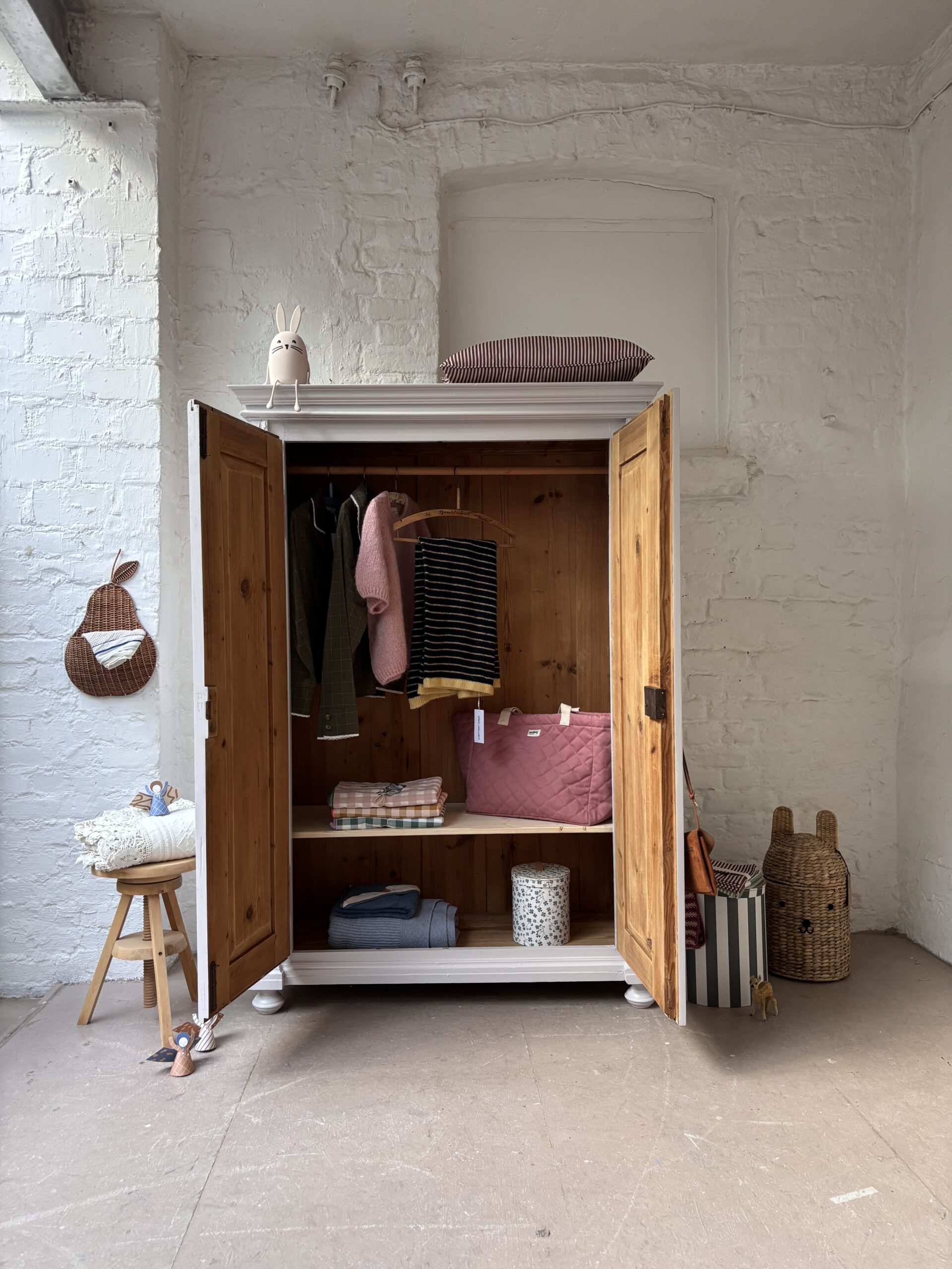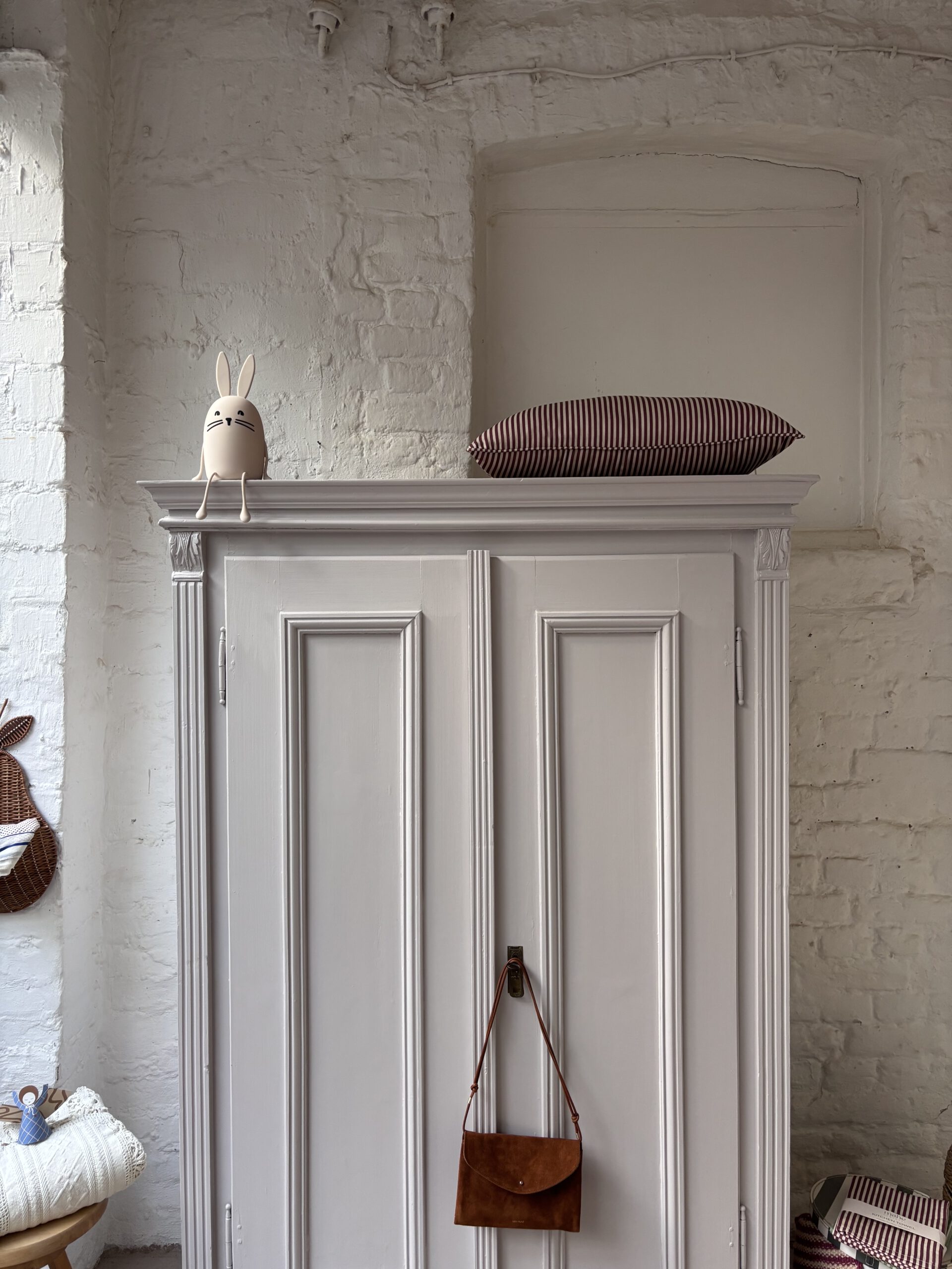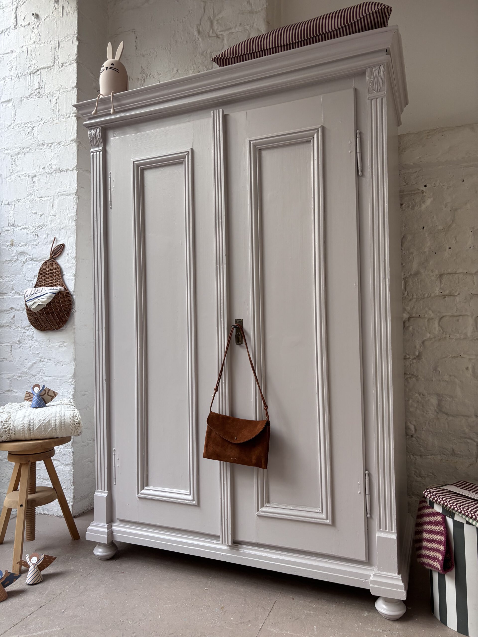 Sie fügt sich in jedem Zimmer entspannt ein und ist wunderschön. Agneta stammt aus Prag aus der Jahrhundertwende. Sie hat einfache und zeitlose Formen und dezente Verzierungen. Innen hat die von uns einen Boden und eine Kleiderstange bekommen. An ihrer Rückwand innen hinten zieren antike hacken den Schrank. Praktisch und sweet für Taschen, Schals und Co. Die Türe schließt rechts per Schlüssel, links per Hacken oben und unten.