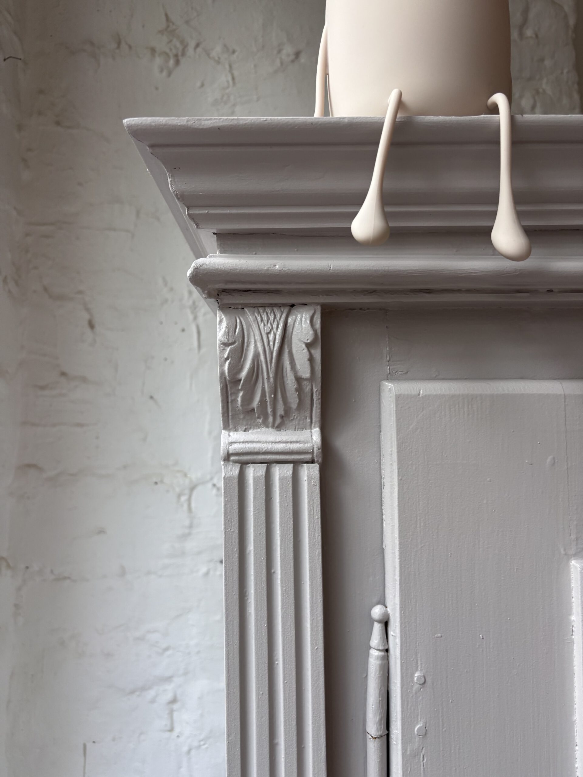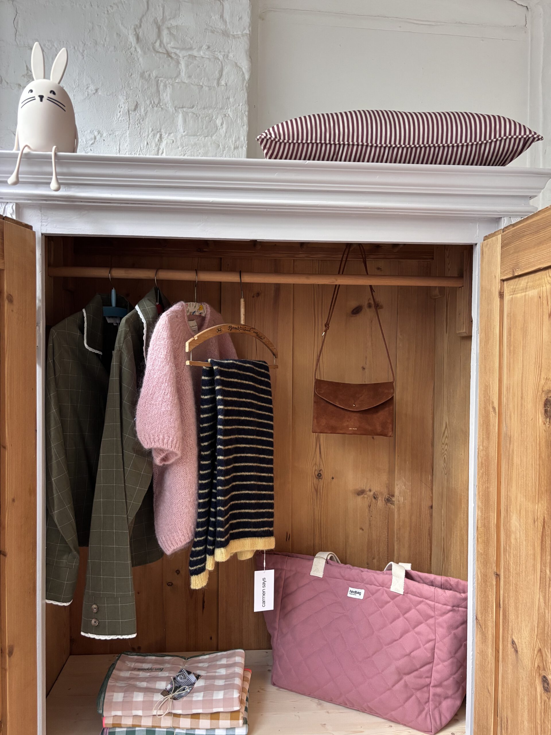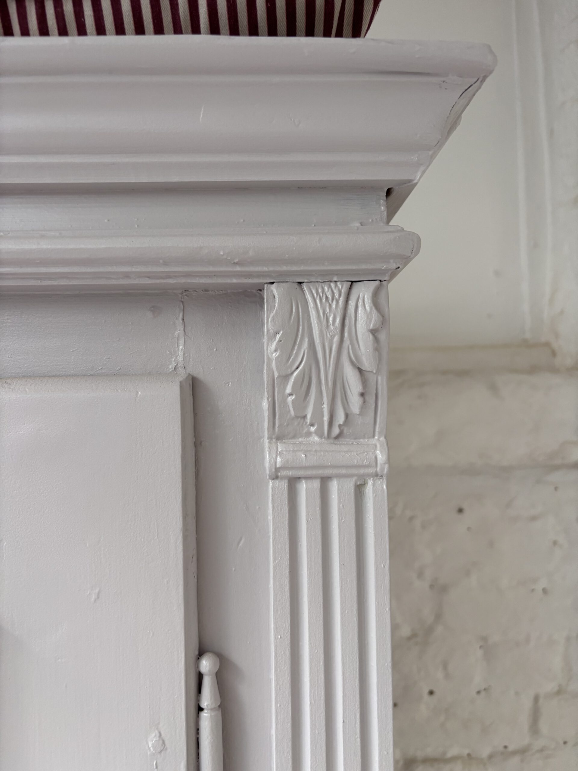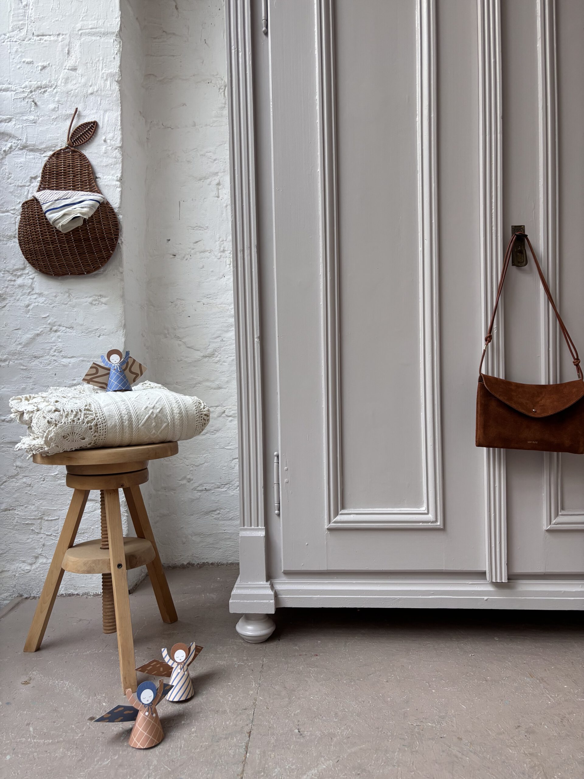 Sie fügt sich in jedem Zimmer entspannt ein und ist wunderschön. Agneta stammt aus Prag aus der Jahrhundertwende. Sie hat einfache und zeitlose Formen und dezente Verzierungen. Innen hat die von uns einen Boden und eine Kleiderstange bekommen. An ihrer Rückwand innen hinten zieren antike hacken den Schrank. Praktisch und sweet für Taschen, Schals und Co. Die Türe schließt rechts per Schlüssel, links per Hacken oben und unten.