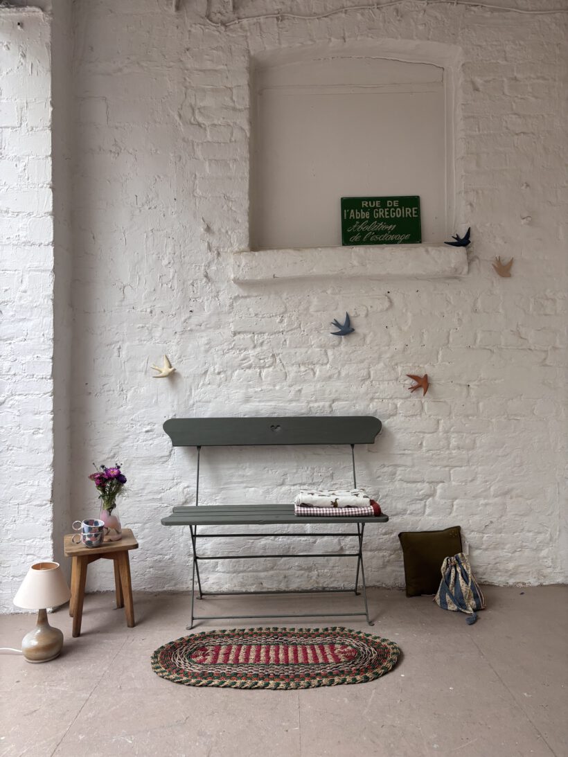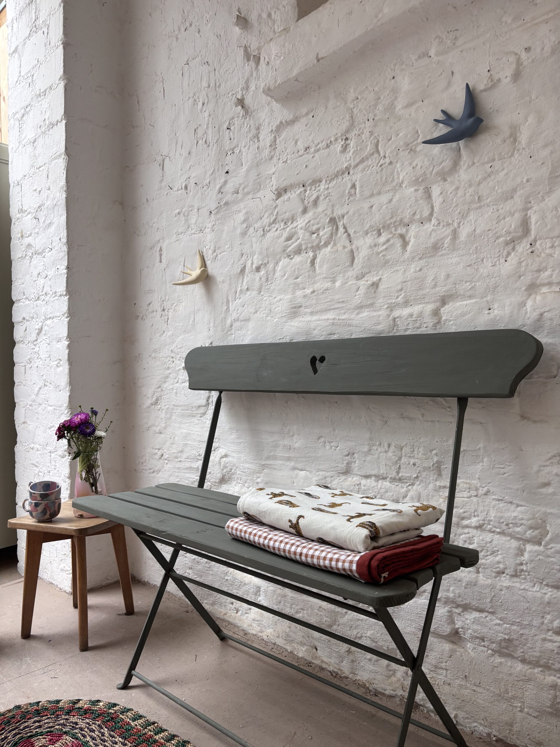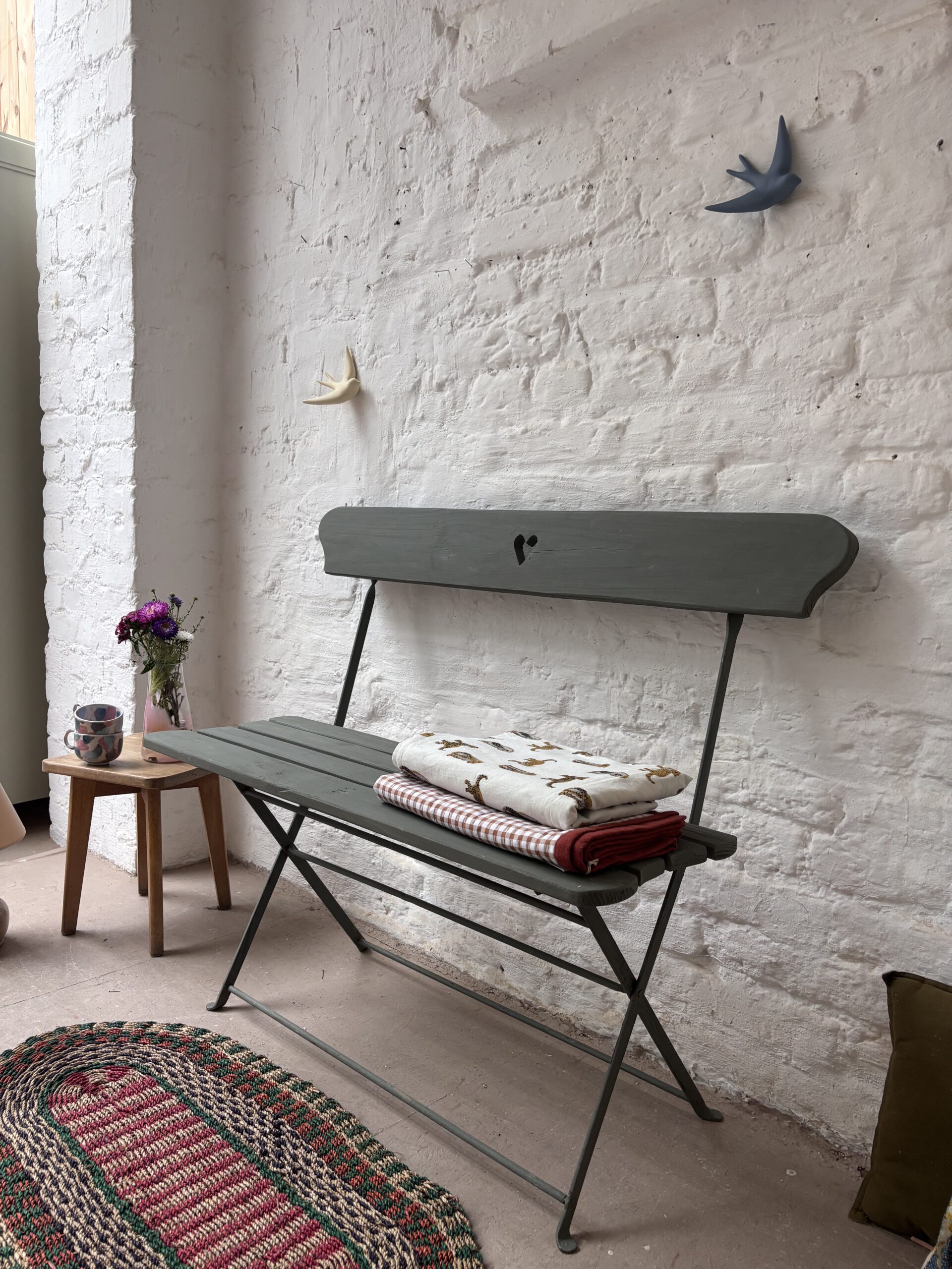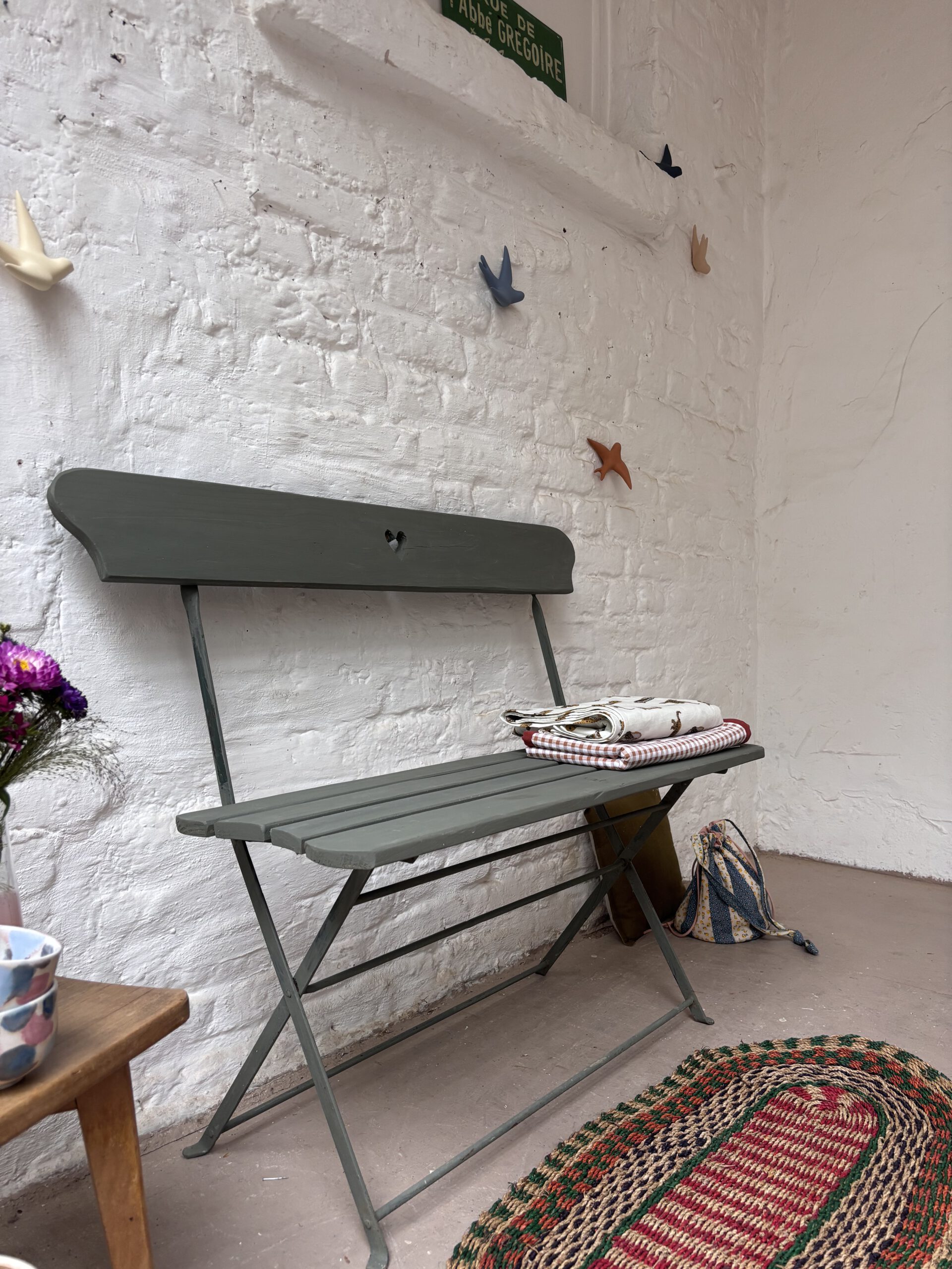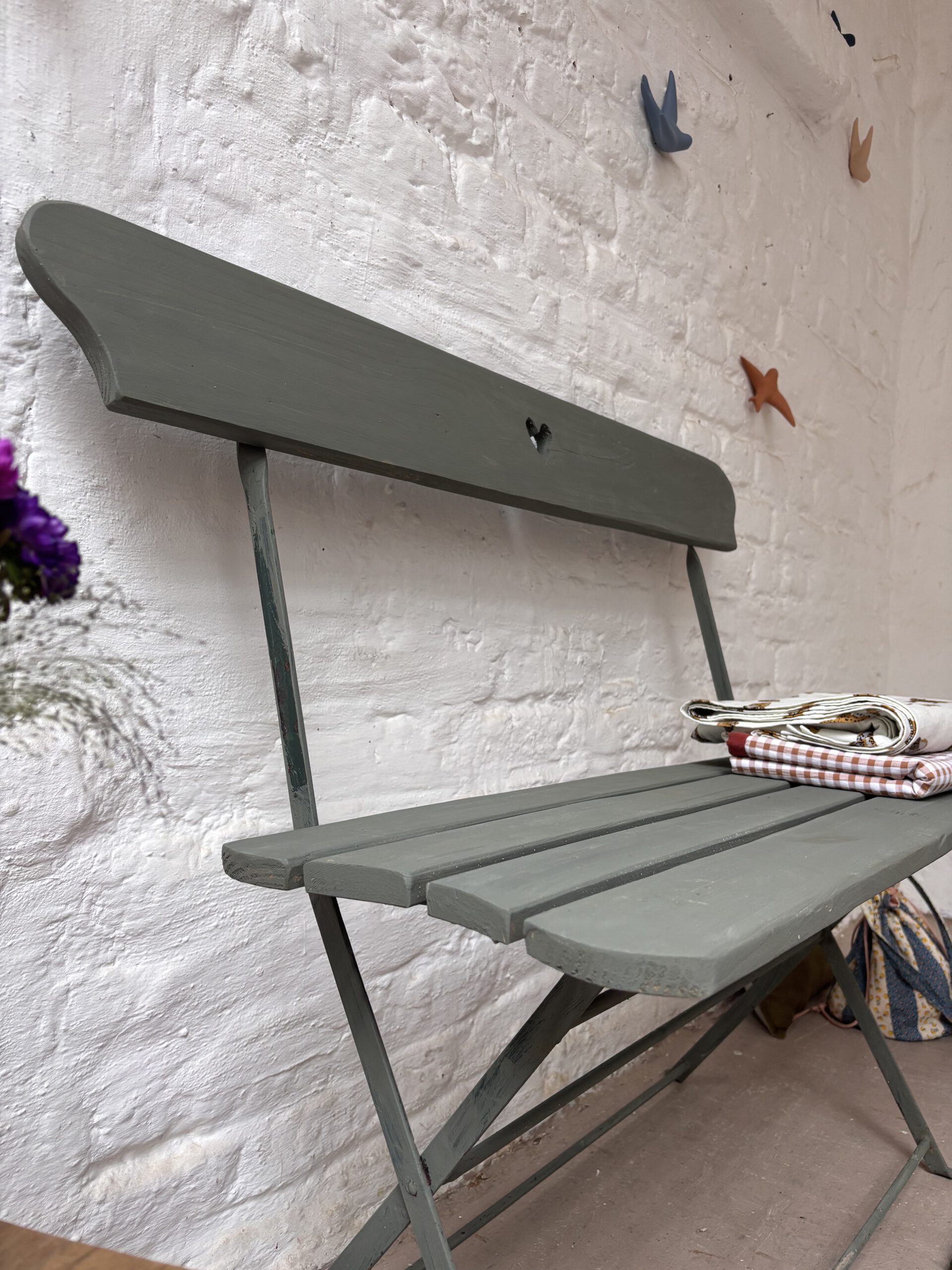 …sind zwei schöne alte Vintage Klappbänke aus Frankreich. Charmant und praktisch, denn schmal zusammenklappbar und somit easy verstaubar. Beide Bänke haben wir im Norden Frankreichs auf einem Flohmarkt entdeckt. Sie sind von uns nur gefunden, gesäubert, geliebt und fotografiert worden und sind ansonsten so geblieben, wie gefunden, weil sie so wunderschön sind. Beide haben also leichte Patina Spuren (siehe Fotos). es gibt eine grüne und eine weiße Bank. Sie werden als separates Produkt aufgeführt.
