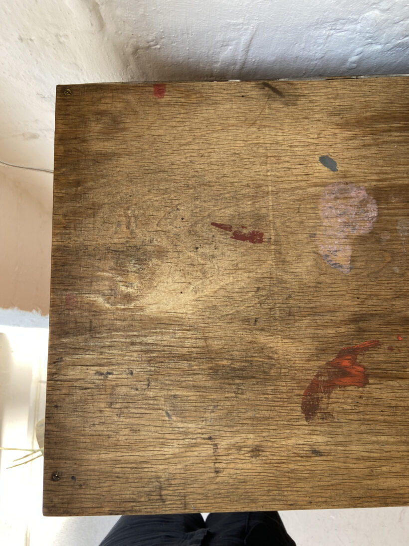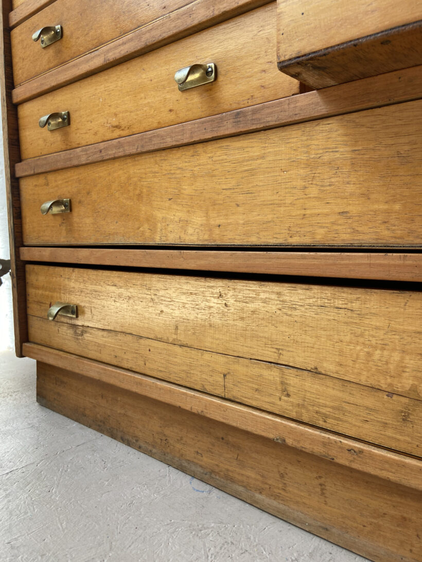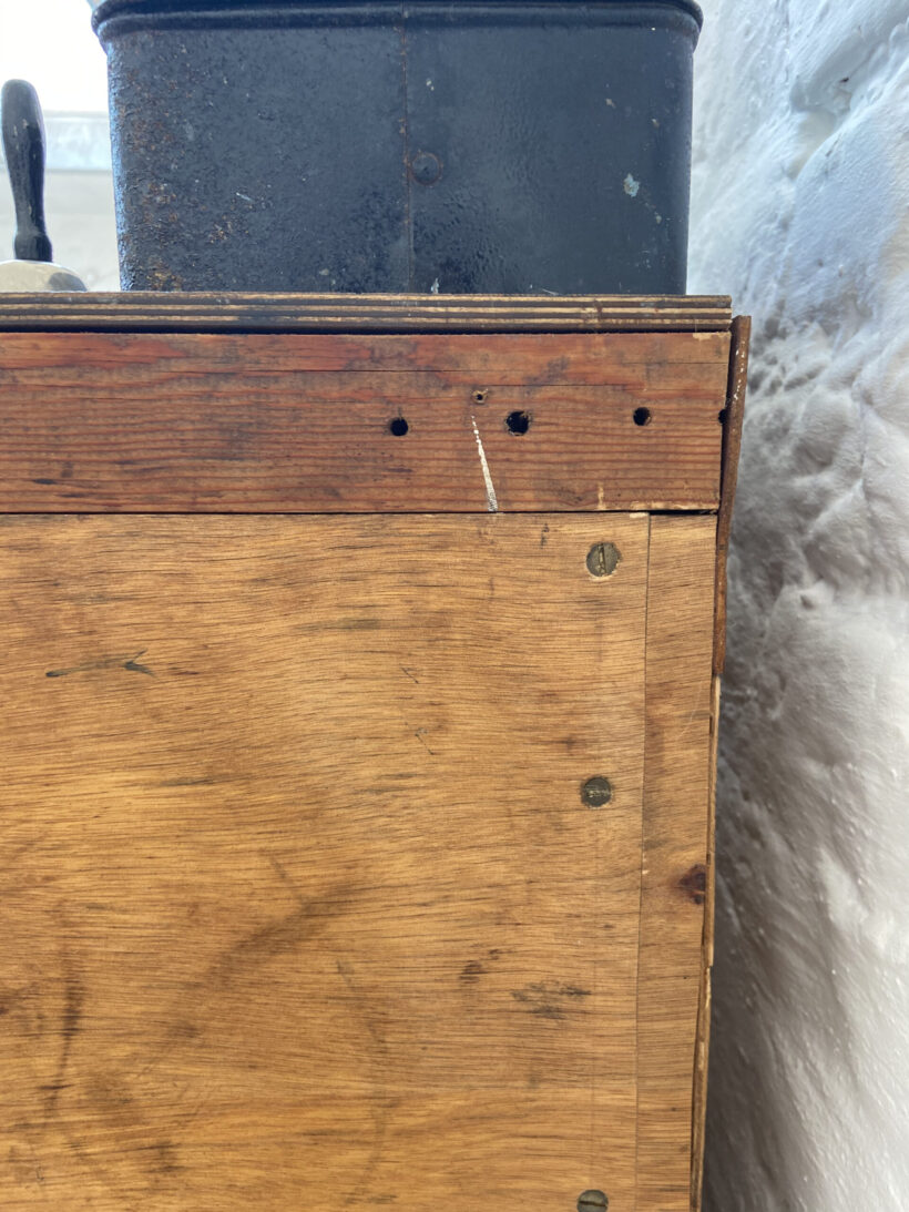 Von uns hat er eine kleine Formauffrischung bekommen. Wir haben die Seiten feiner zugeschnitten, so dass er Wohnzimmer Charakter hat. Er wurde geputzt und poliert und frisch mit Leinöl versiegelt. Seine natürliche Patina haben wir erhalten (siehe Fotos), denn das macht ihn so einzigartig. Die untere Schubladen hat einen Riss, der natürlich verleimt wurde;-)