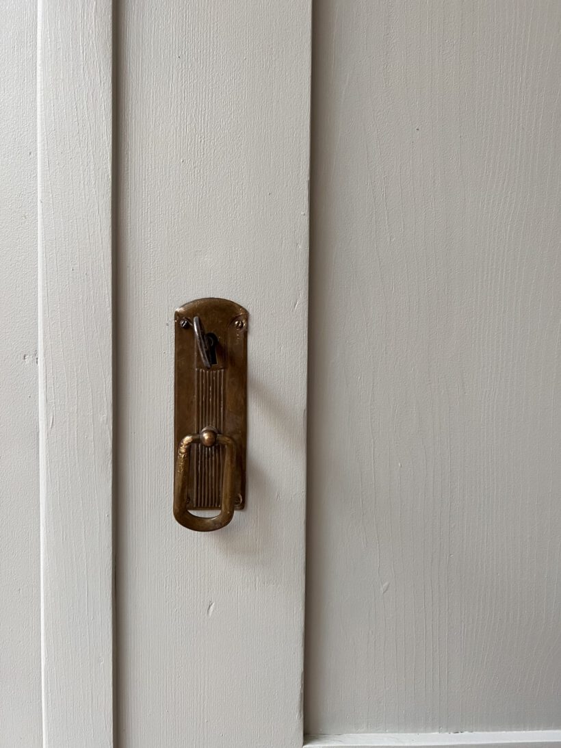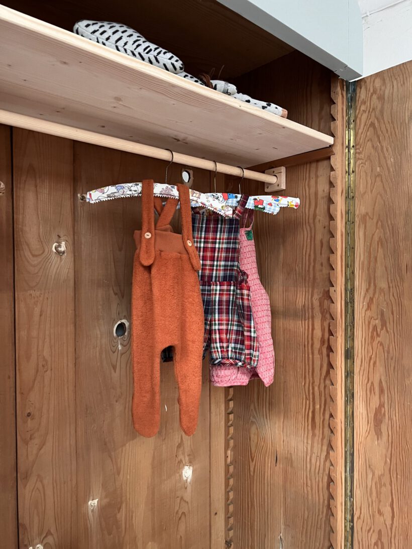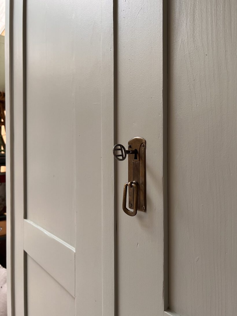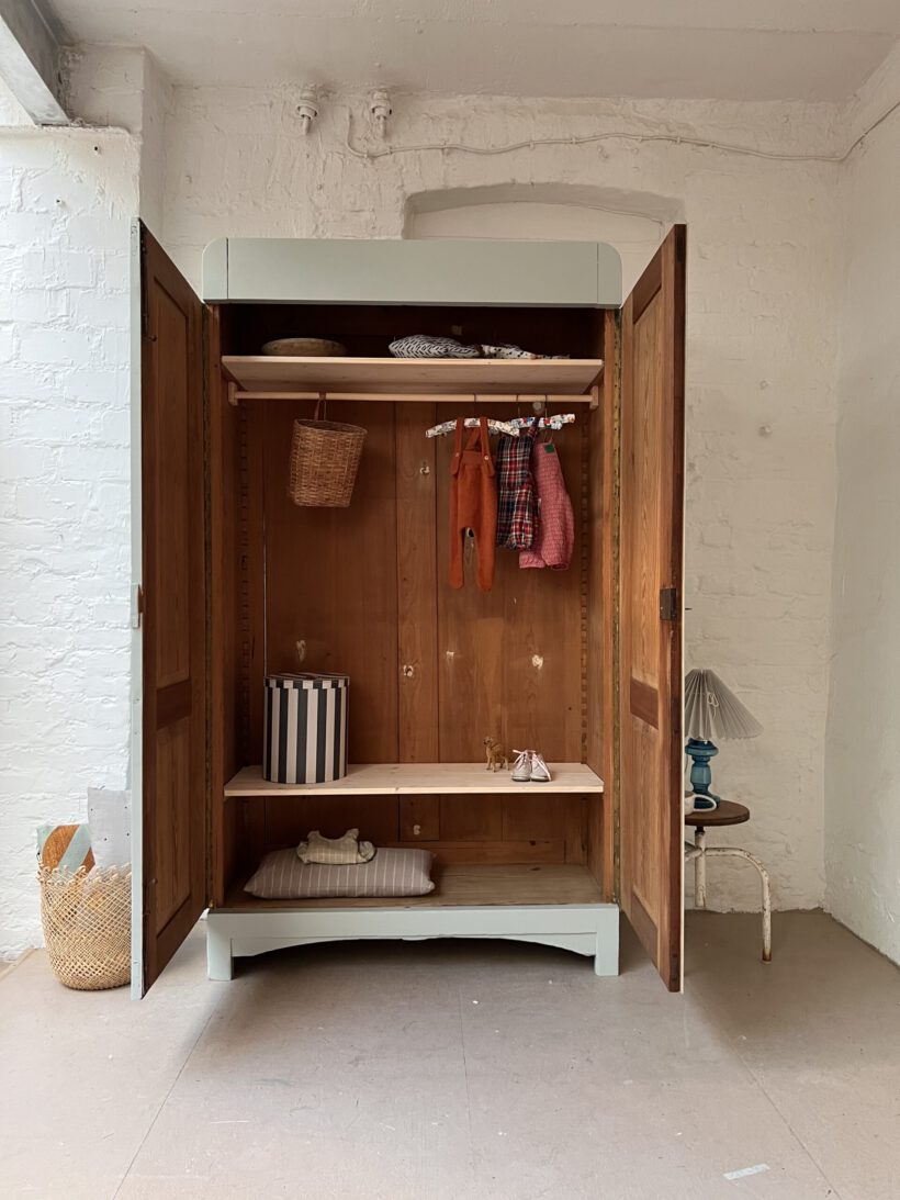 ist ein wunderschöner hoher zeitloser antiker Schrank aus der Gründerzeit. Er ist schlicht, klar und zugleich besonders. Die Höhe und Größe bietet unglaublich viel Stauraum. Innen ist für damals typisch eine Vorrichtung für versetzbare Regalböden. Man kann ihr Höhe beliebig einstellen. Die Originalböden waren nicht mehr vorhanden, deshalb haben wir zwei Böden und eine Kleiderstange eingesetzt. Einen Boden oberhalb der Kleiderstange einen darunter. Dieses Innenleben noch beliebig ausbaubar: https://tutuettata.de/product/einlegeboeden/