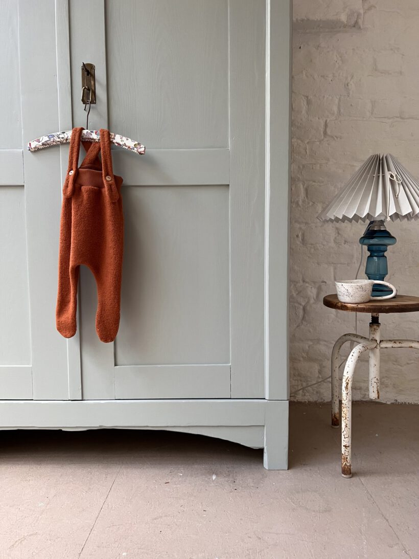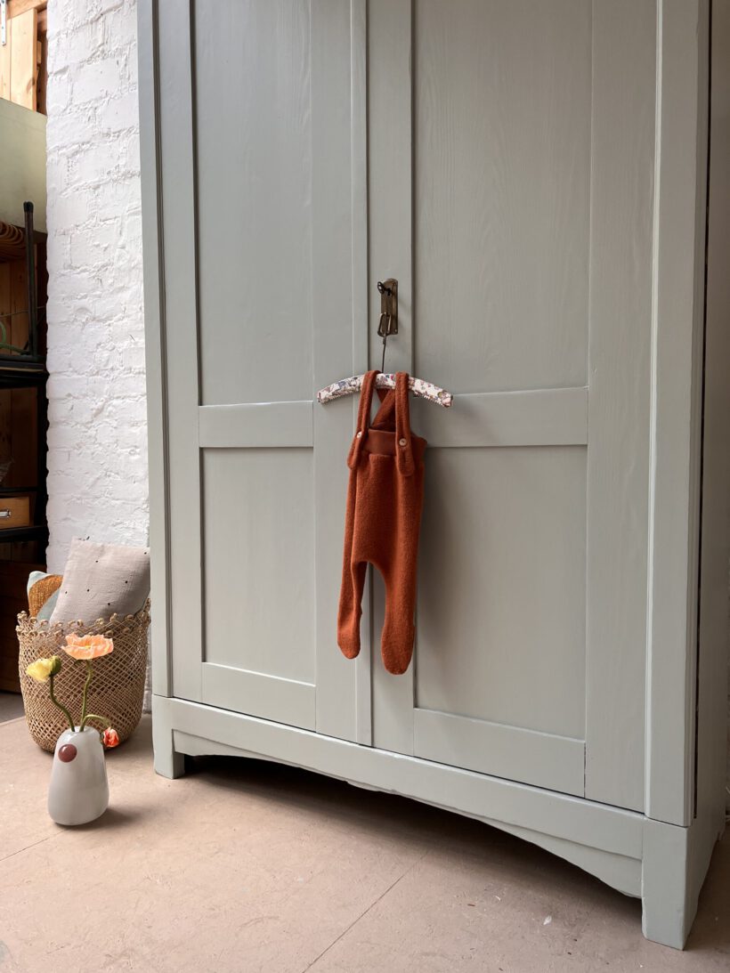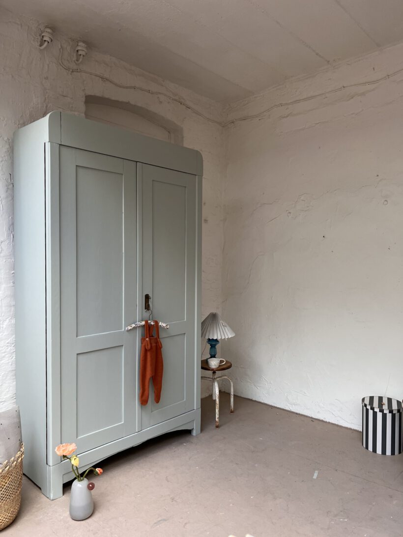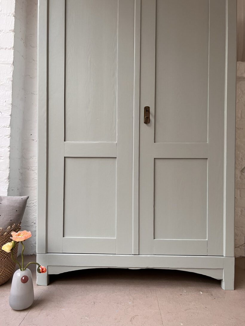 Wir haben Anselm in ein schönes helles blaugrau von Farrow and Ball getaucht. Anselm wurde restauriert, repariert, geschliffen, grundiert und zwei Mal lackiert.