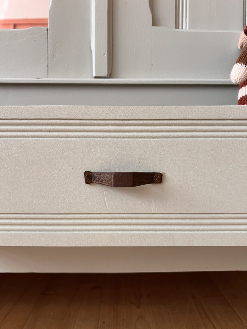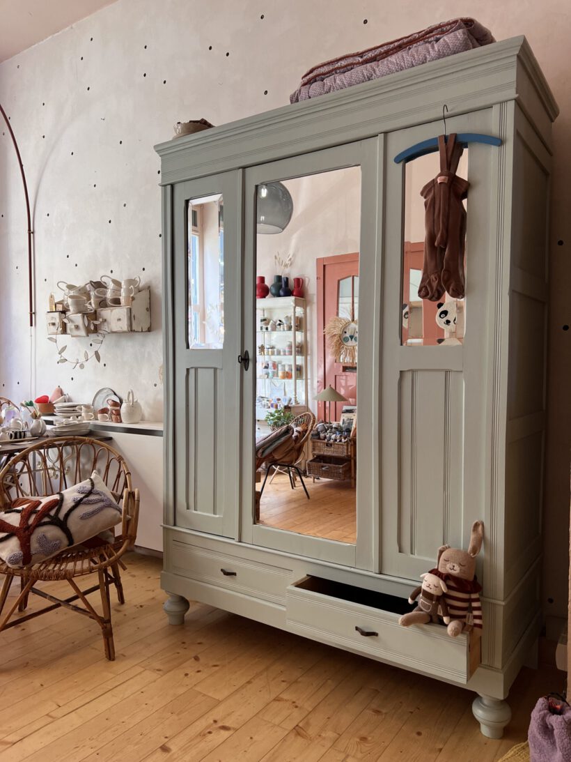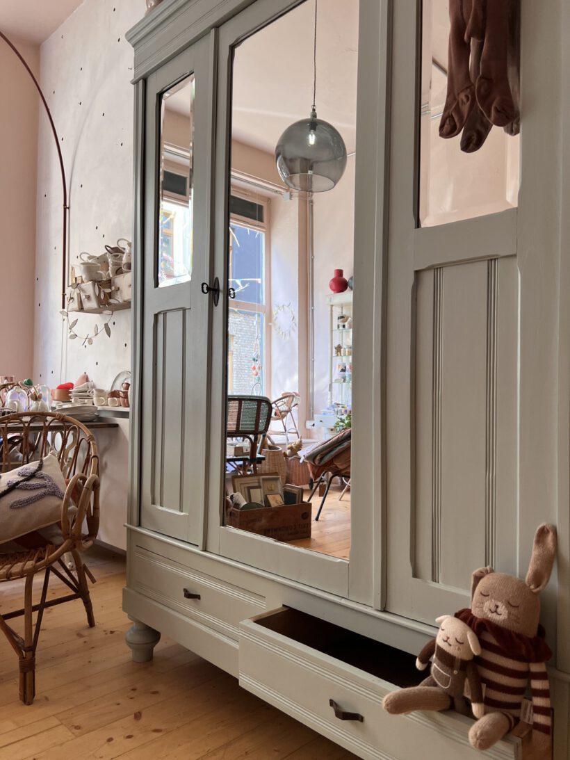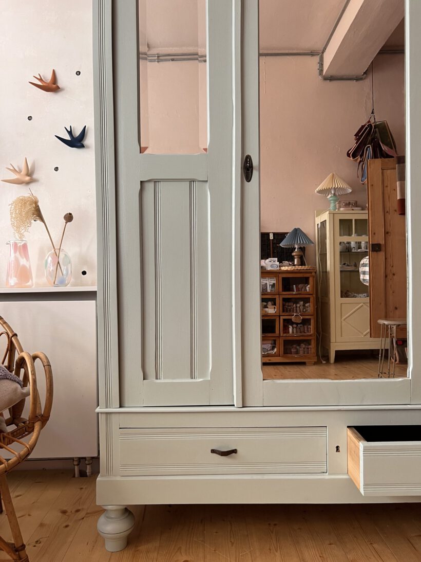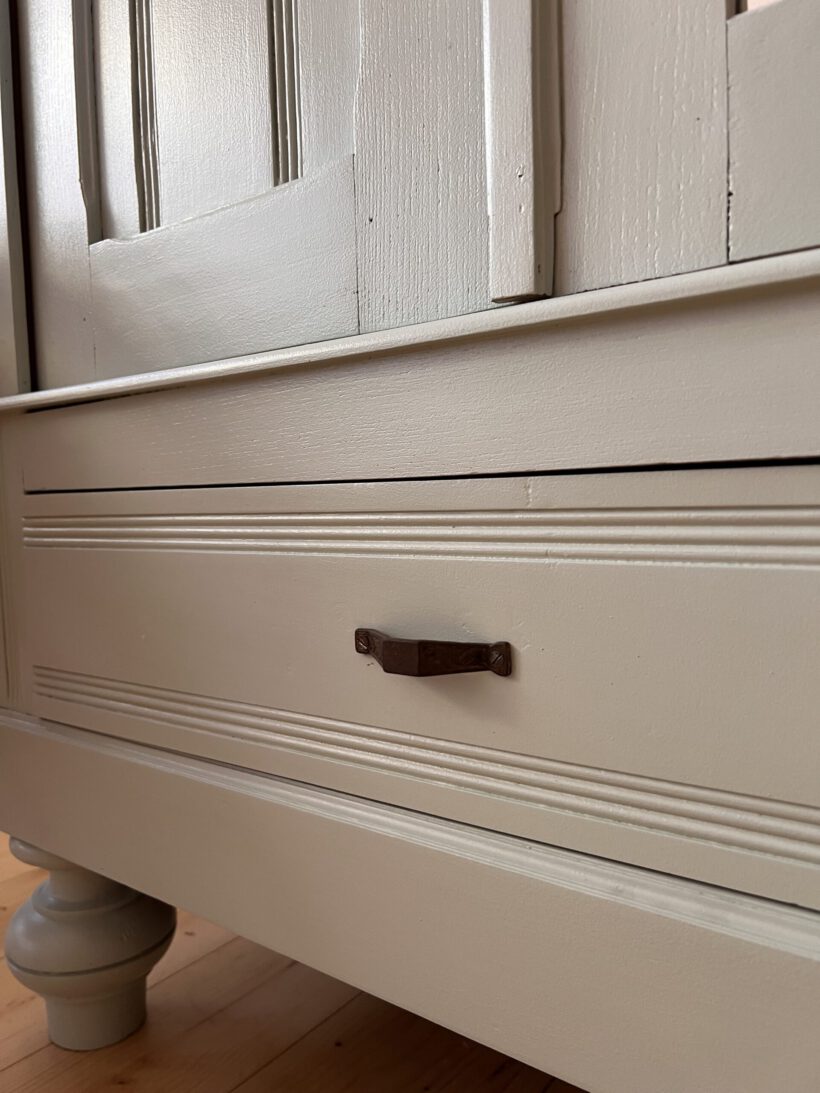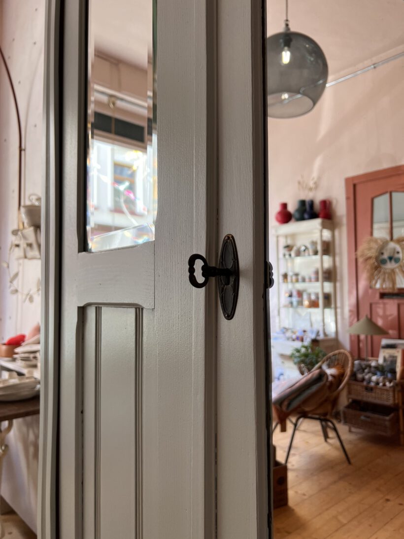 Antoine ist ein antiker Jugendstil-Steckschrank aus Eiche. Mit seinen geradlinigen Formen, Kastentüren, Spiegeln und Streifenverzierungen legt sich Antoine so richtig ins Zeug und ist einfach nur zum Verlieben. Antoine hat drei Türen, davon ist die Tür rechts feststehend. Die mittlere und linke Tür öffnen einwandfrei. Tatsächlich hatte Antoine, wie üblich für diese Art von Schränken sogar zwei feststehende Türen und nur die mittlere ließ sich öffnen. Da wir dies weniger praktisch finden, haben wir die linke mit Scharnieren versehen und tadaa…sie ist jetzt nicht mehr nur hübsch anzusehen, sonder lässt sich auch öffnen. Nun kommt man gut an alle verstauten Sachen ran ohne im Schrank suchen zu müssen;-)