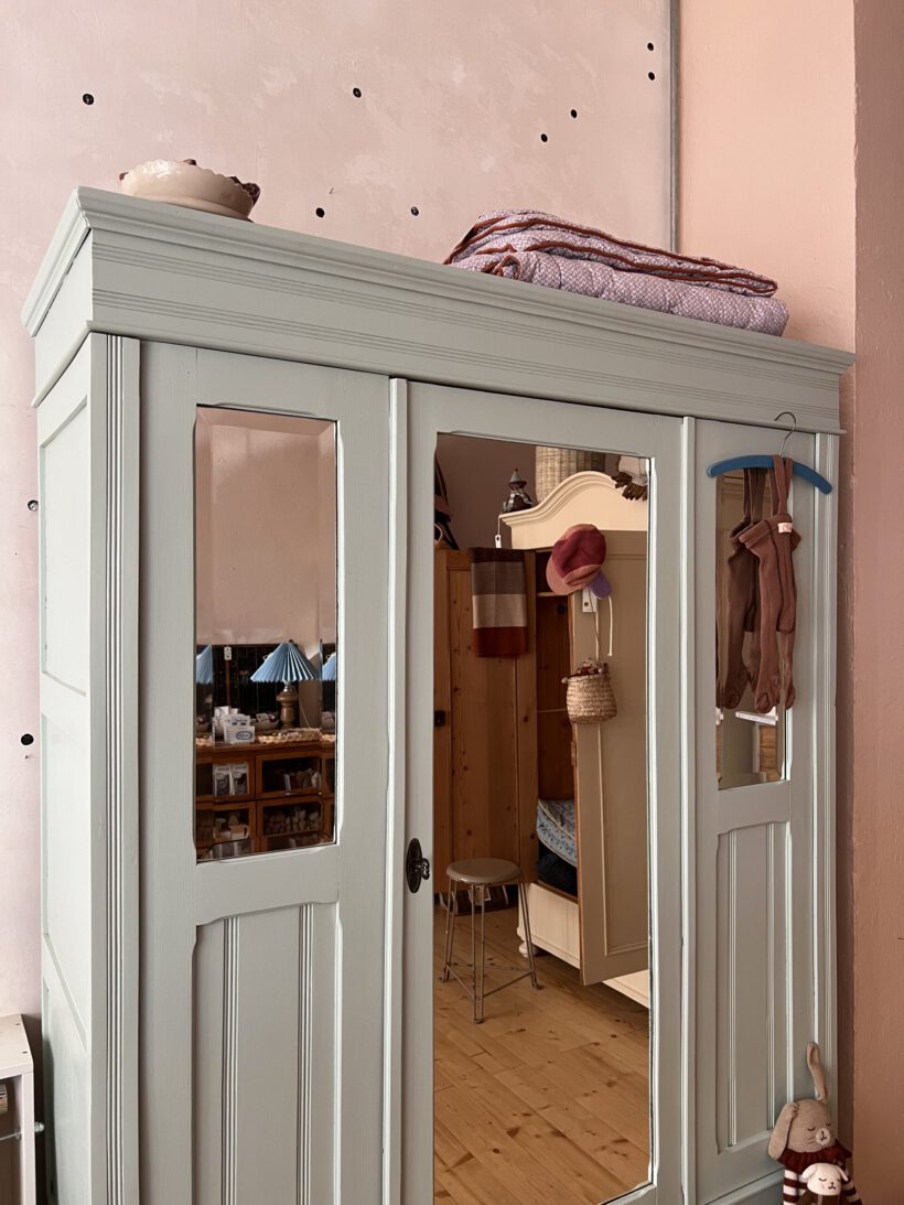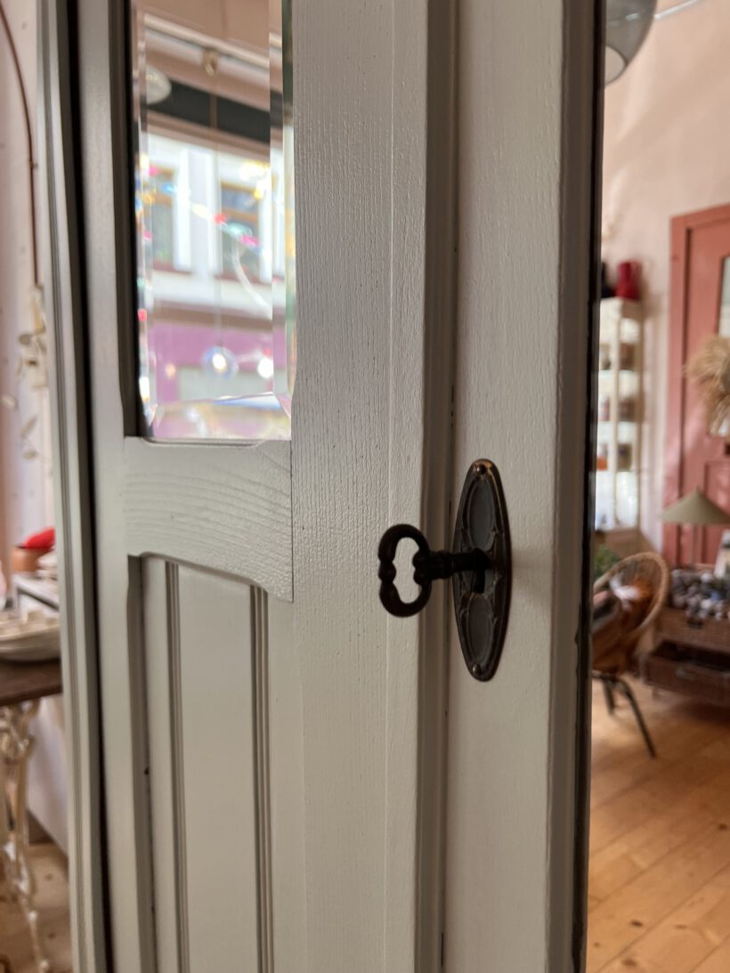 Innen hat Antoine von uns einen Boden bekommen und er hat eine Kleiderstange. Er bietet sehr viel Stauraum. Der Schlüssel funktioniert einwandfrei. Die kleinen Spiegel sind noch original erhalten, der Große musste ersetzt werden.
