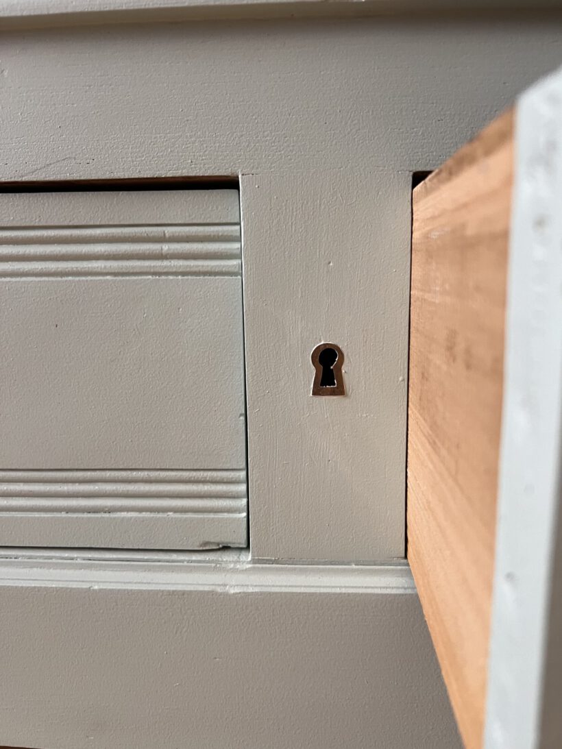 Antoines Rückwand und das Dach sind aus Weichholz und hattenmal Holzwurm, was anhand der Löcher erkennbar ist. Keine Sorge, der Wurm ist antik. Wir haben ihn beobachtet und sind uns zu 99% sicher, dass da kein aktiver Wurm ist. Die meisten alten Schränke haben Wurmlöcher, es ist ein gutes Zeichen: ein Indiz für die Antiquität und dafür das keine Giftstoffe im Holz verwendet wurden.
