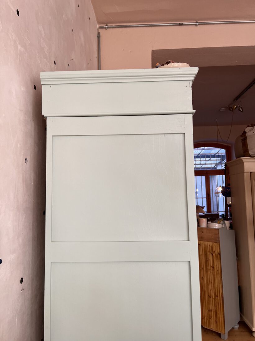 Wir haben Antoine außen eine neue Farbe geschenkt, er ist restauriert, grundiert und zwei mal lackiert in einem wunderschönen mint von Farrow and Ball Farben.