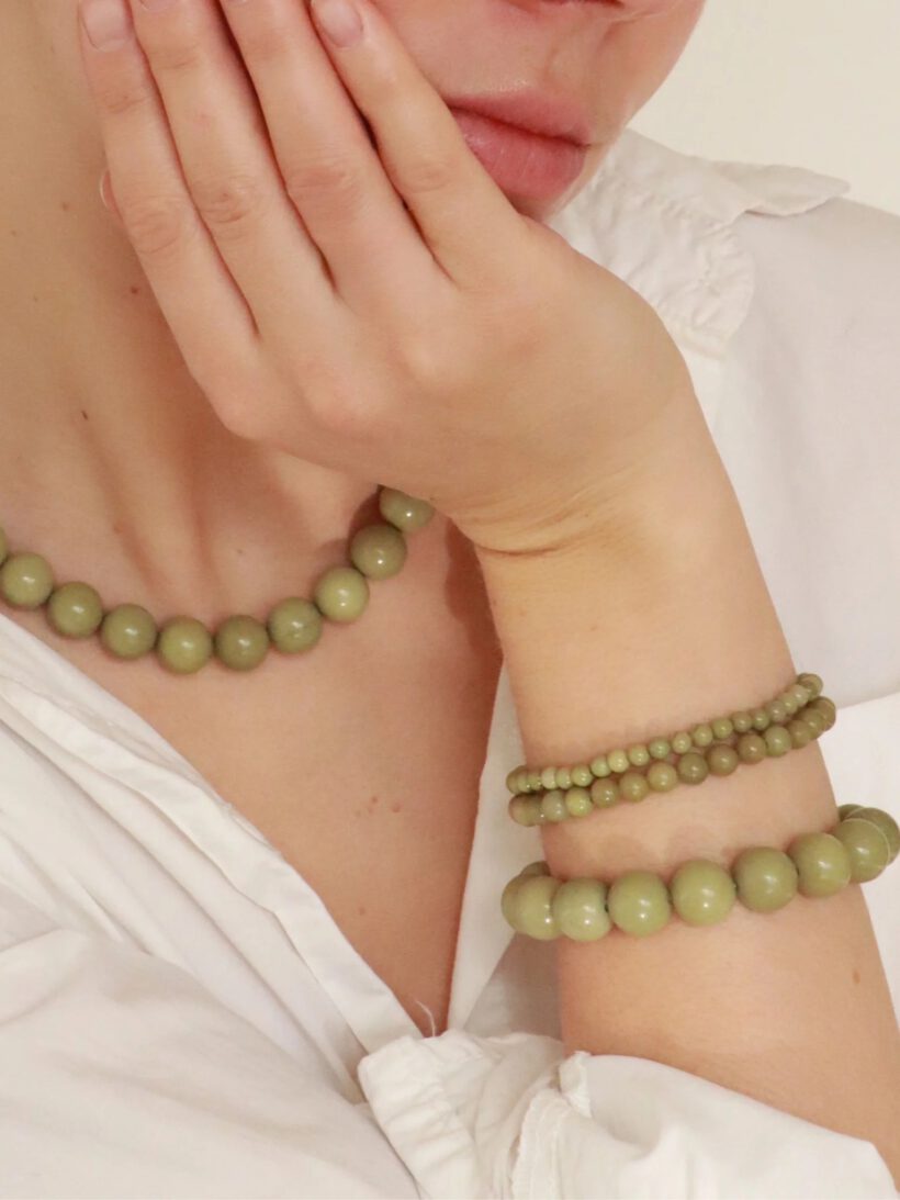 Das Armband aus grünem Jade-Kristall wurde geschaffen, um Ihnen dabei zu helfen, Ihr Gleichgewicht zu finden, Ihr Glück zu steigern und Ihr Wohlbefinden zu verbessern.Die wunderschöne grüne Jade steht für Ausgeglichenheit und positive Energie. Das mit Sorgfalt und Präzision gefertigte Armband ist mehr als nur ein Schmuckstück – es ist Ausdruck natürlicher Schönheit und innerer Ruhe.