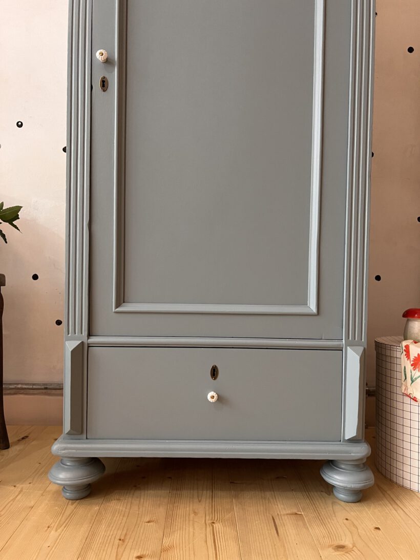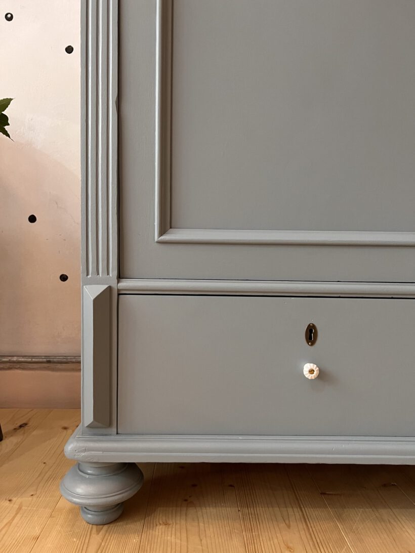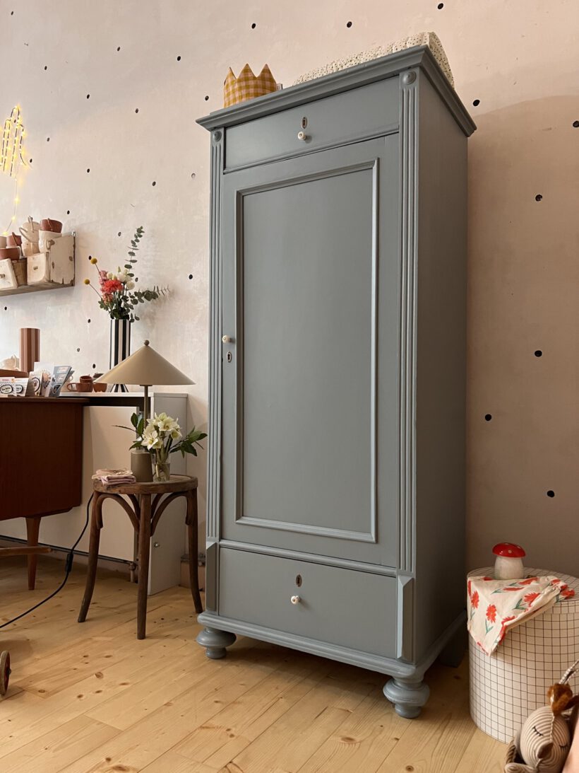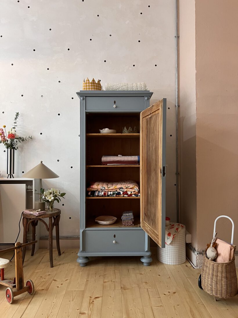 unser kleiner Liebling unter den neuen Schränken. Wir finden Benno einfach unglaublich entzückend. Benne´s Look, die Größe, die zwei Schubladen die schmalen Maße, die Farbe, alle diese Komponenten machen in ganz besonders. Zudem bringt er ne ganze Menge Charme mit – er ist über 100 Jahre alt und immer noch ein Hingucker. Innen hat er vier Legefächer. Außen haben wir Benno in ein neues wunderhübsches blau getaucht von Anna von Mangold Farben. Wir sind verliebt!