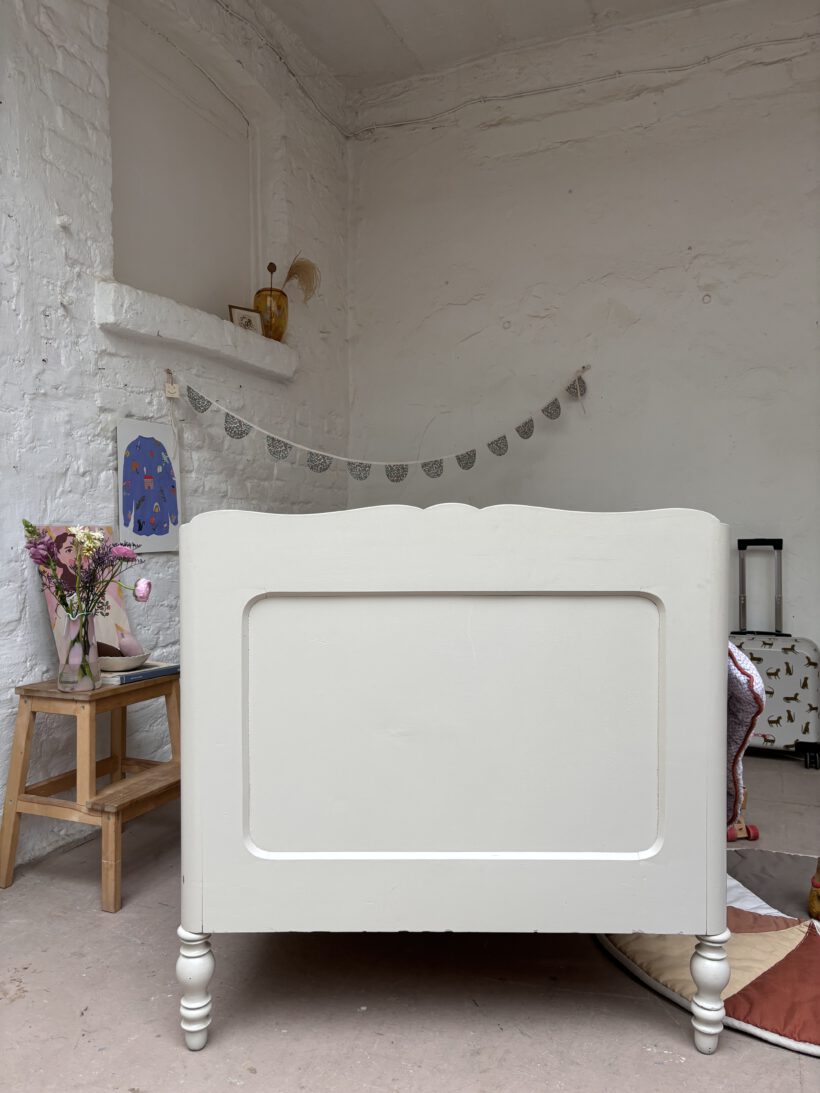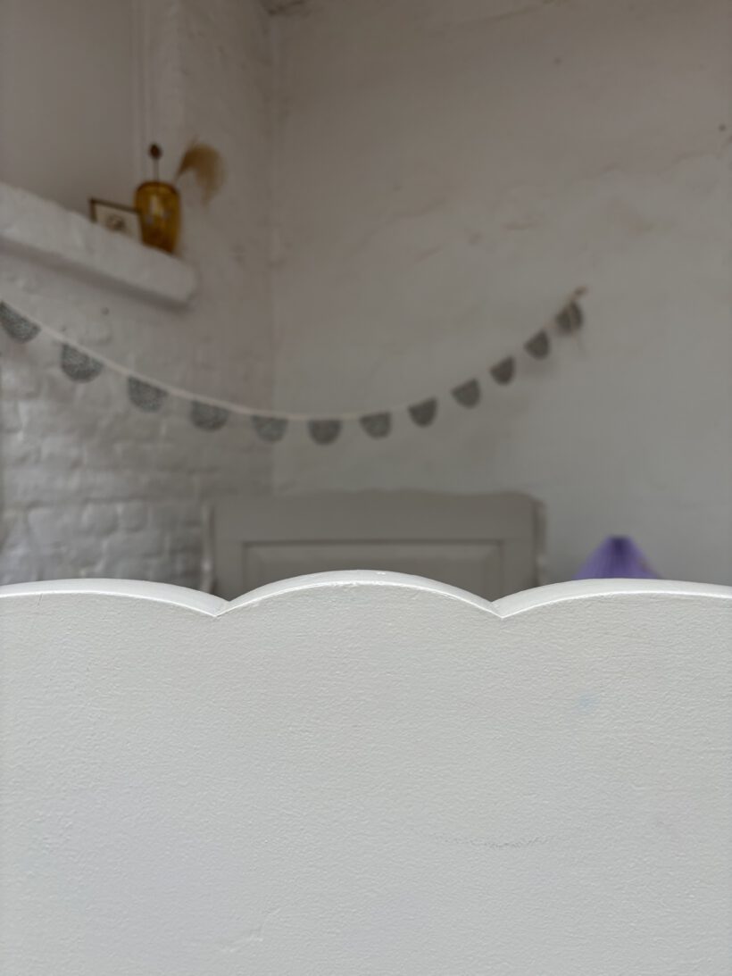 Wir haben Selma restauriert, geschliffen, grundiert und zwei Mal lackiert in einem wunderschönen warmen grau von Farrow and Ball. Selmas Holz ist typisch für die zeit furniert. Das Furnier hat ein paar charmante Spuren der Zeit.