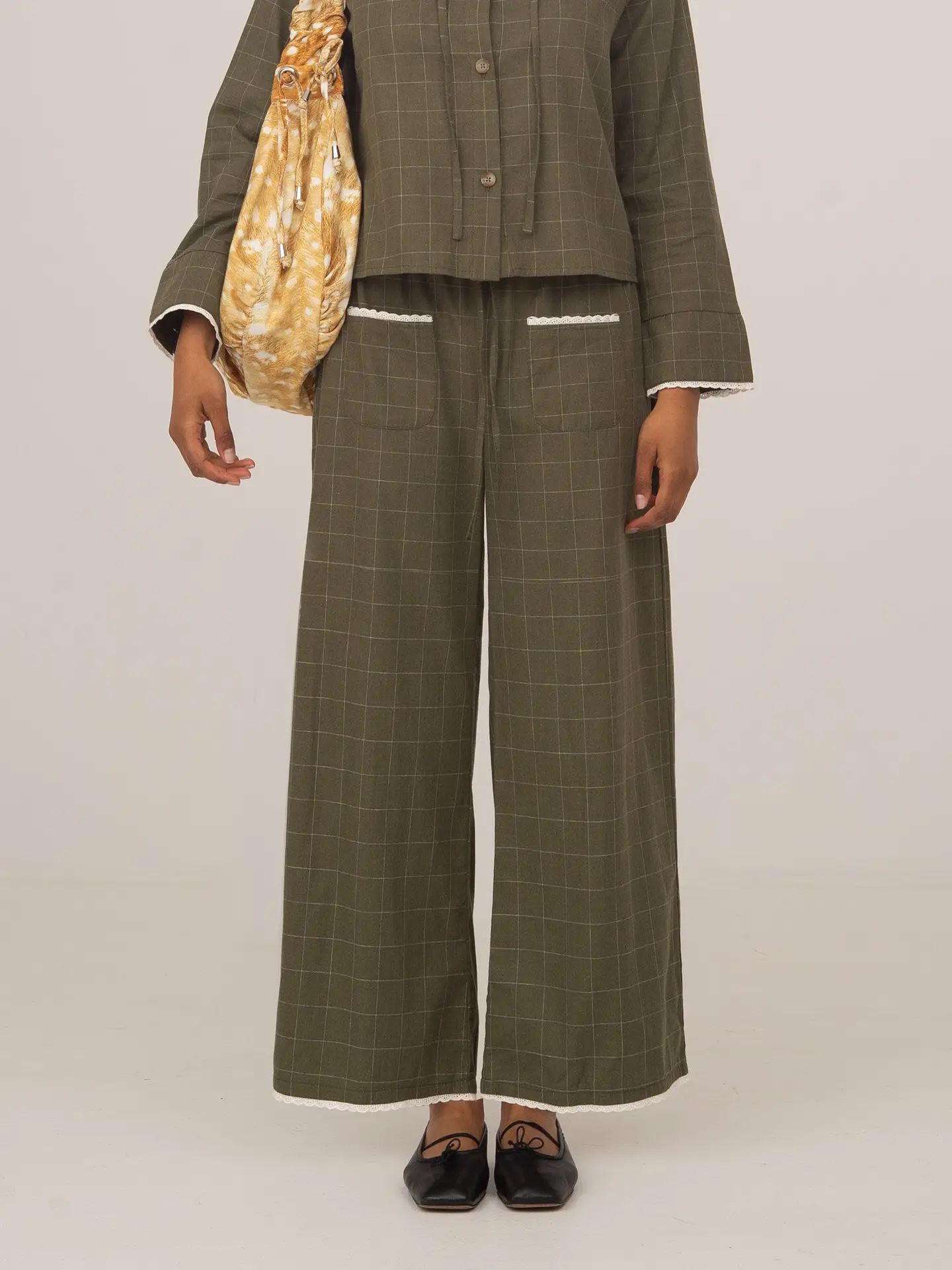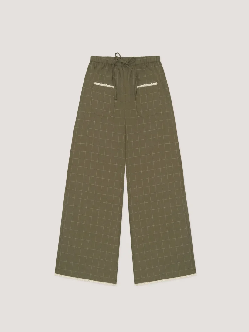 Die lange karierte Hose Betty in Grün und Weiß bietet eine entspannte Silhouette aus kariertem Stoff, die zeitlosen Charme mit einem modernen Touch verbindet.