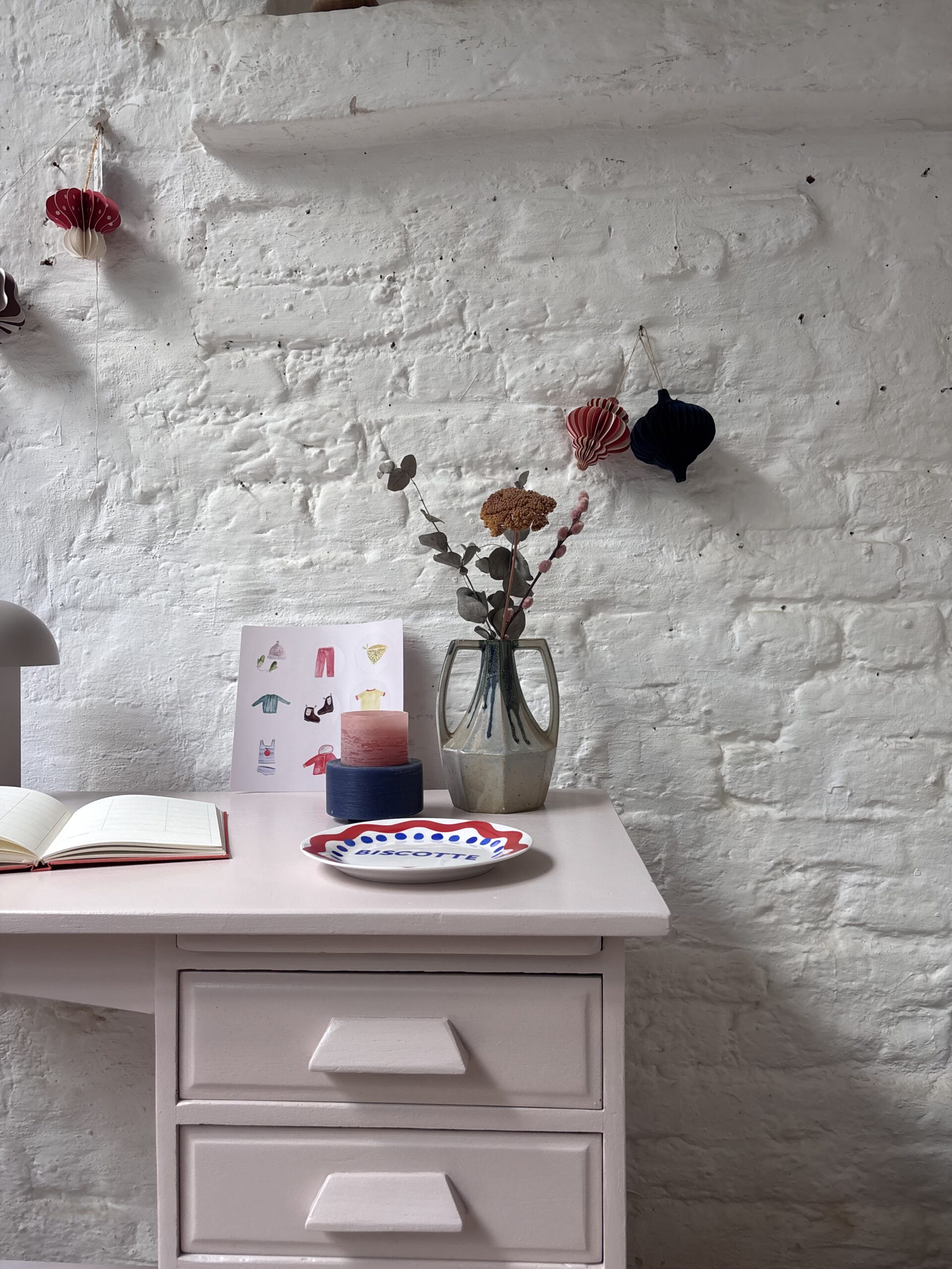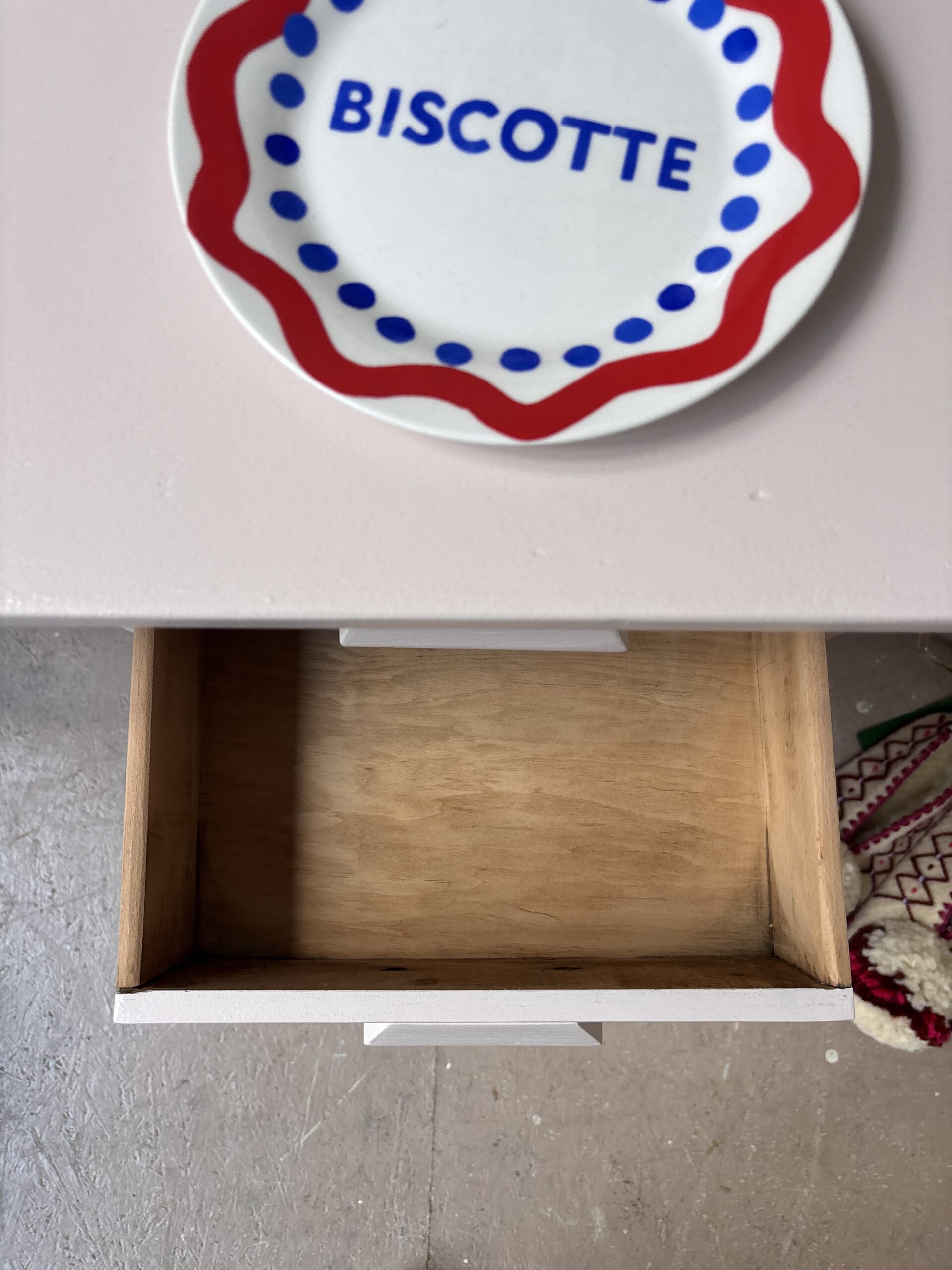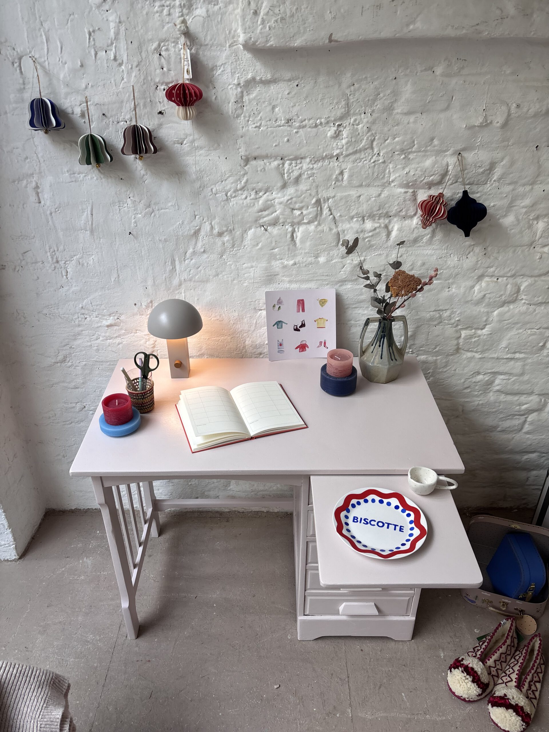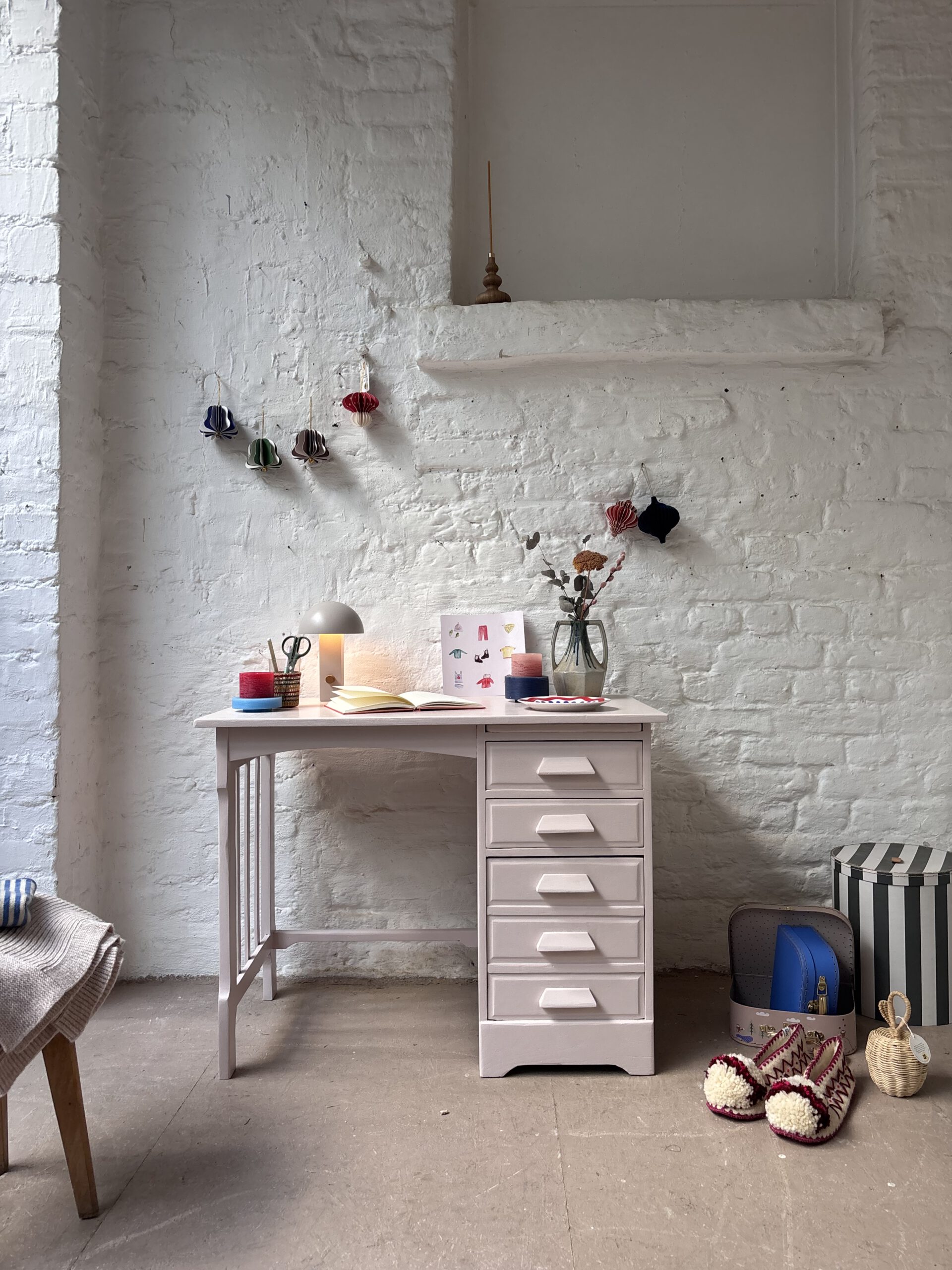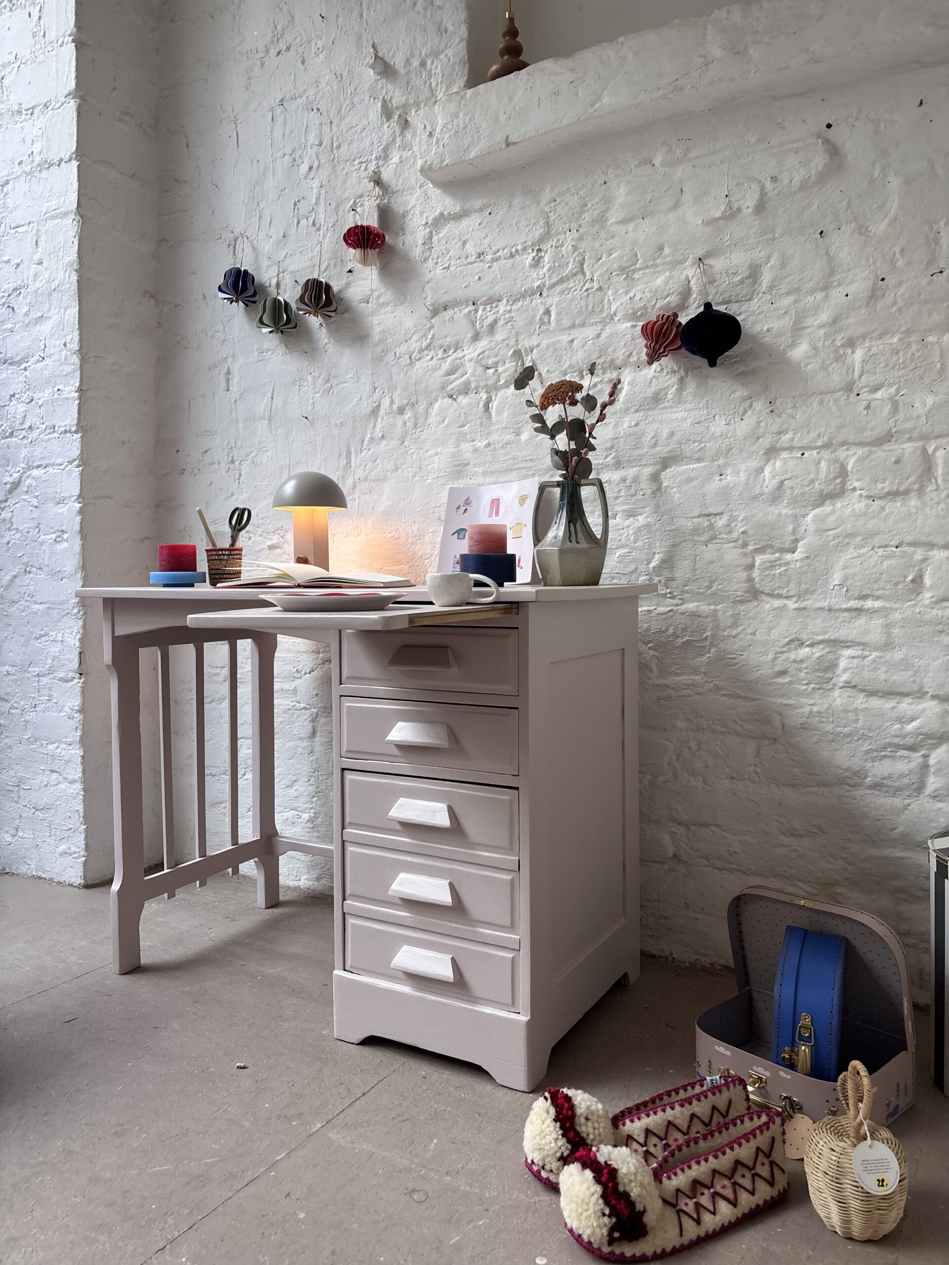 Wir haben Camille restauriert, geschliffen grundiert und zwei Mal lackiert in einem hellen rosa von Farrow and Ball.