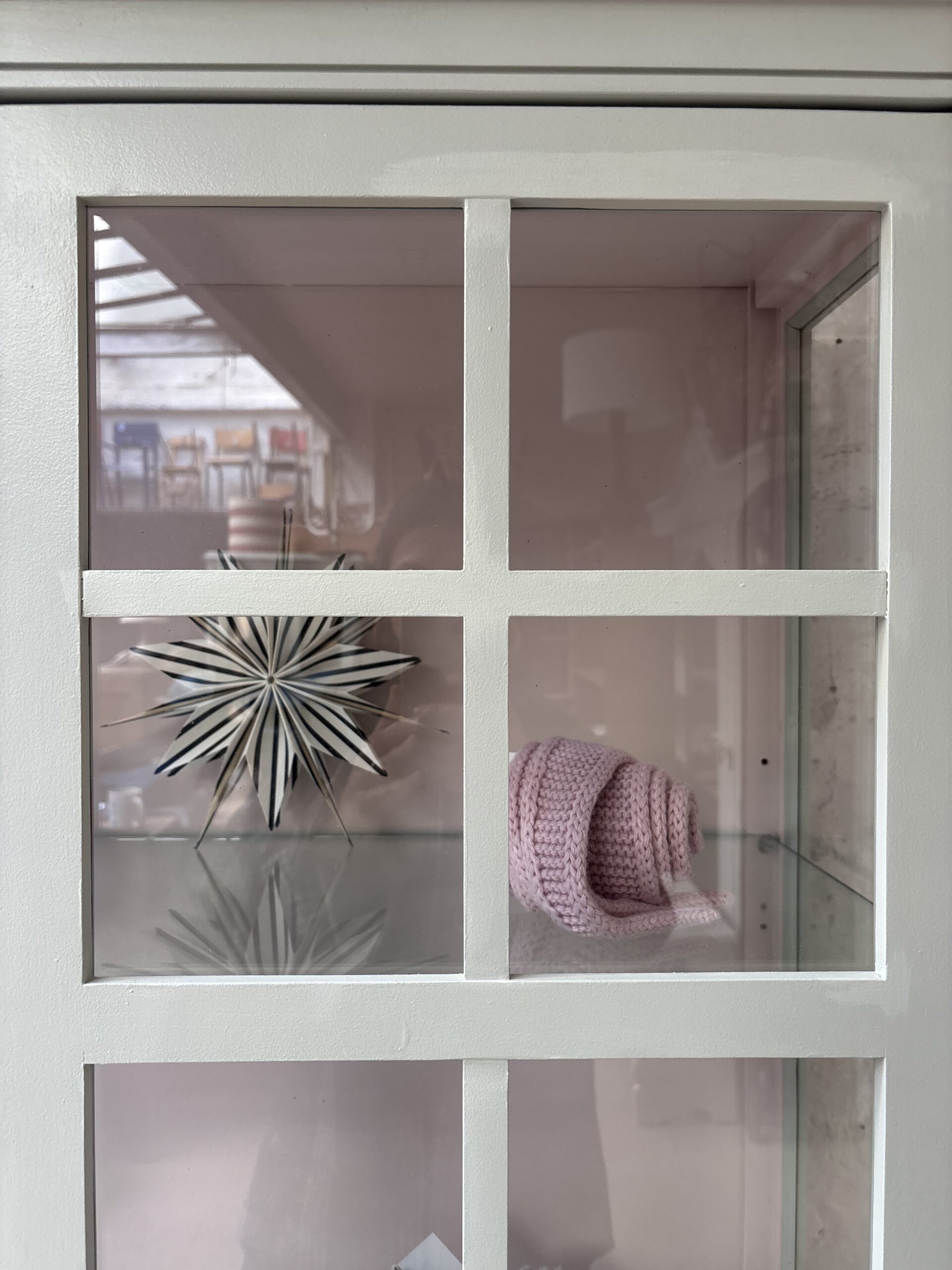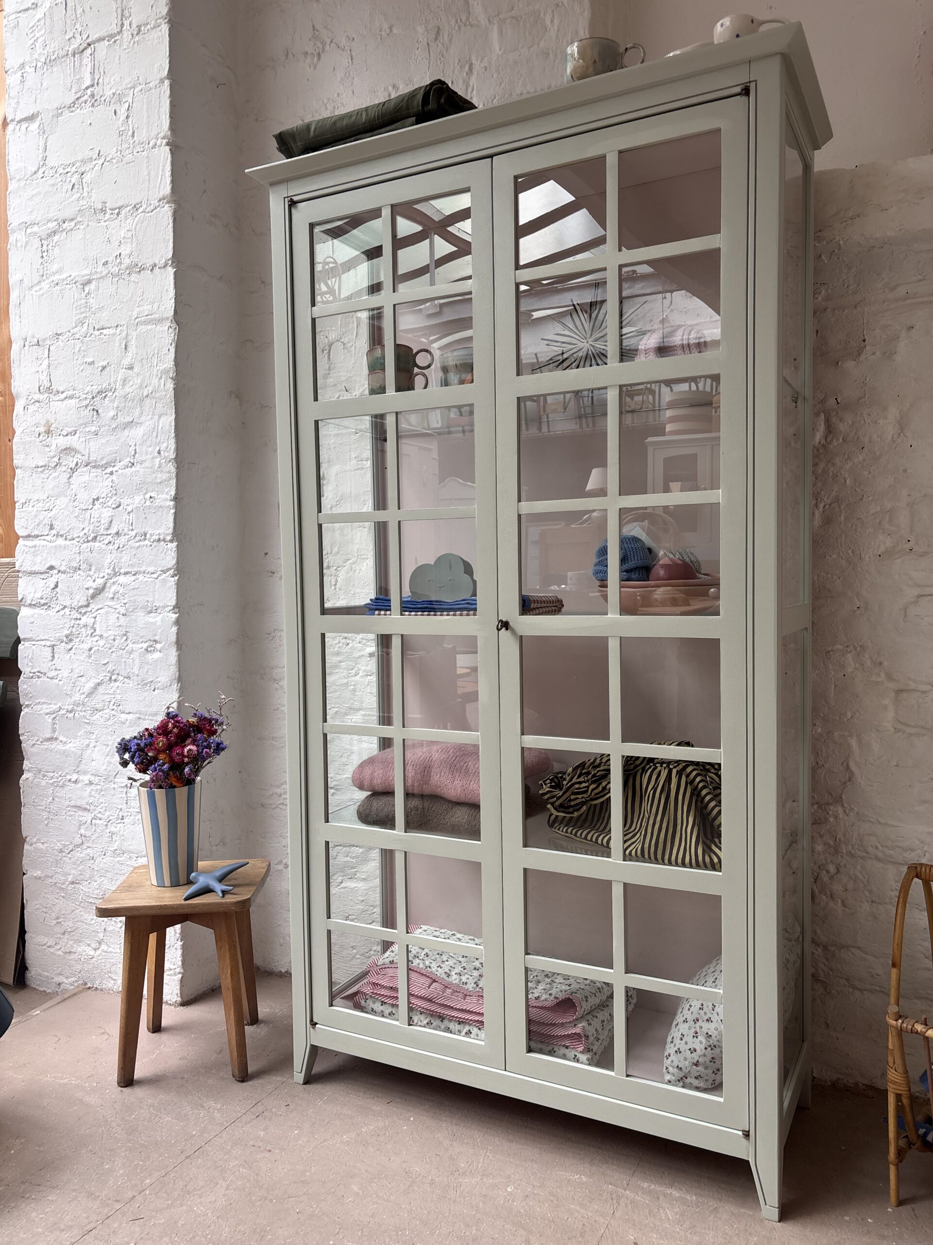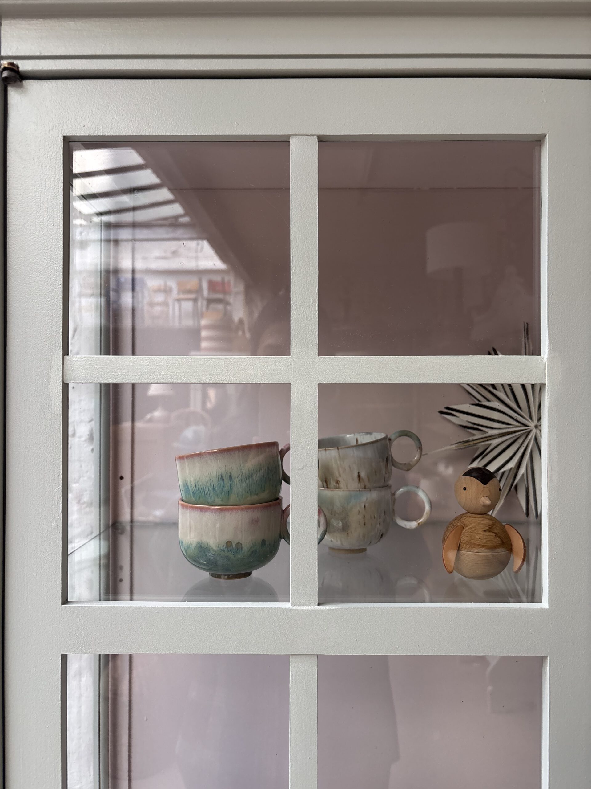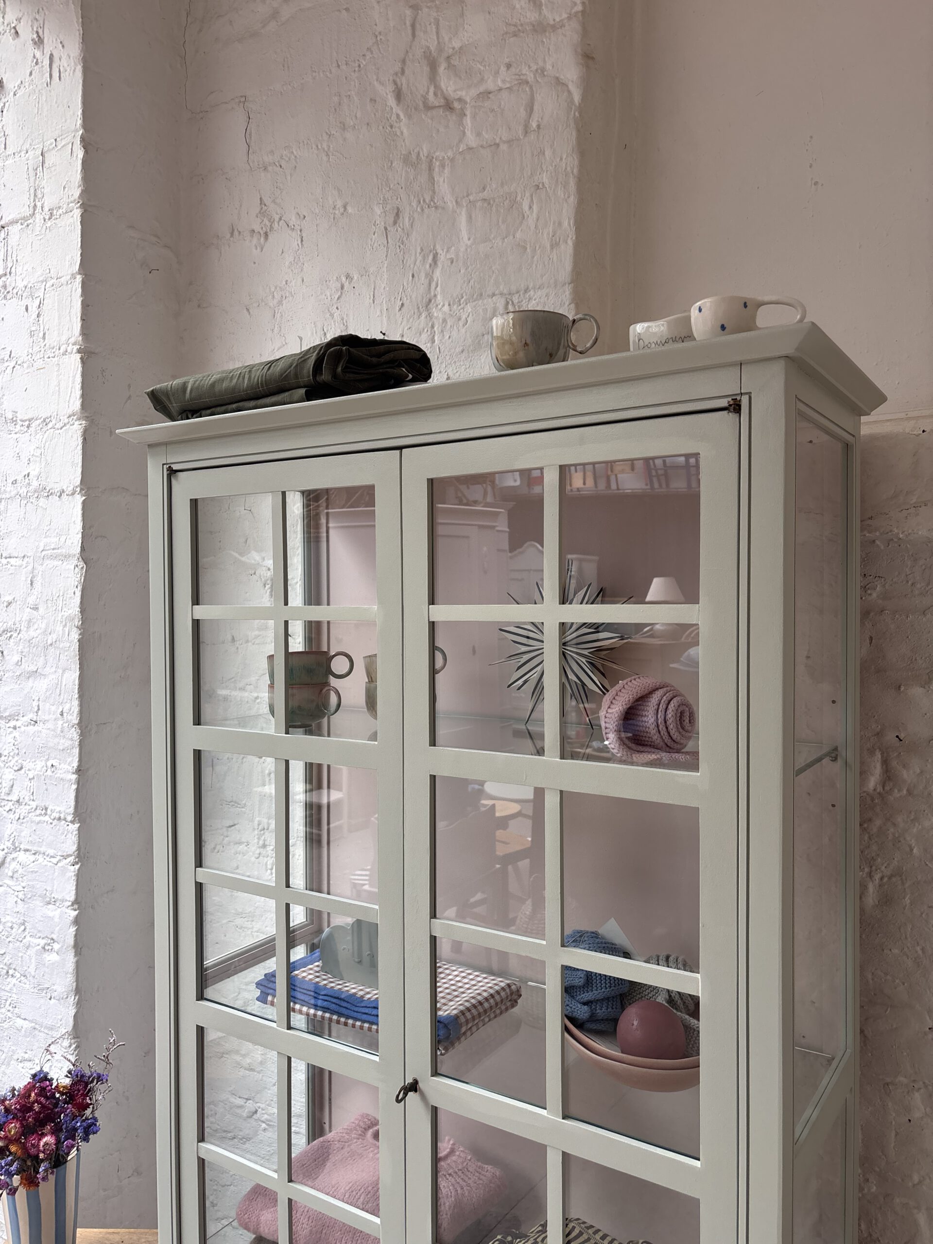 Ciel macht seinem Namen alle Ehre, denn diese so luftige französische wunderschöne Vitrine bringt Leichtigkeit in dein Zuhause. Ciel stammt aus Frankreich von der Traditionsmöbelfirma Grange. Die Firma gibt es seid 1904. Ciel ist allerdings erst 24 Jahre alt (das verrät der Aufkleber hinten an der Rückwand) und ein Vintage Schätzchen vom feinsten. Diese Sprossenfenster-Optik ist einfach zauberhaft, der Rahmen filigran und das ganze Möbel einfach schön. Dadurch das Ciel so luftig wirkt und mit gerade mal einer Tiefe von 38 cm, ist er einfach wunderschön für jeden Raum. Er trägt nicht auf als Möbel und stellt deine Lieblinge elegant aus.