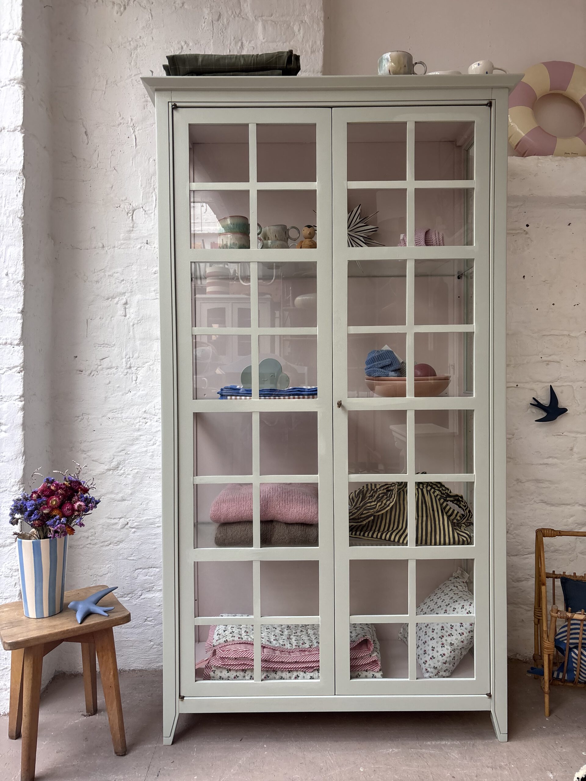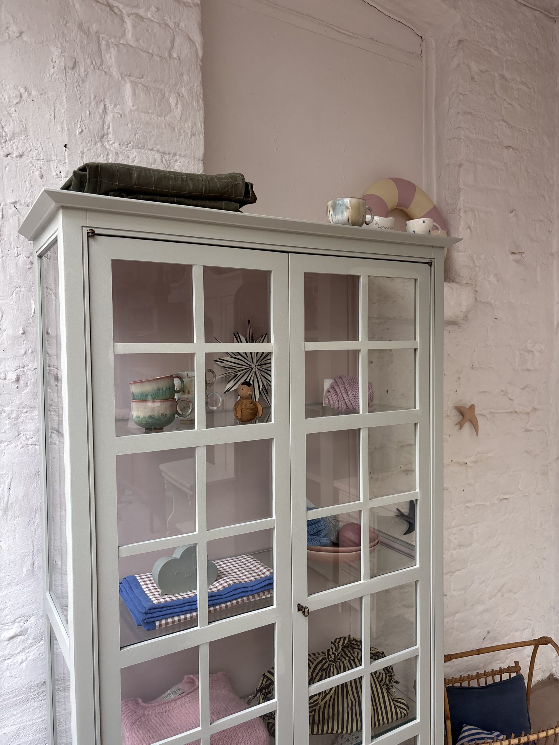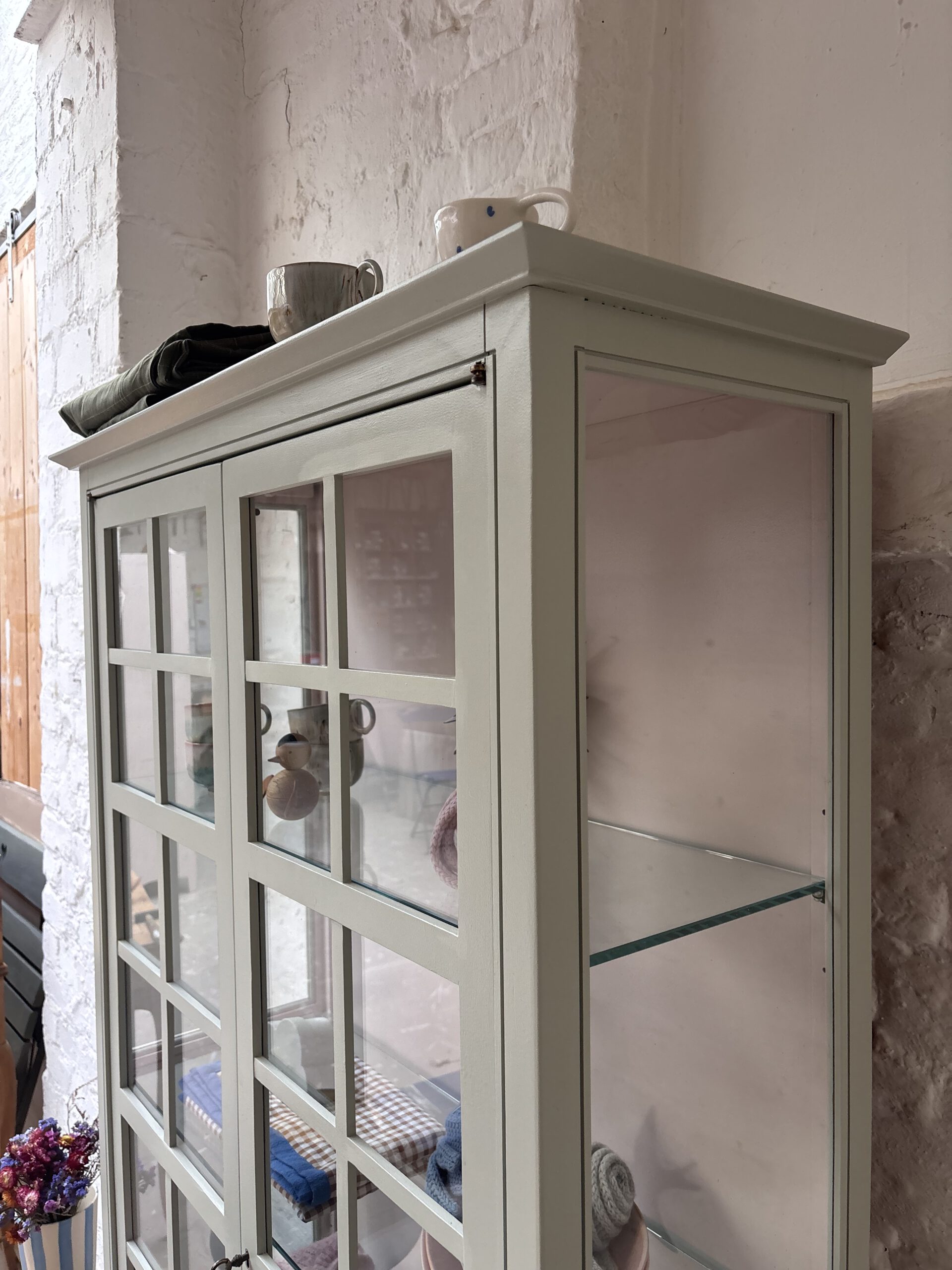 Ciel macht seinem Namen alle Ehre, denn diese so luftige französische wunderschöne Vitrine bringt Leichtigkeit in dein Zuhause. Ciel stammt aus Frankreich von der Traditionsmöbelfirma Grange. Die Firma gibt es seid 1904. Ciel ist allerdings erst 24 Jahre alt (das verrät der Aufkleber hinten an der Rückwand) und ein Vintage Schätzchen vom feinsten. Diese Sprossenfenster-Optik ist einfach zauberhaft, der Rahmen filigran und das ganze Möbel einfach schön. Dadurch das Ciel so luftig wirkt und mit gerade mal einer Tiefe von 38 cm, ist er einfach wunderschön für jeden Raum. Er trägt nicht auf als Möbel und stellt deine Lieblinge elegant aus.