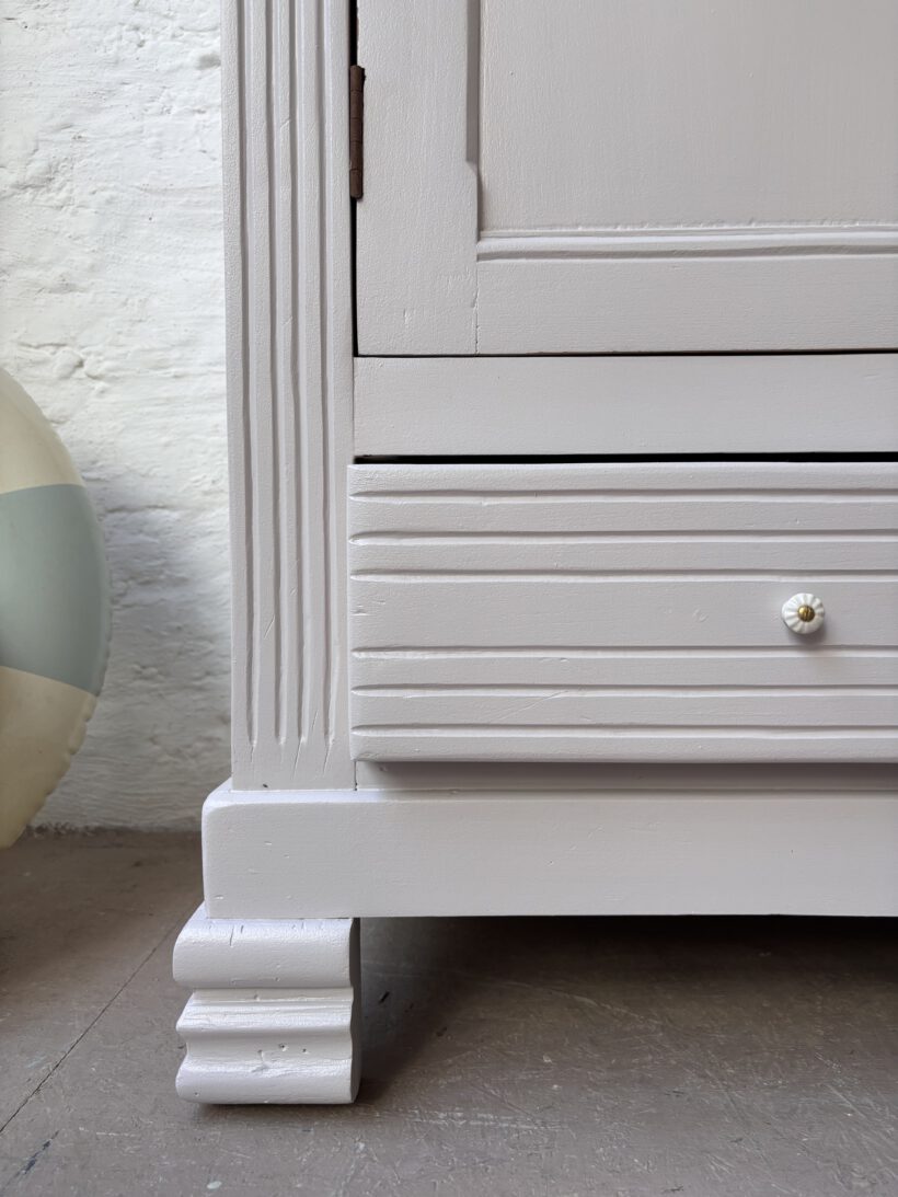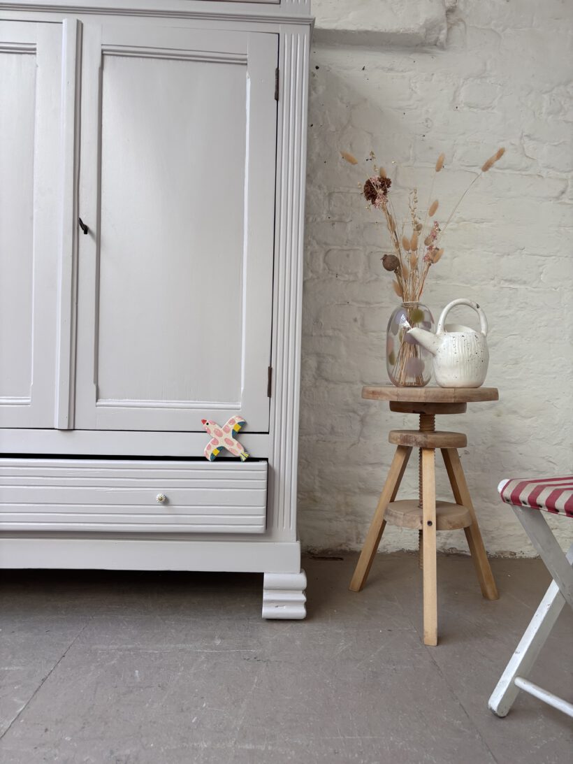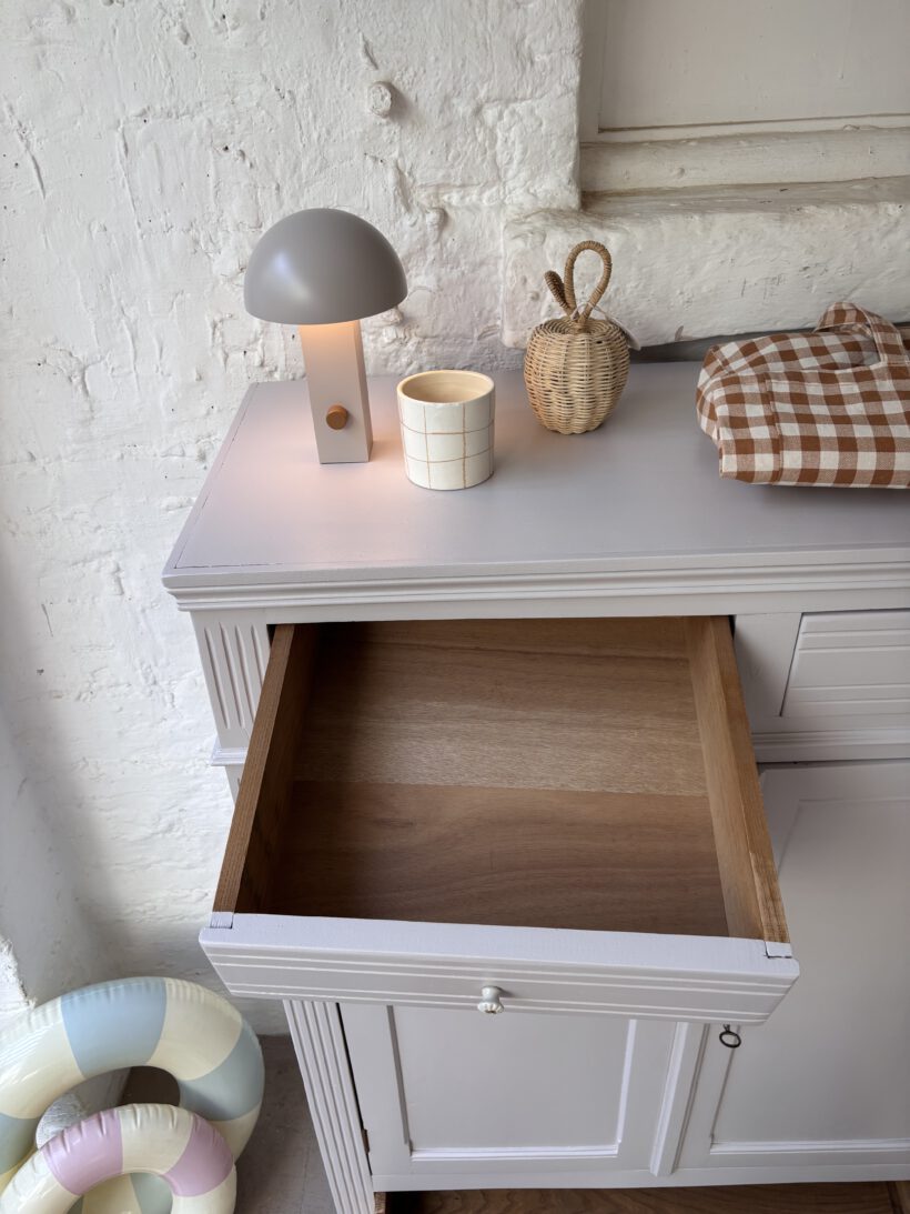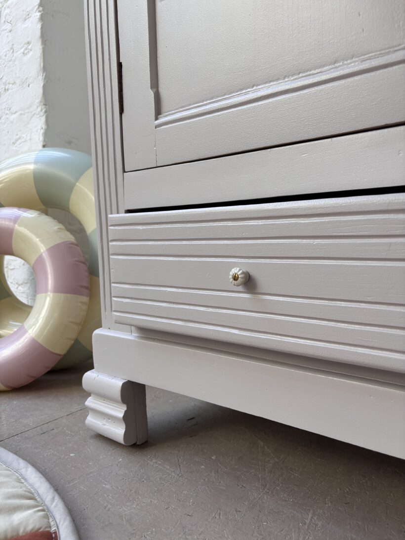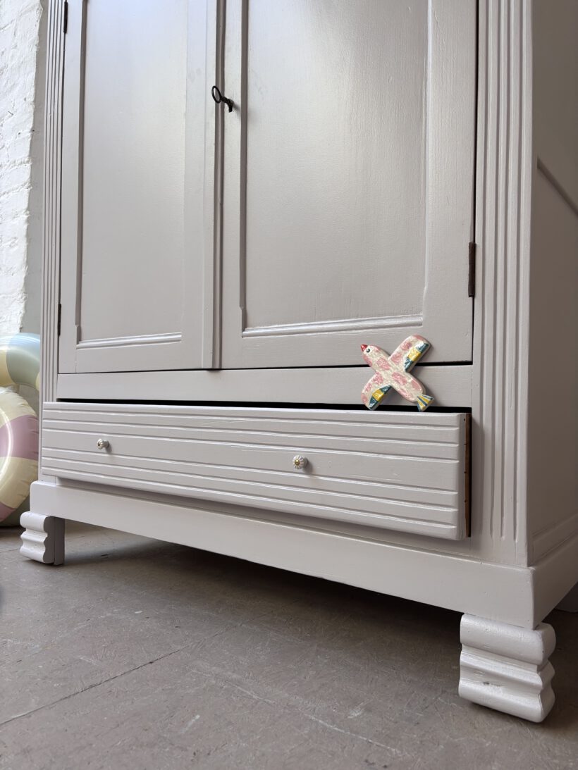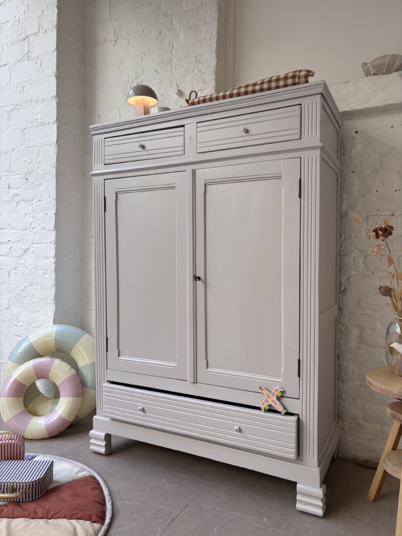 Wir haben Claude restauriert und aufbereitet in einem Fliedergrau von Farrow and Ball. Innen hat er zwei neue Böden von uns bekommen aus Kieferleimholz, die sich farblich vom original Holzton unterscheiden. Er hat vier neue Keramikknöpfe mit Messingschrauben:-) Der Schlüssel für die Tür funktioniert einwandfrei.