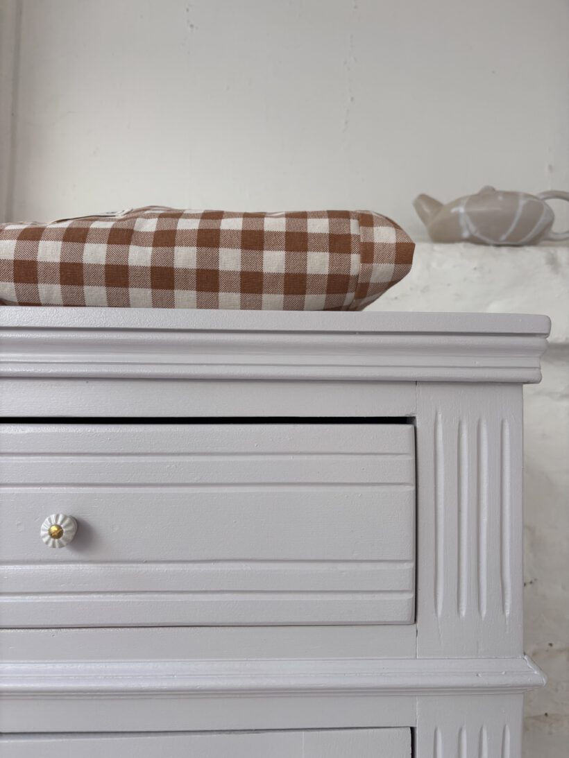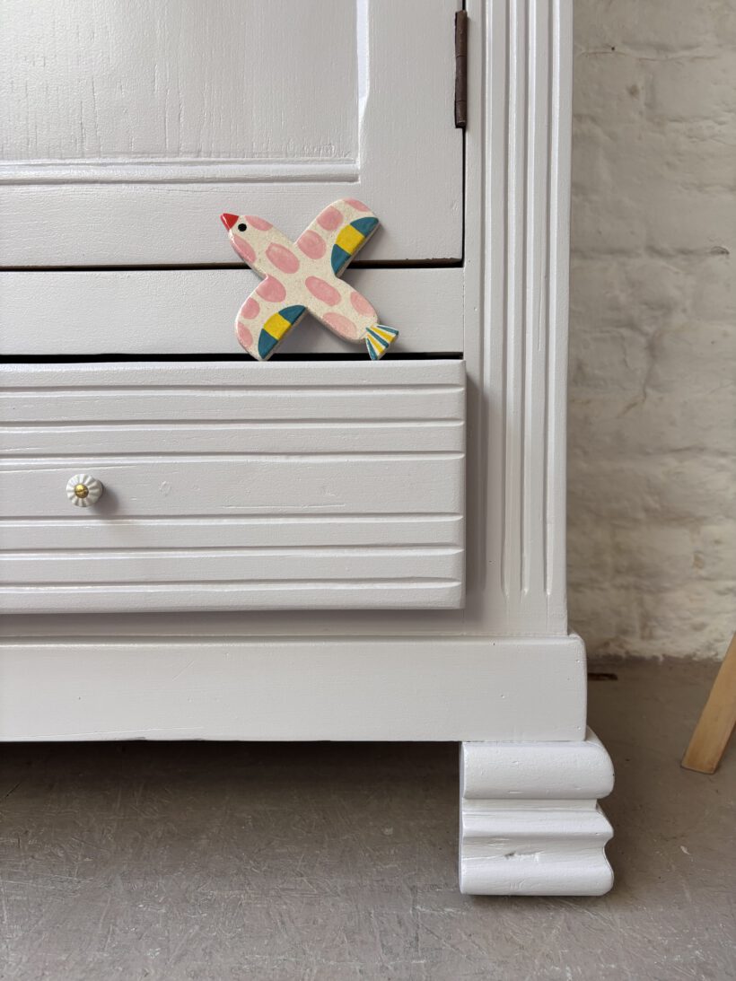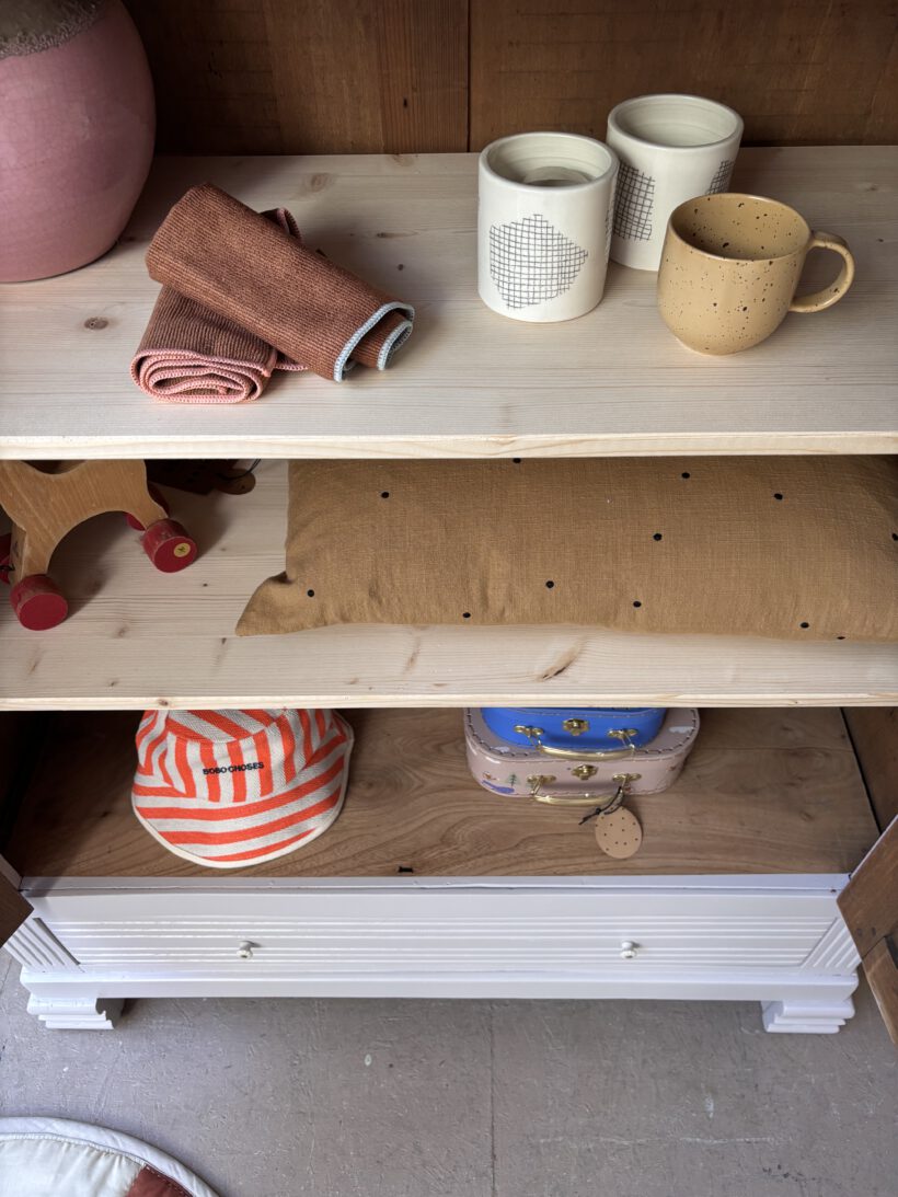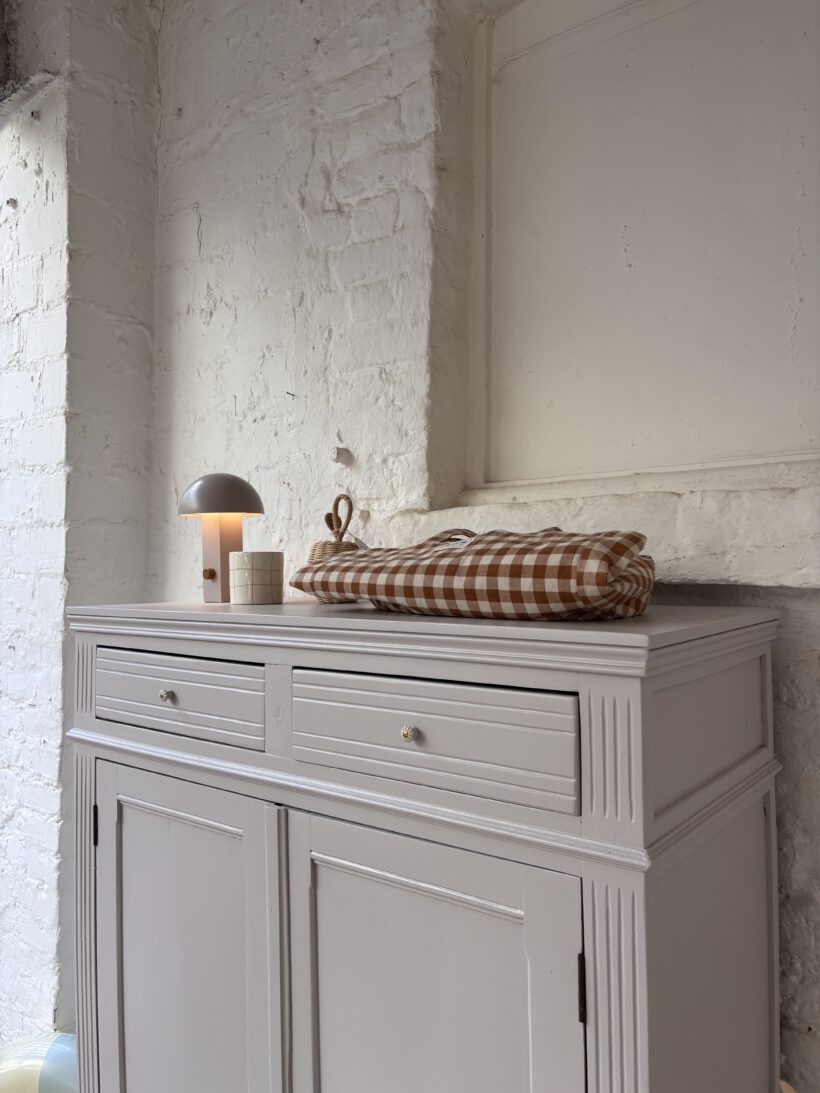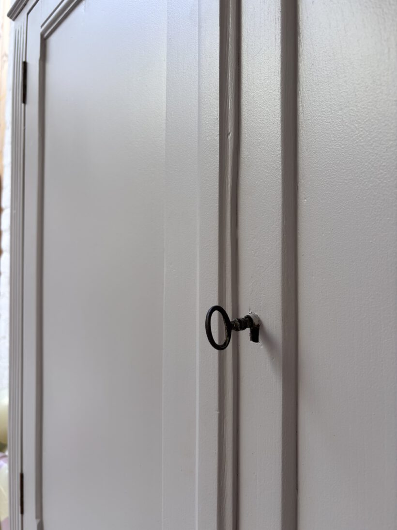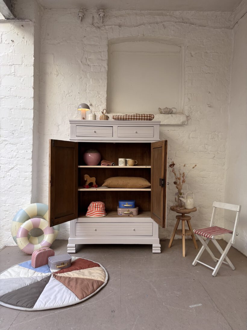 Wir haben Claude restauriert und aufbereitet in einem Fliedergrau von Farrow and Ball. Innen hat er zwei neue Böden von uns bekommen aus Kieferleimholz, die sich farblich vom original Holzton unterscheiden. Er hat vier neue Keramikknöpfe mit Messingschrauben:-) Der Schlüssel für die Tür funktioniert einwandfrei.