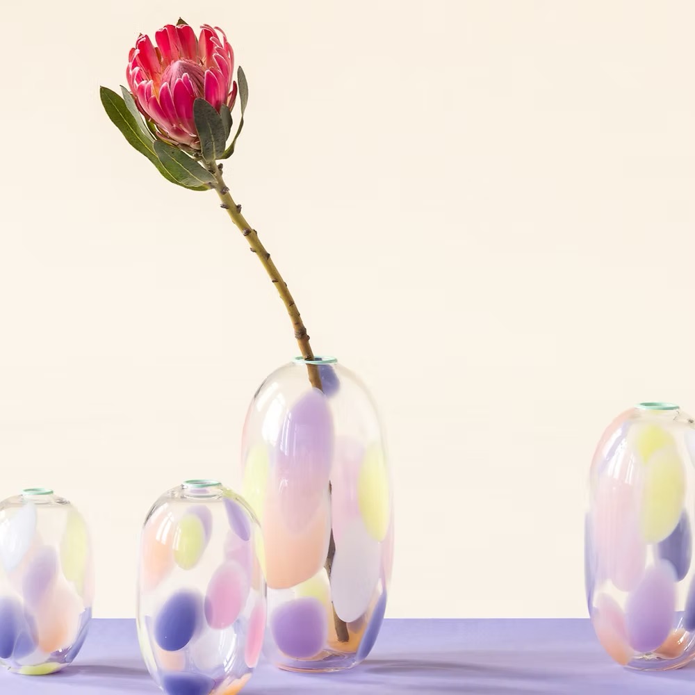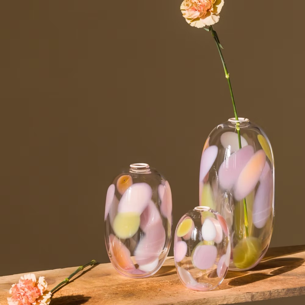 Individuelles, handgefertigtes Unikat – am Heißglasofen frei geformt. Charakteristische „Heftmarke“ am Boden: Eine kleine Markierung durch den Transfer von der Glasmacherpfeife an das Hefteisen. Die Heftmarke ist ein Qualitätsmerkmal für handwerklich gefertigtes, mundgeblasenes Glas. Aufgrund der handwerklichen Fertigung variieren die Vasen in Höhe und Durchmesser – mal sind sie schlanker und höher, mal breiter und niedriger. Die Größenangaben sind daher als Anhaltspunkt zu verstehen und werden immer leicht abweichen. Auch die Farbflecken fallen bei jedem Unikat ganz individuell aus.