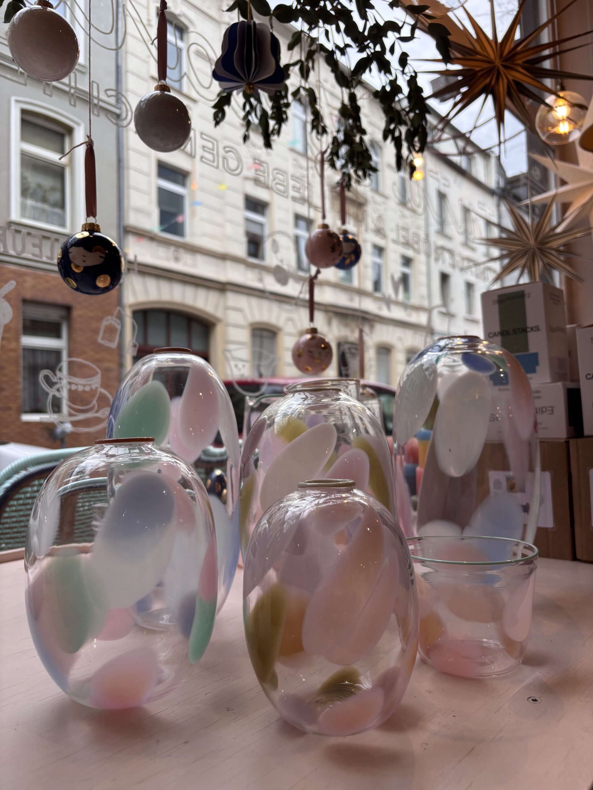 Bei knapp 1200 Grad werden diese Vasen, von Pia Hoff, mundgeblasenen und frei von Hand gefertigt.