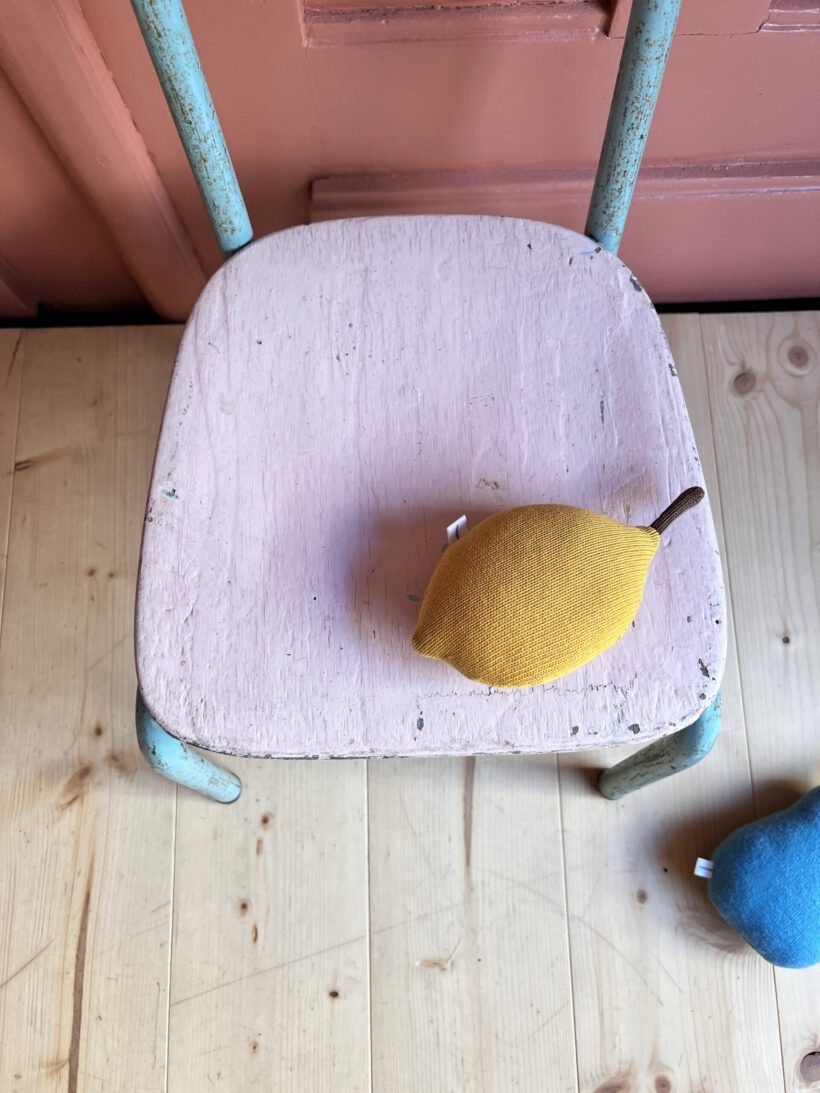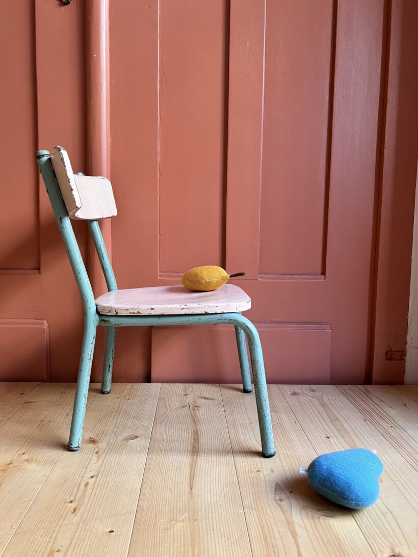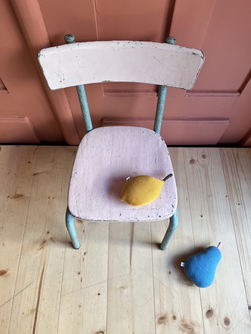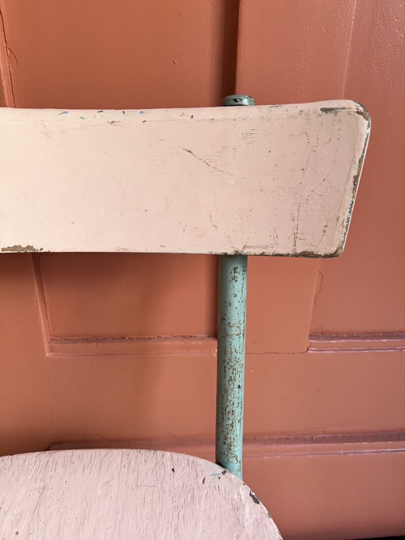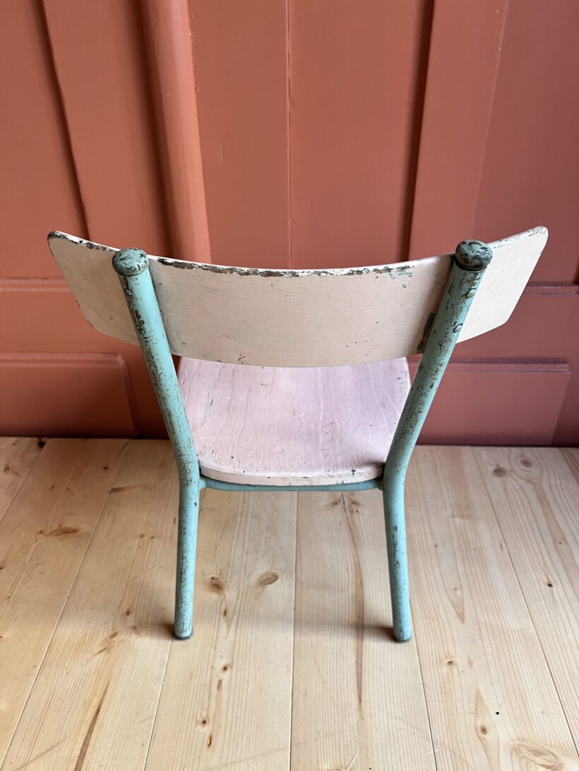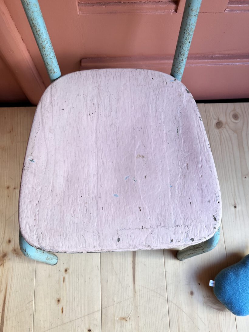 ein wunderschöner Design Kinderstuhl mit einer traumhaften rosa-blauen Patina. Ein Hingucker im Kinderzimmer oder als kleines Beistelltischen.