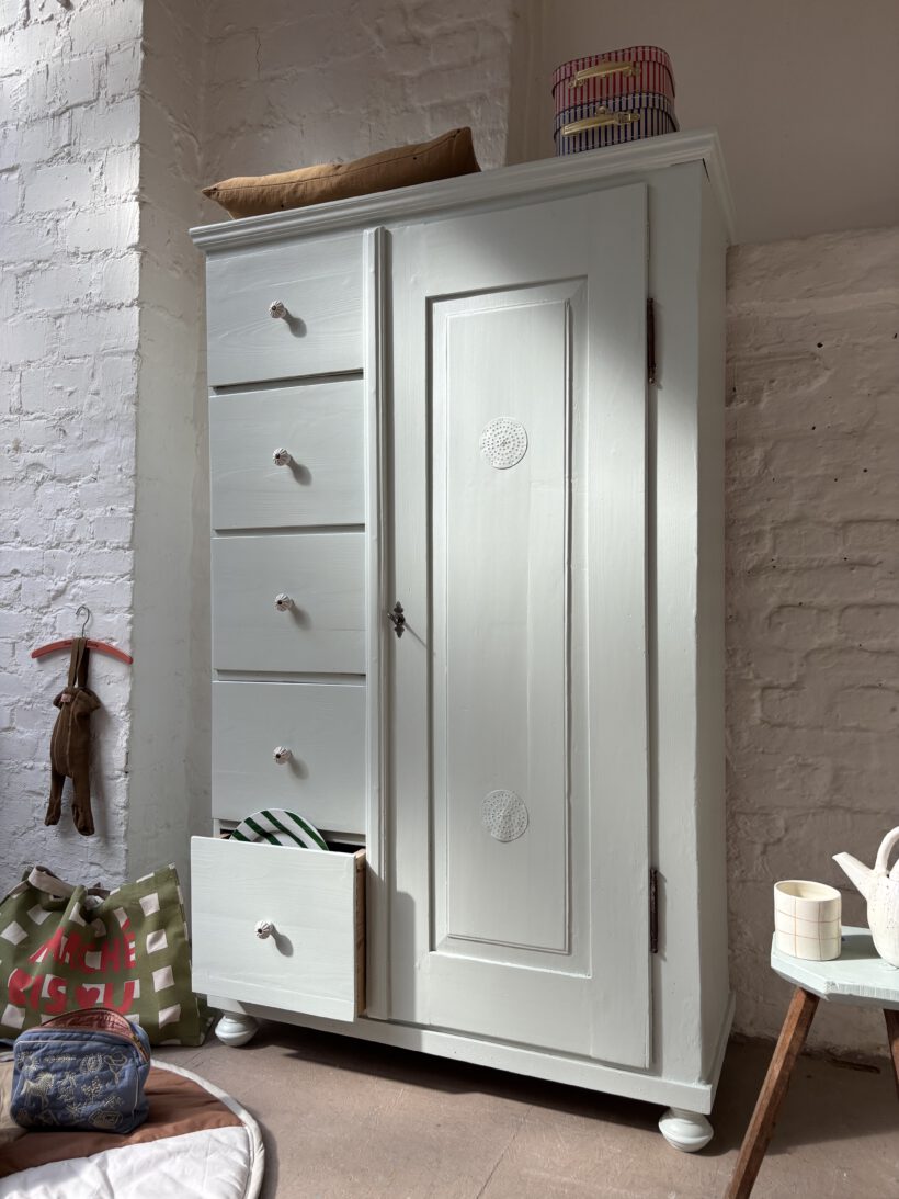 was ein Träumchen! Unser liebster neuer Brotschrank! Bei diesem antiken Schätzchen handelt es sich um einen klassischen Brotschrank mit einer Tür rechts und fünf Schubladen für besonders viel Stauraum. Auch die vier Fächer im Schrankinneren bieten Platz ohne Ende. Besonders süß ist das schmal kleine extra regal ganz oben für Tassen oder gute Vorräte;-)