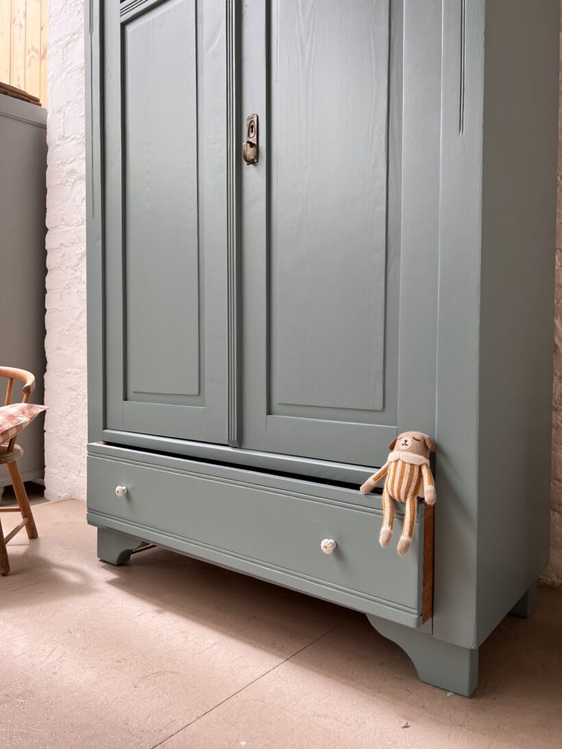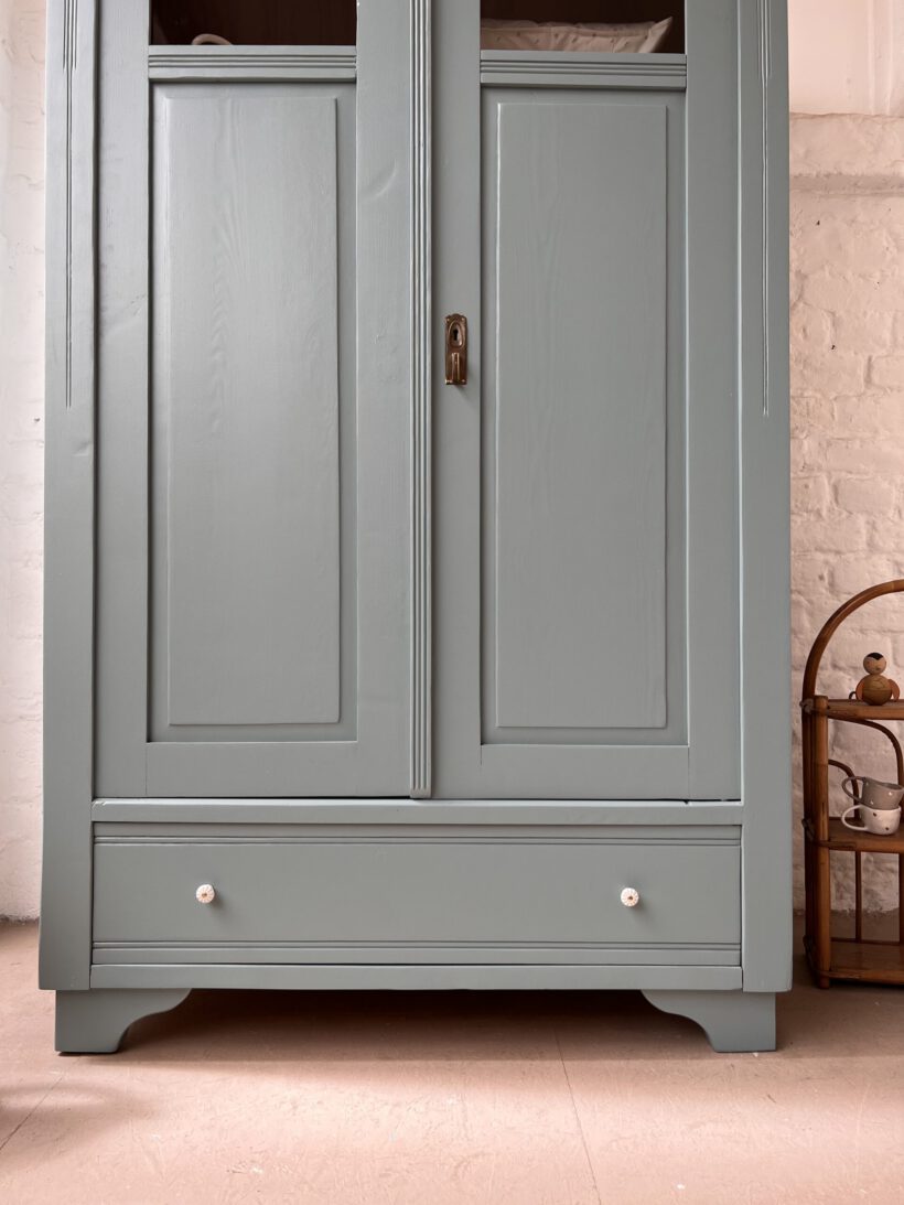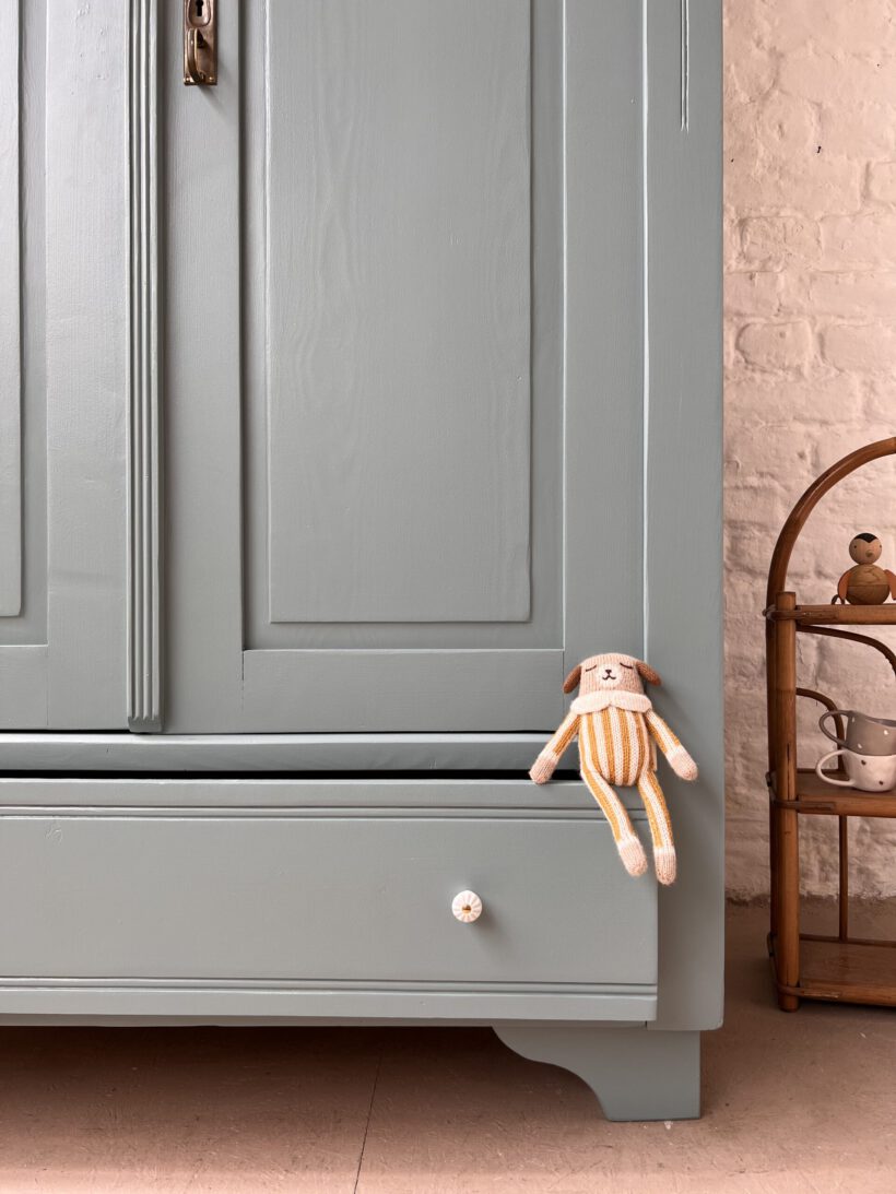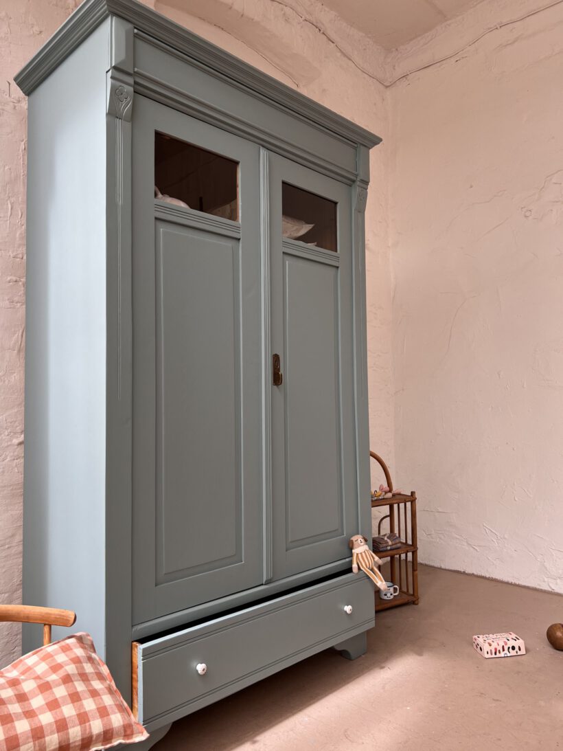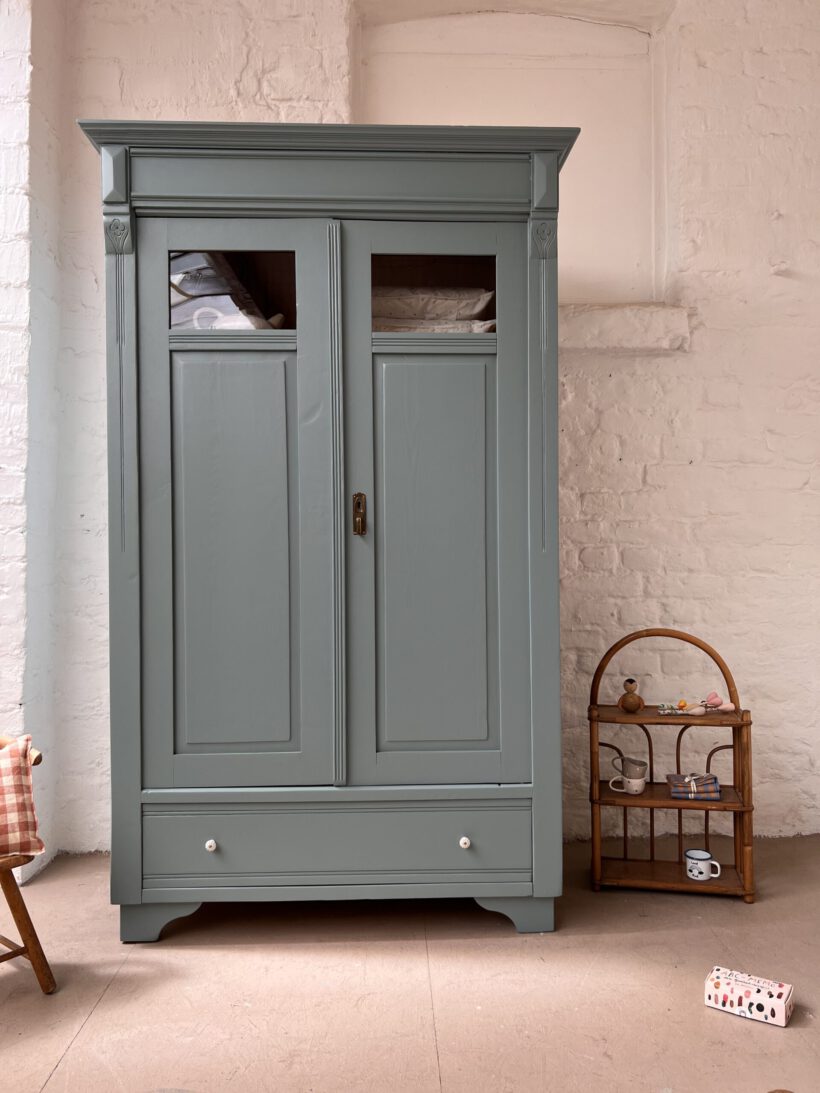 Emil wurde restauriert, geschliffen und grundiert, sowie zwei Mal lackiert in unserem absoluten Lieblingsblaugrau von Farrow and Ball.