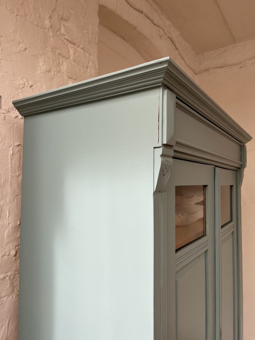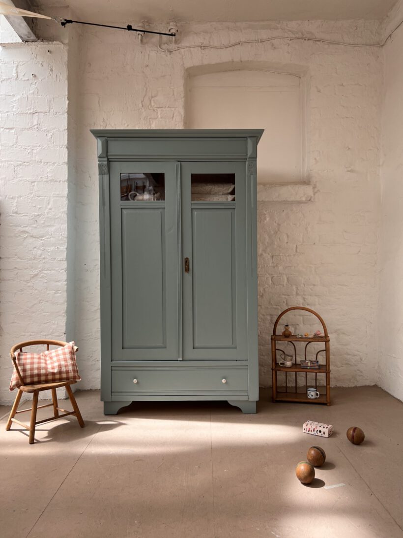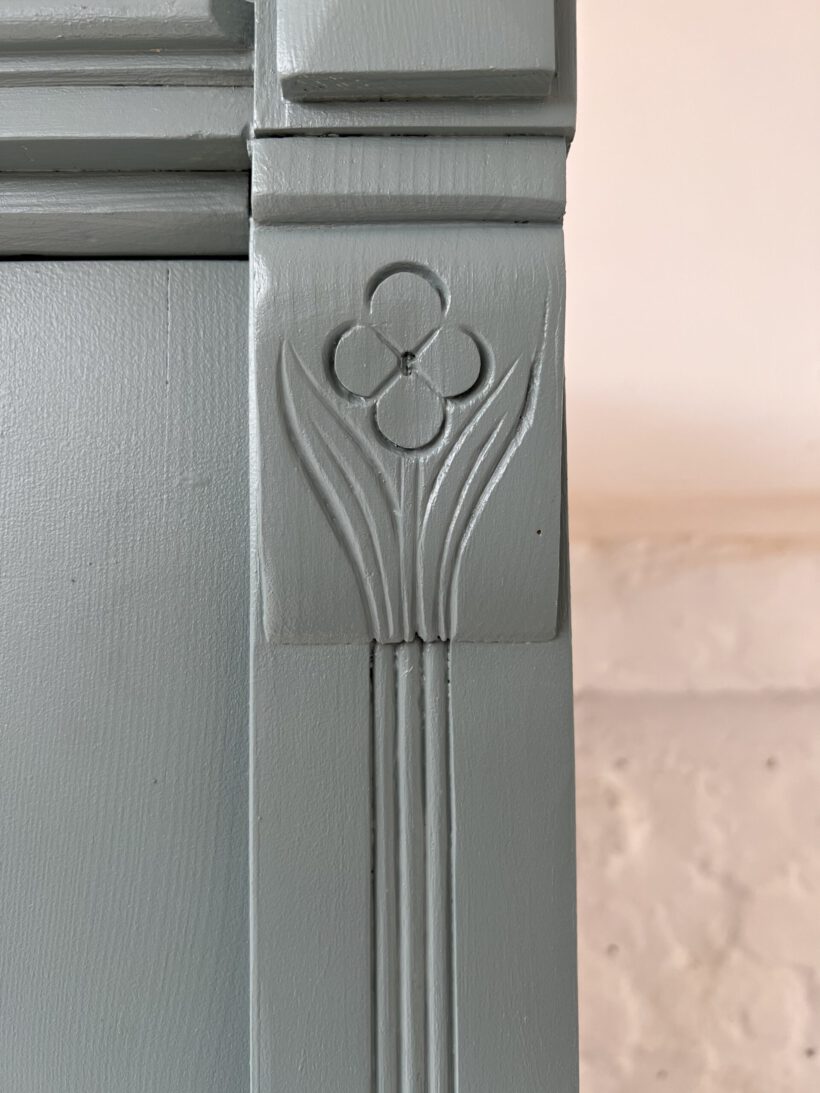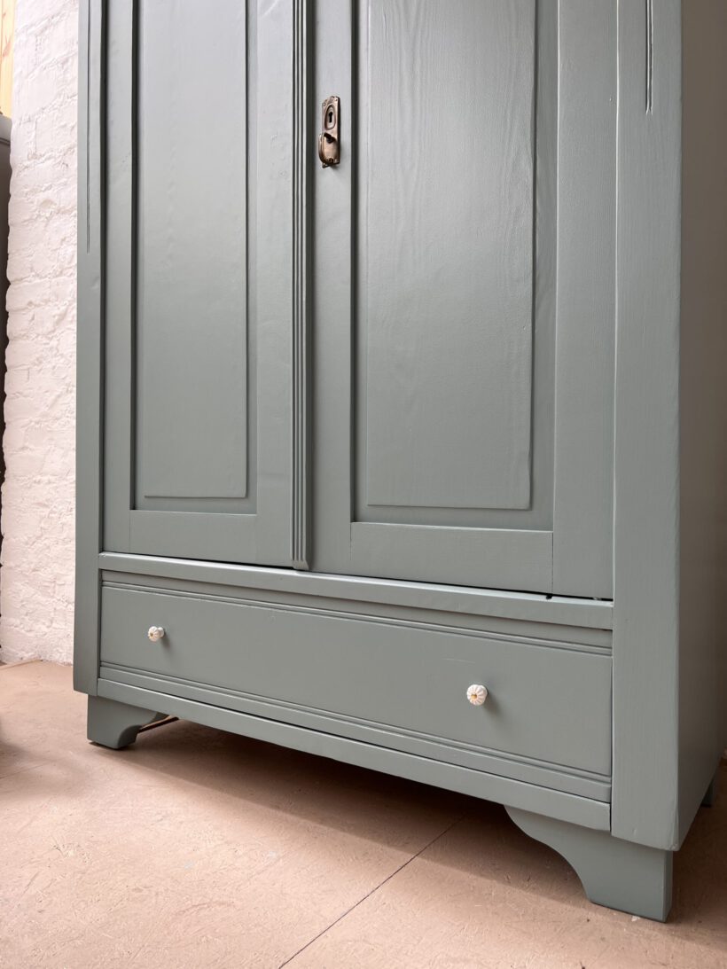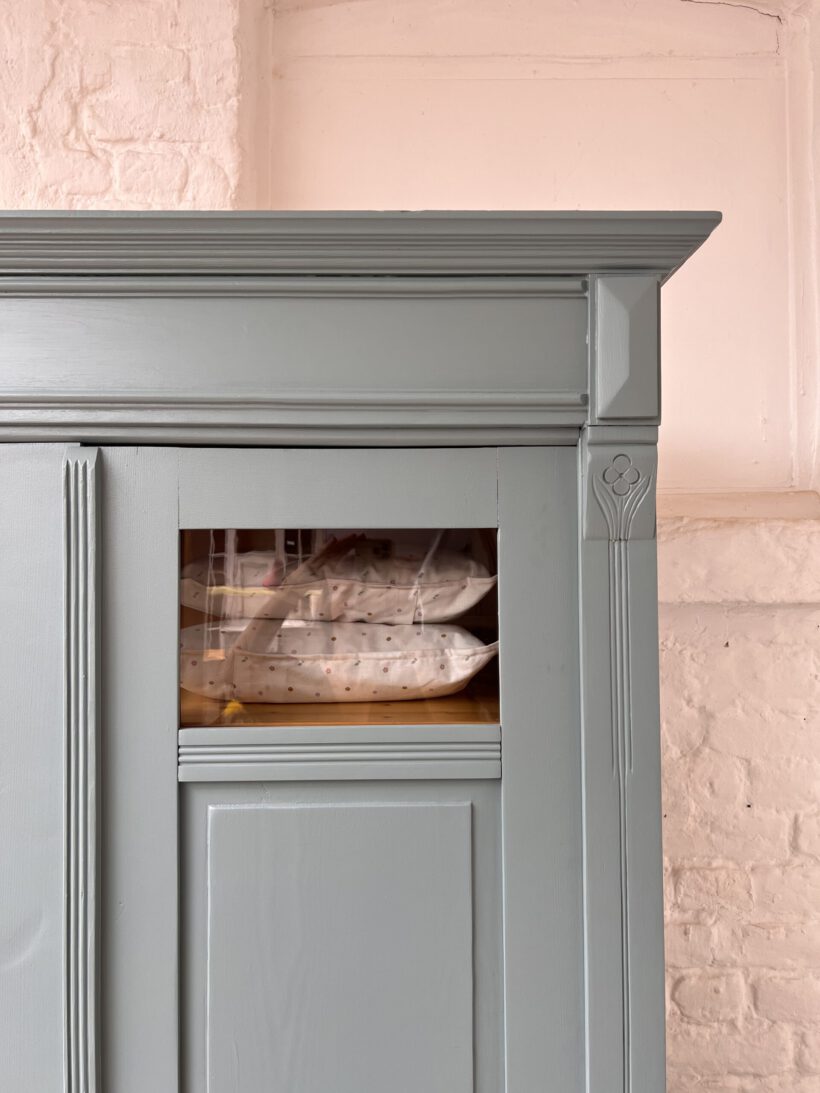 Emil wurde restauriert, geschliffen und grundiert, sowie zwei Mal lackiert in unserem absoluten Lieblingsblaugrau von Farrow and Ball.