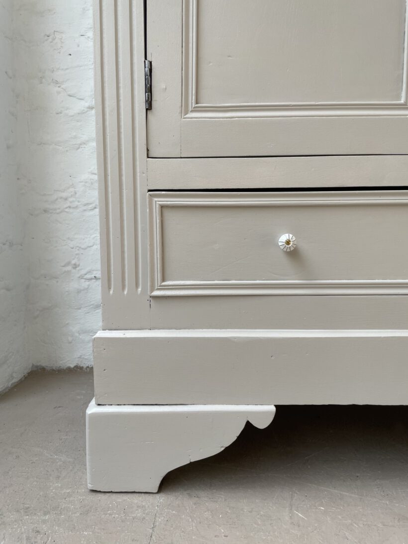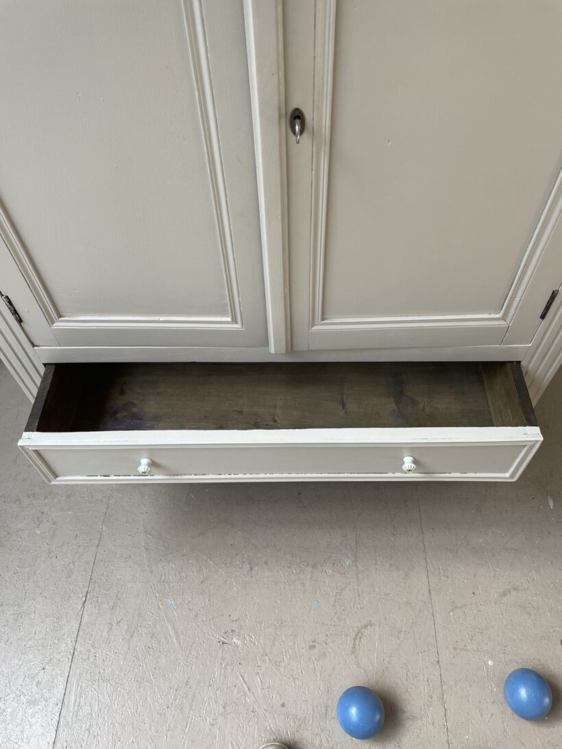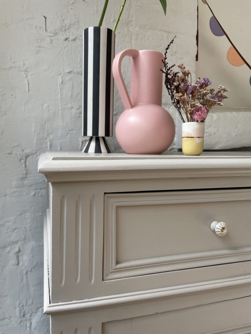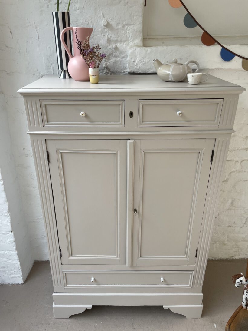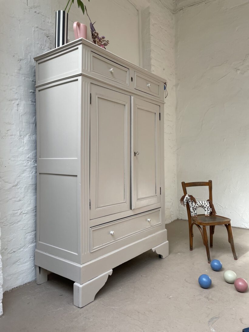 Enzo hat von uns im inneren drei neue Böden bekommen. Außerdem haben wir ihn geschliffen, grundiert und zwei mal lackiert. Wir haben ihn in einen schönen warmen Sand Ton von Farrow & Ball getaucht.