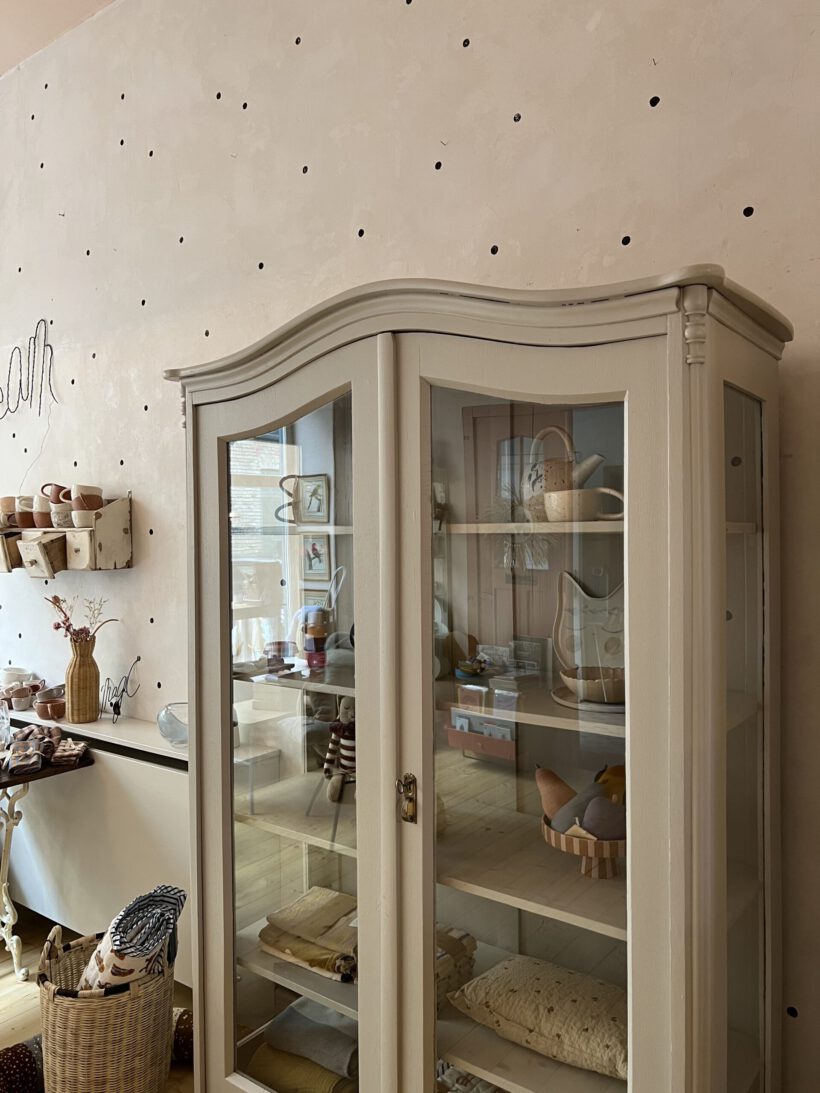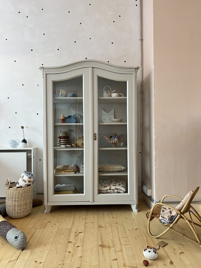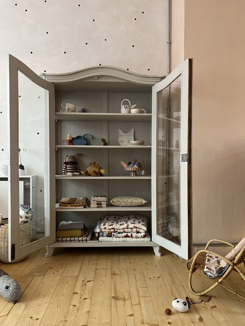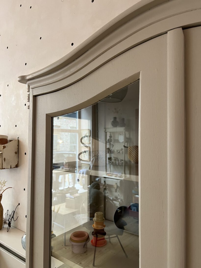 Sie bietet sehr viel Stauraum und stellt diesen von allen Seiten aus: Vorne sind die alten Gläser in den Türen geschwungen, seitlich quadratisch.