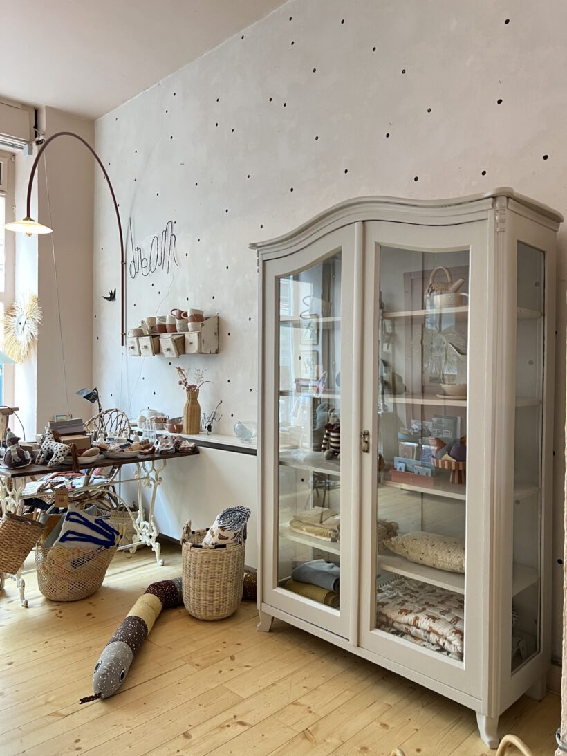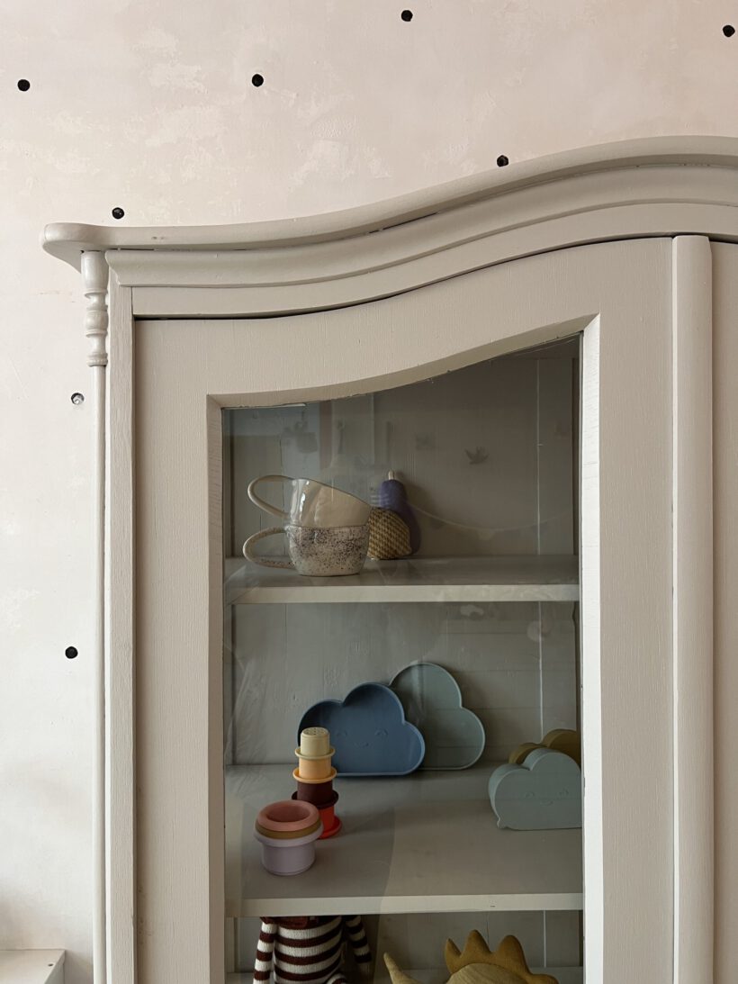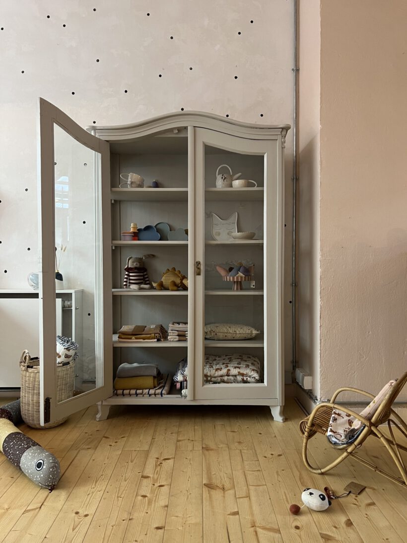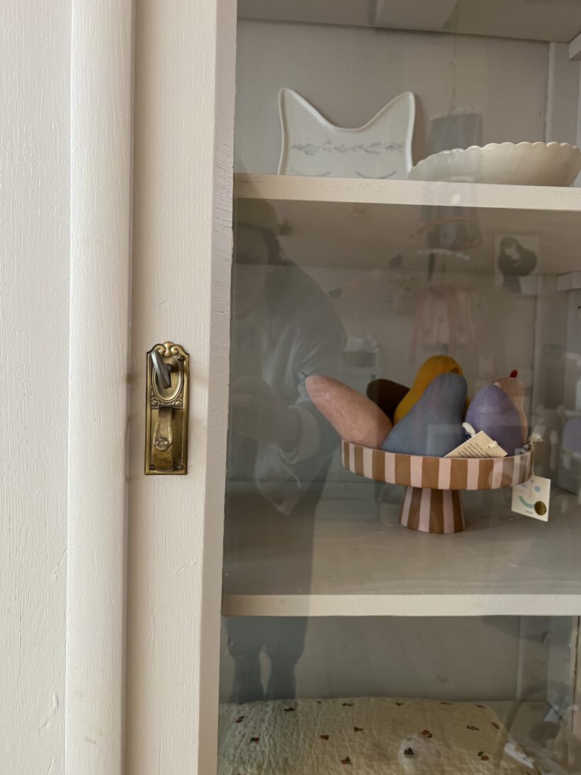 Sie bietet sehr viel Stauraum und stellt diesen von allen Seiten aus: Vorne sind die alten Gläser in den Türen geschwungen, seitlich quadratisch.