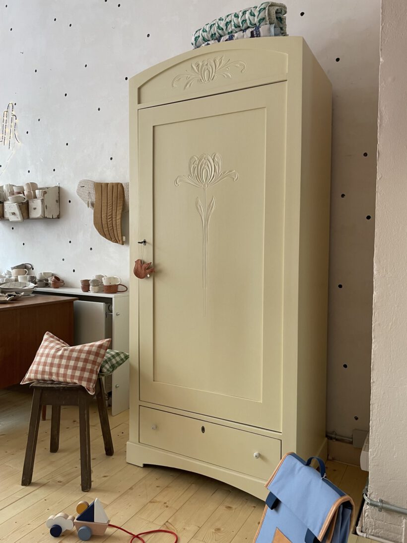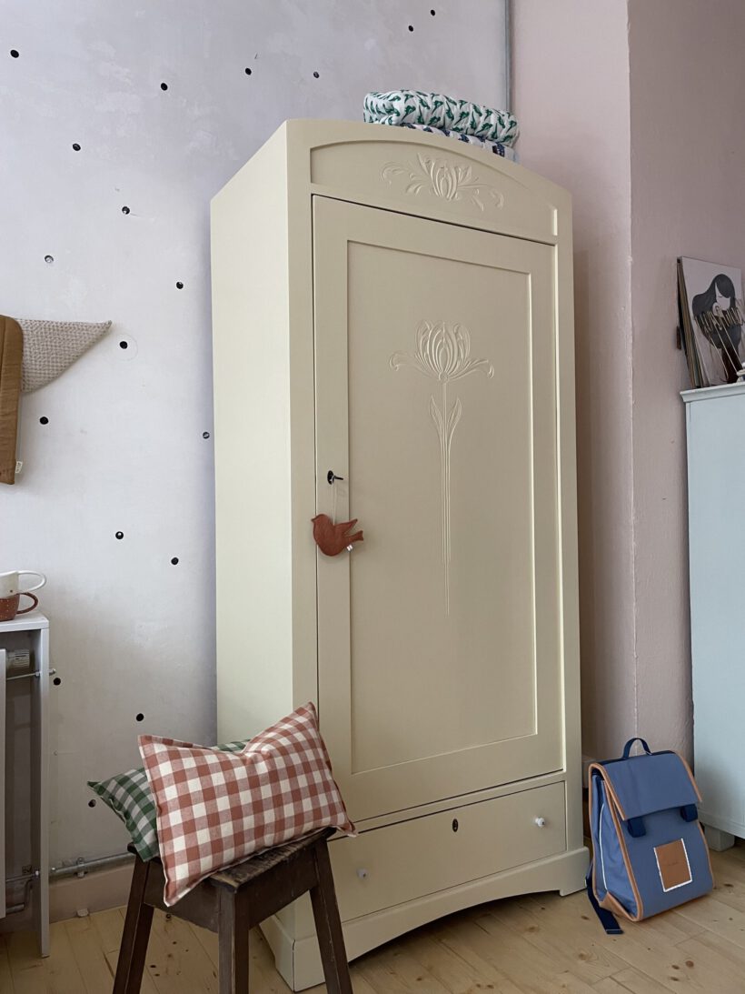 Was für eine Hübsche und Besondere ist Fleur!? So einen Schrank hatten wir tatsächlich noch nicht gesehen und freuen uns sehr Fleur gefunden zu haben. Wir lieben ihre Form, ihr Design und die einzelne so besondere Blume. Schön sind auch der runde Kopf, die Schublade und die tollen Maße. Hah…wir lieben Fleur!