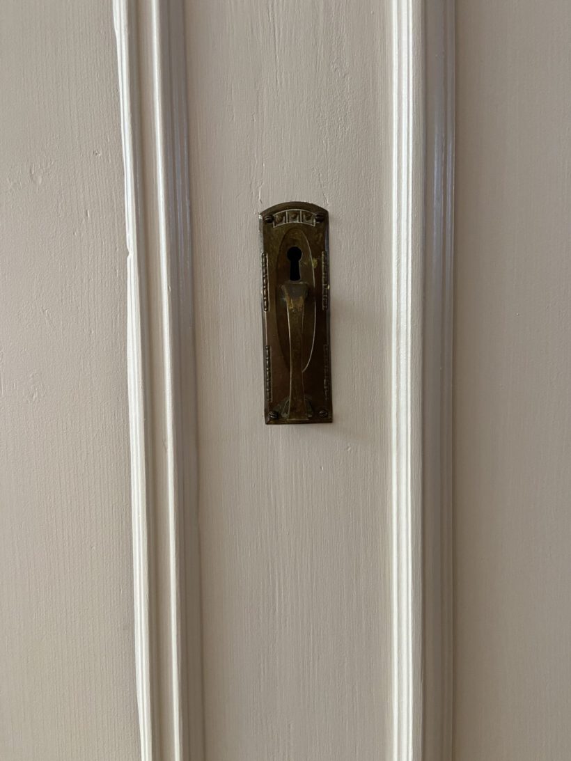 Der Schlüssel von Flora ist leider nicht mehr vorhanden, wir haben einen Kugelschnapper eingebaut, so dass die Tür gut schließt. Innen hat sie eine Kleiderstange und darüber einen Einlegeboden.