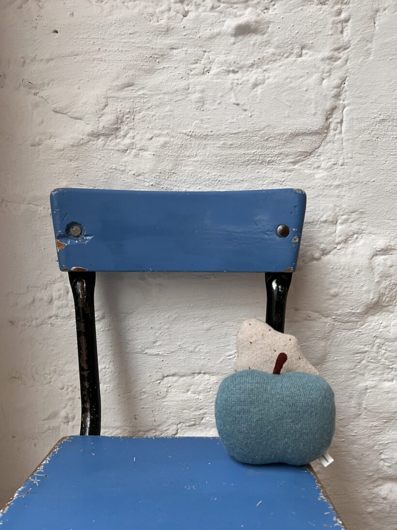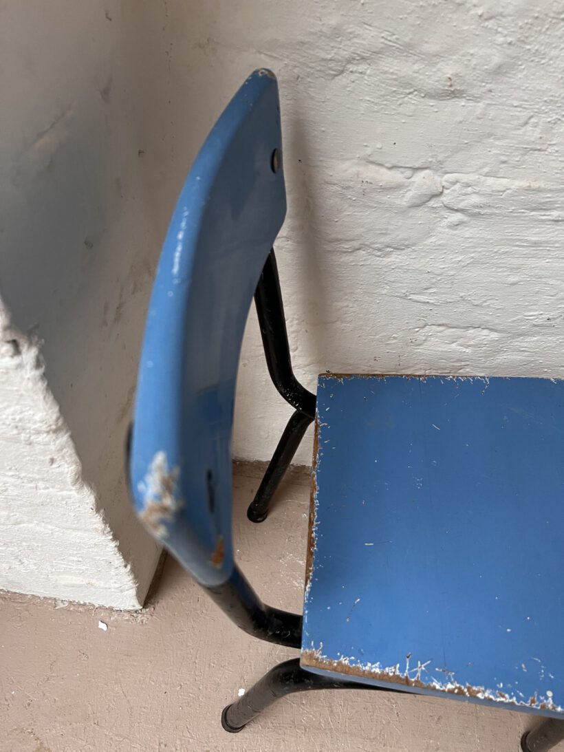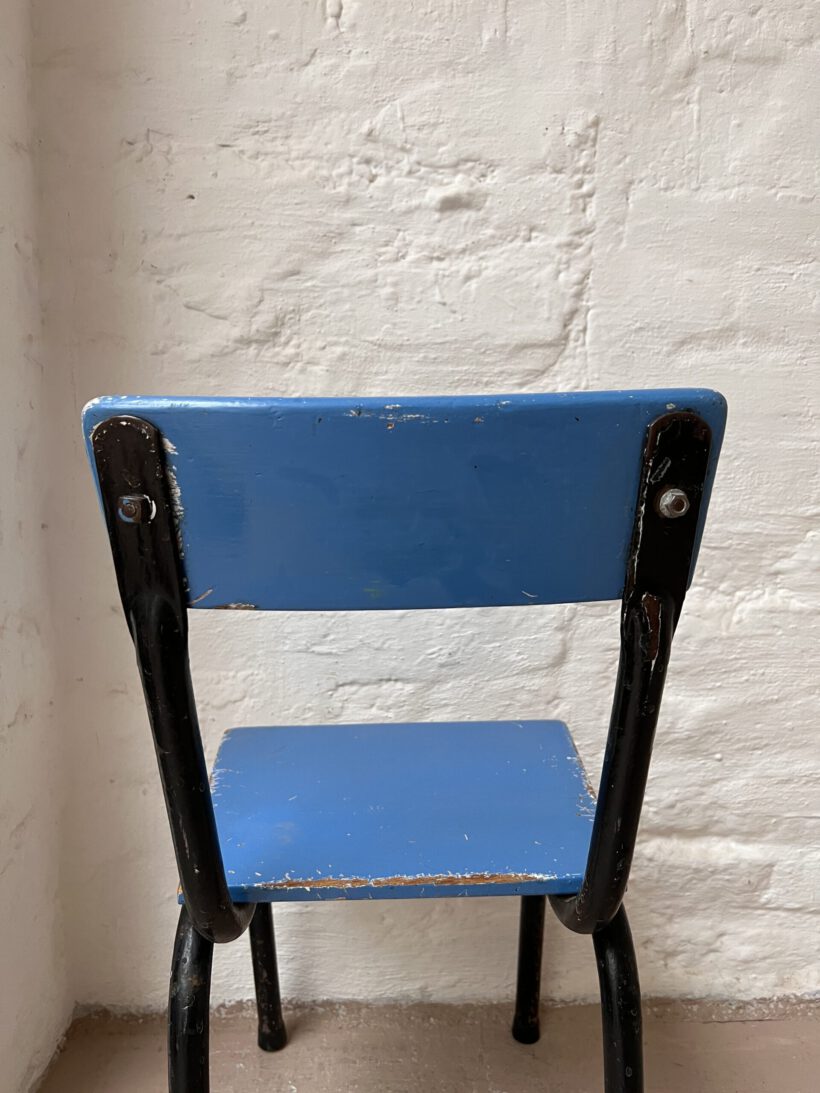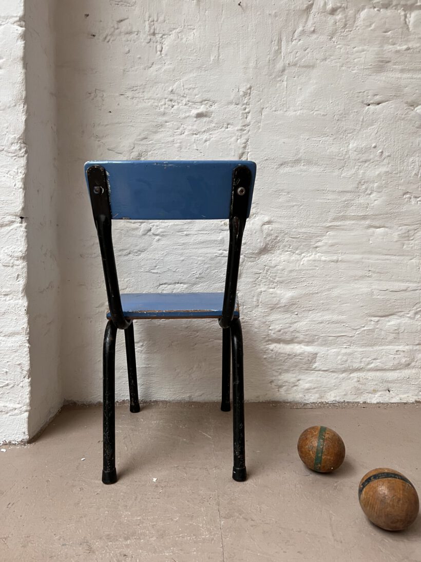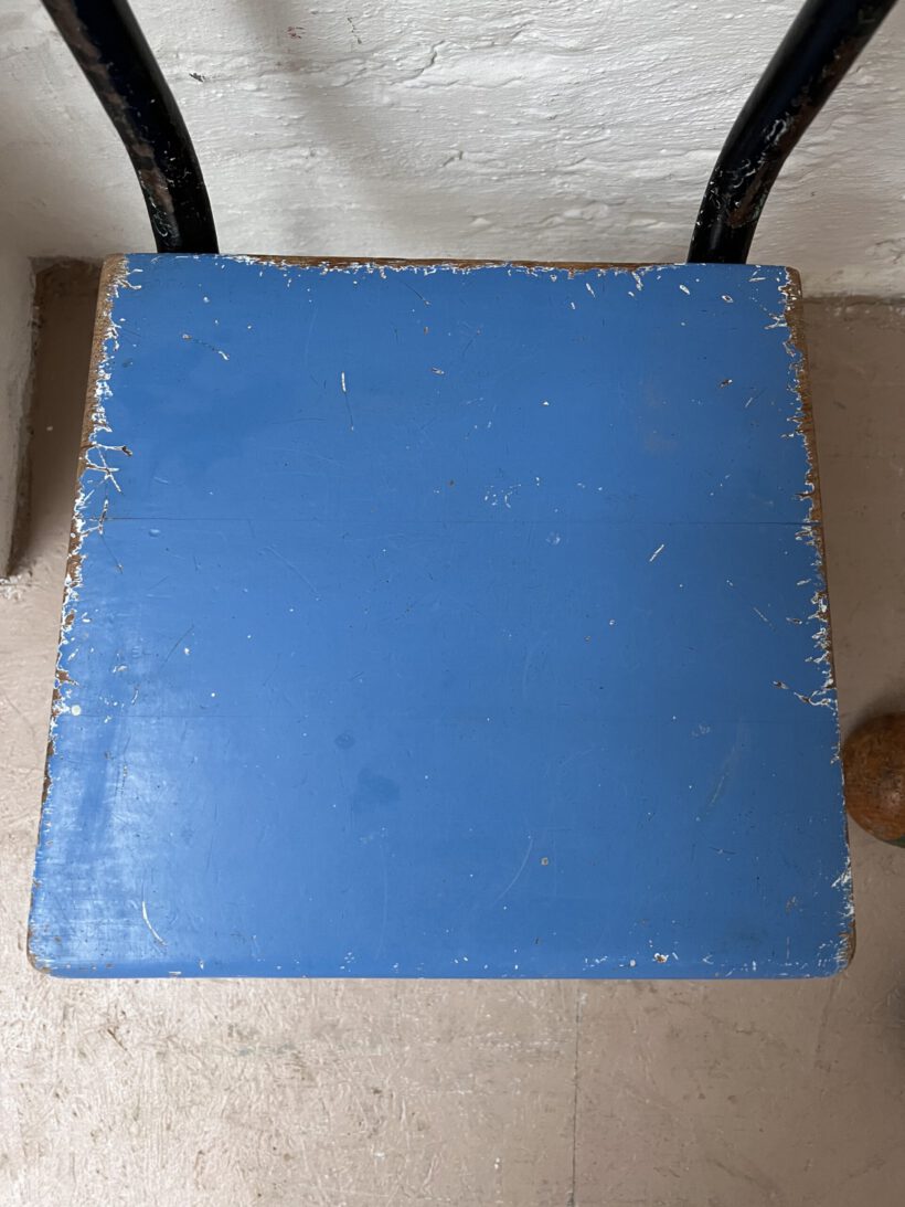 Hübscher kleiner Tubax Kinderstuhl mit blauer Patina. Francin stammt aus Frankreich aus den 50er Jahren.