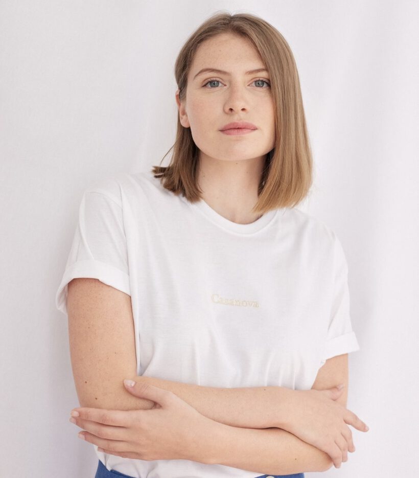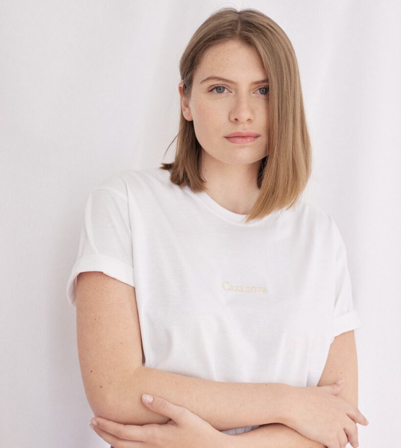 Ein Unisex-T-Shirt mit normaler Passform, das für alle Körpertypen geeignet ist. Ein einfacher, gerader und ausgewogener Schnitt für ein T-Shirt, das lange hält. Die bestickte Aufschrift „Casanova“ ist leicht beige und hebt sich nur dezent vom weiß ab – dies mit Absicht, denn es soll eine kleine süße Botschaft sein:-)