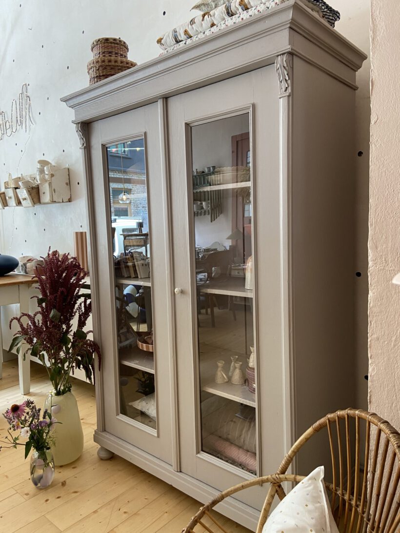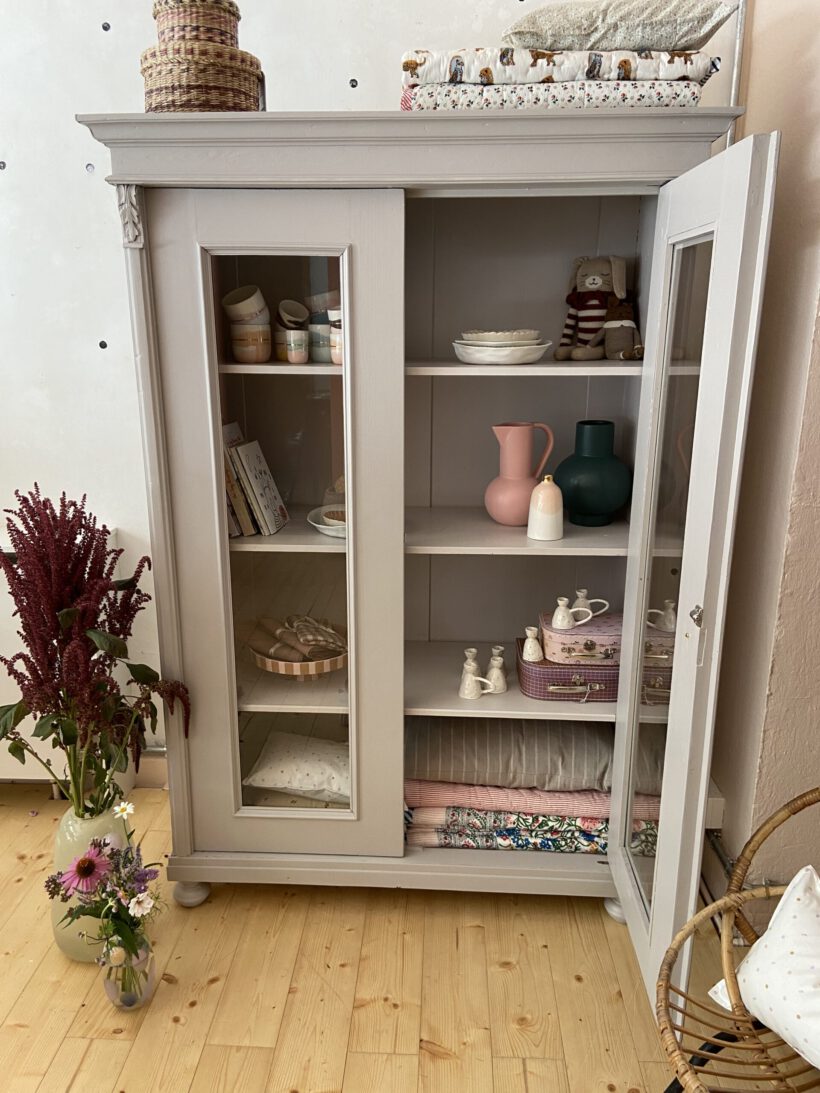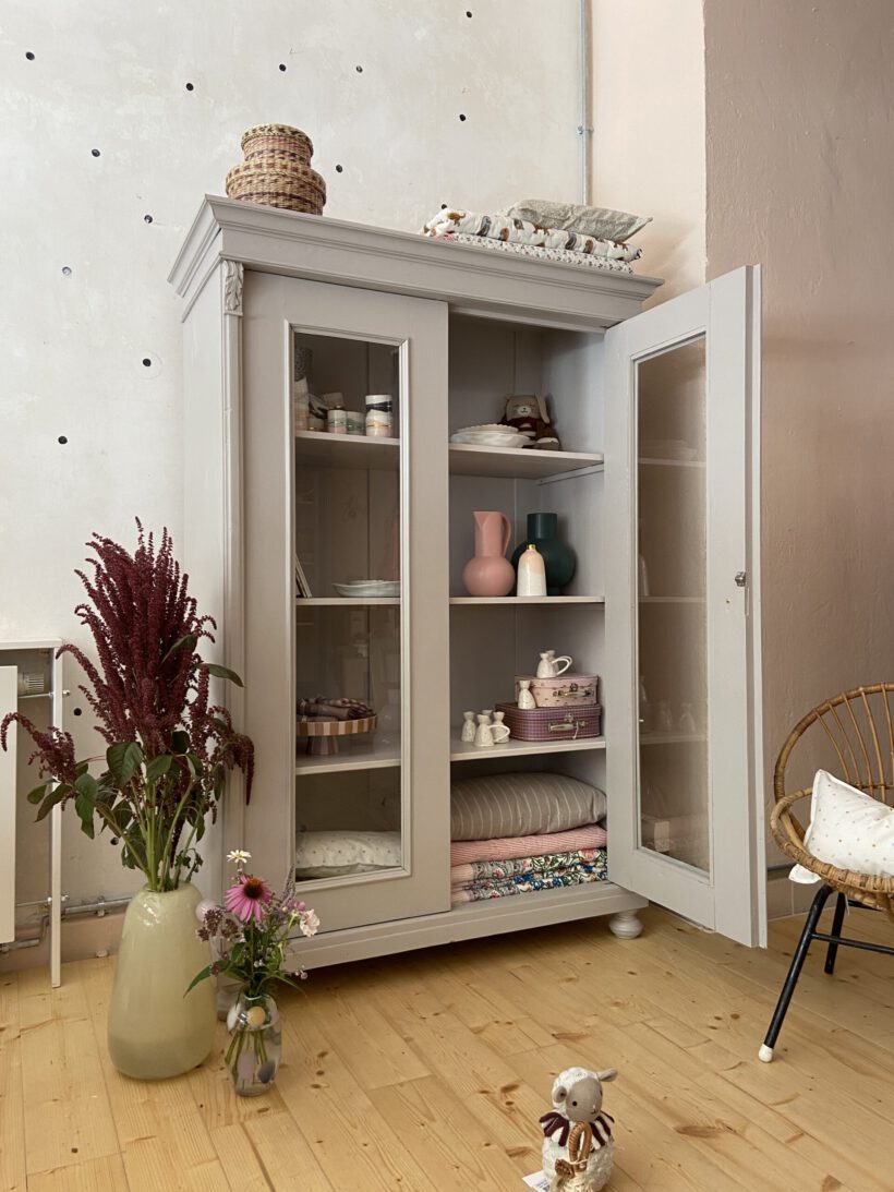 Sie stammt aus Prag, ist gute 120 Jahre alt und unglaublich charmant! Die Vitrine hat einen schlichten und klaren Look, den wir farblich noch unterstrichen haben mit zwei zeitlosen Grautönen. Gleichzeitig trägt sie wunderschöne Verzierungen oben links und rechts. Innen hat sie drei Einlegeböden und bietet jede Menge Fläche für eure liebsten Schätze.