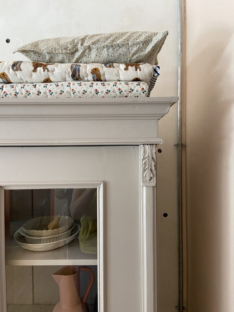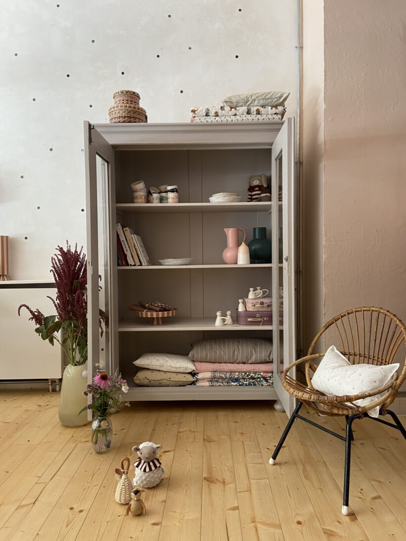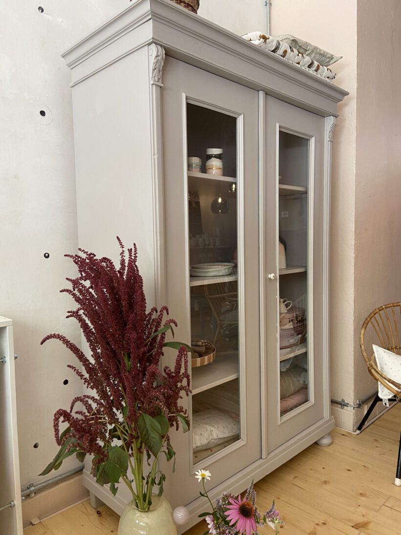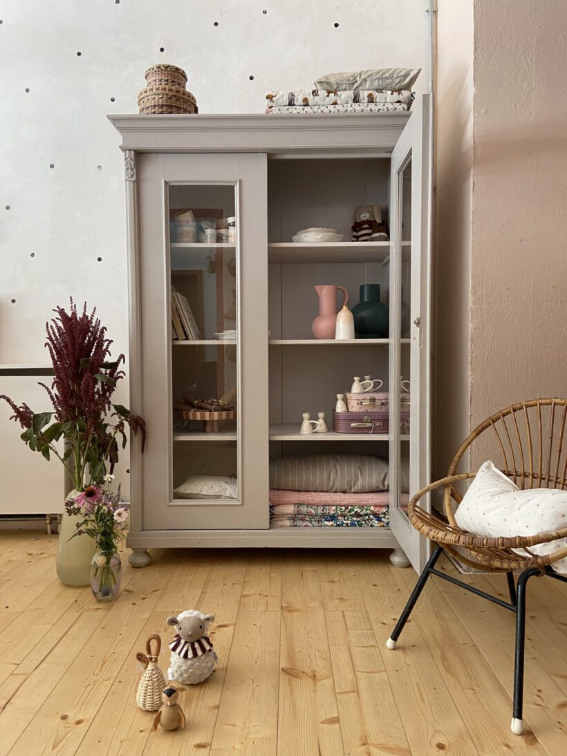 Sie stammt aus Prag, ist gute 120 Jahre alt und unglaublich charmant! Die Vitrine hat einen schlichten und klaren Look, den wir farblich noch unterstrichen haben mit zwei zeitlosen Grautönen. Gleichzeitig trägt sie wunderschöne Verzierungen oben links und rechts. Innen hat sie drei Einlegeböden und bietet jede Menge Fläche für eure liebsten Schätze.