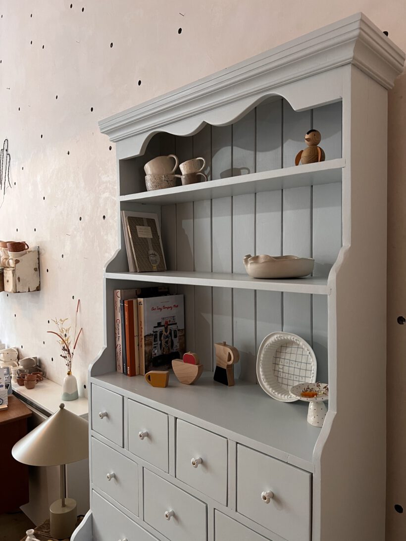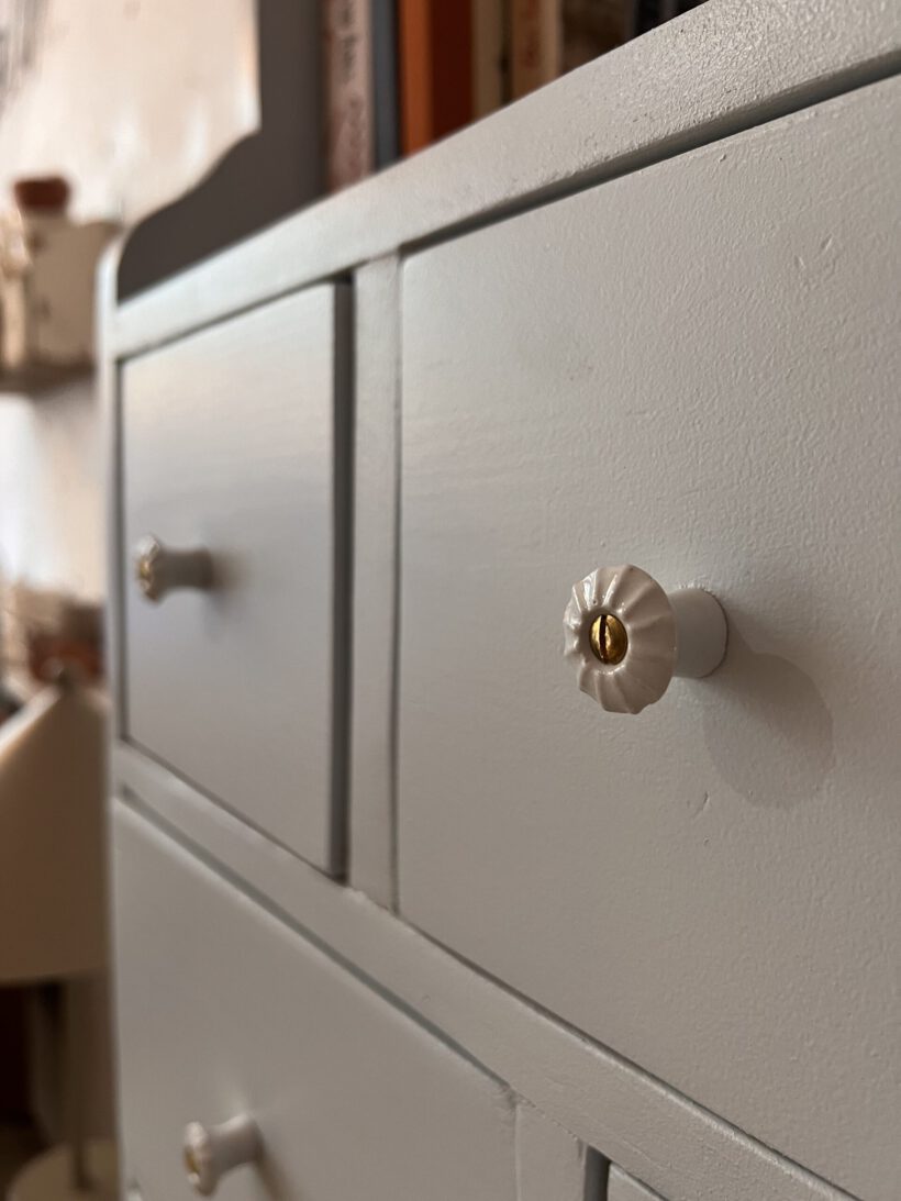 Friedel hat wurde von uns in ein ganz helles blaugrau von Farrow and Ball getaucht. Dafür wurde sie geschliffen, grundiert und zwei Mal lackiert.