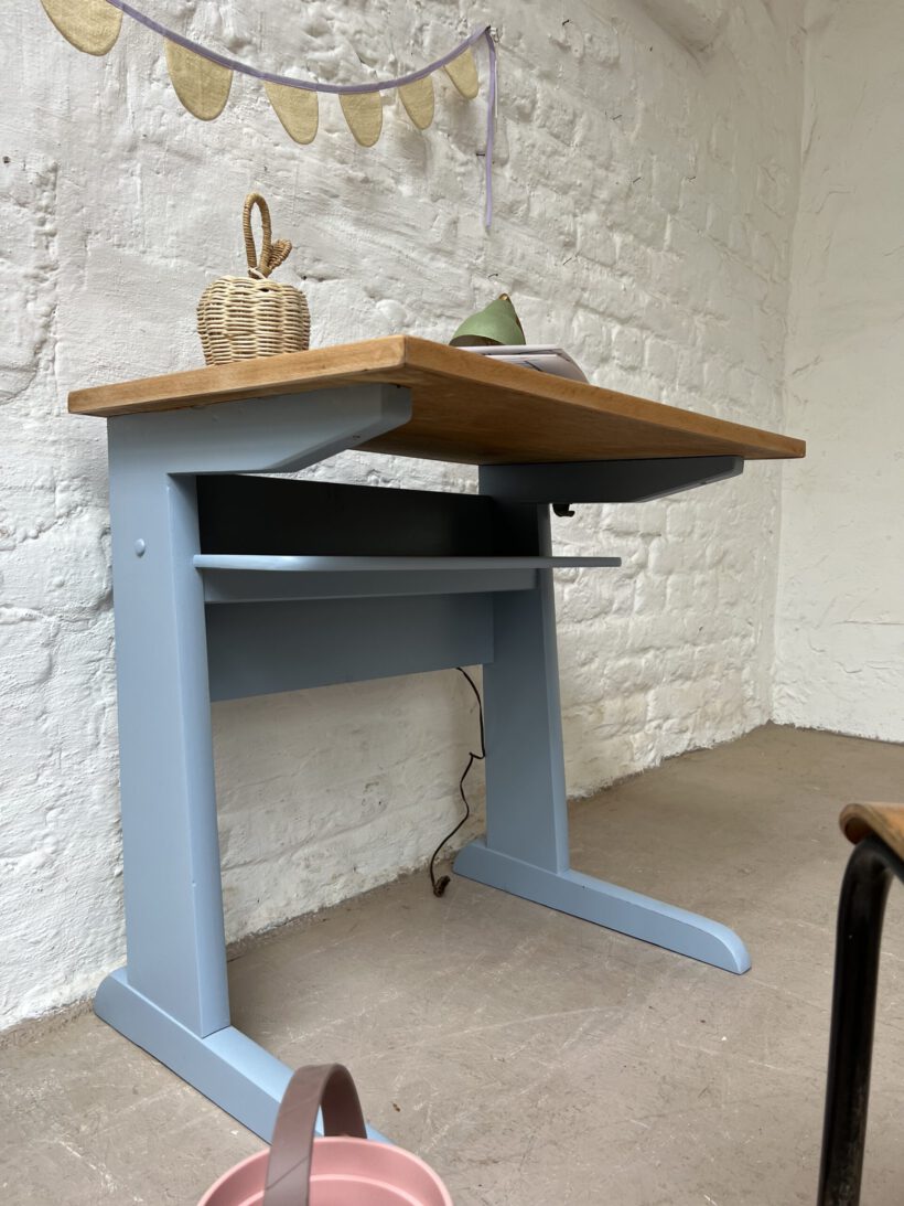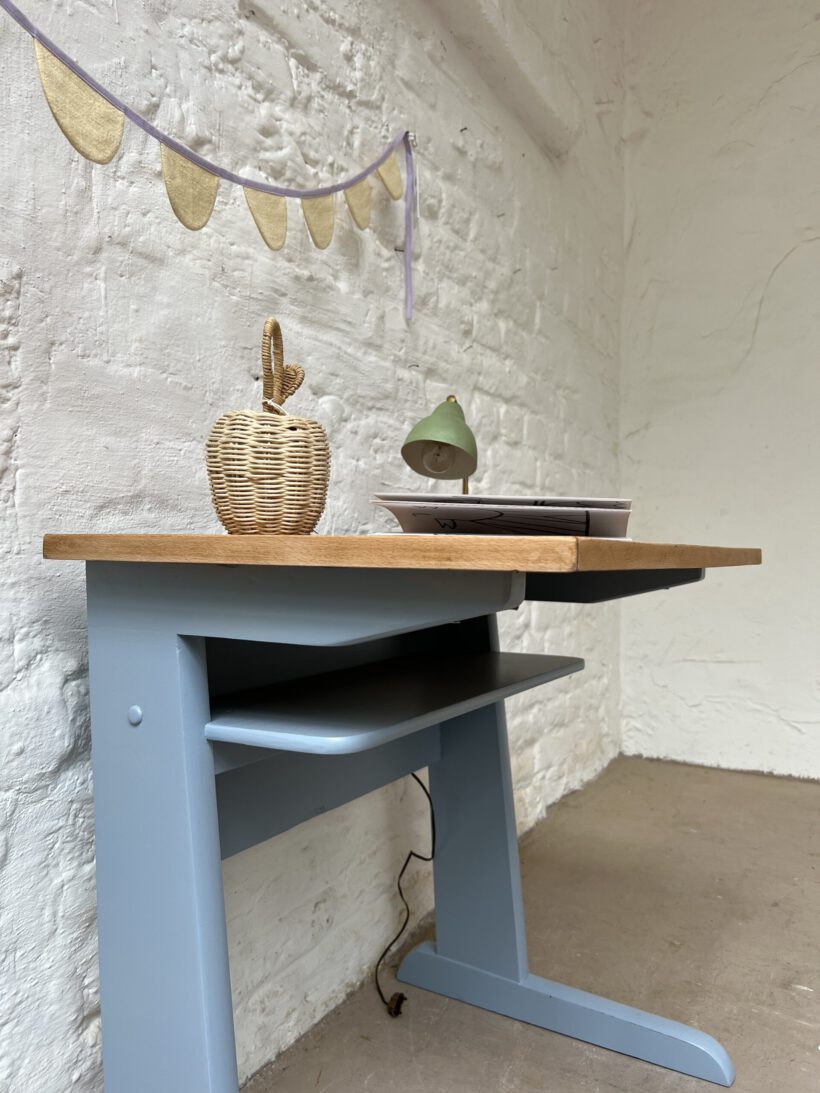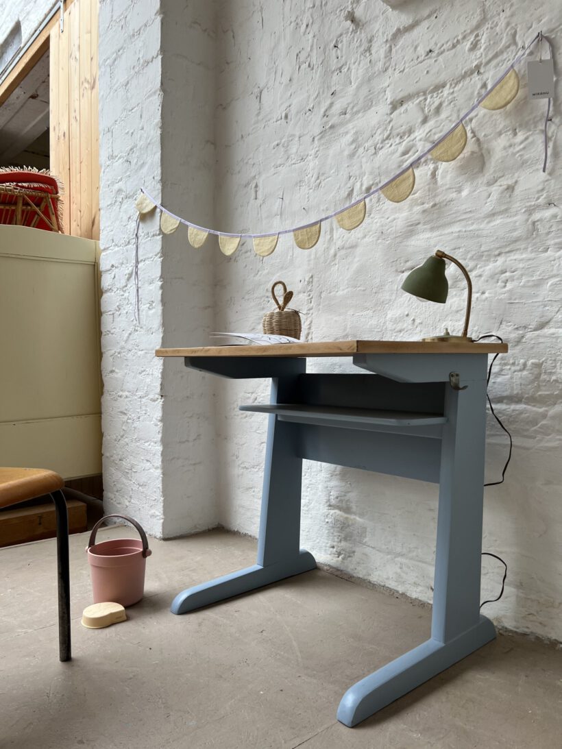 ein zuckersüßes kleines altes Schulpult aus Frankreich im midcentury Design. Gabrielle hat von uns ein schönes mittelblau von Farrow and Ball bekommen, das ganz wunderbar zur Holzfarbe der Tischplatte passt. Auch die haben wir geschliffen und geölt. Gabrielle ist ein hübscher kleiner Schreibtisch für Schulanfänger über die gesamte Grundschulzeit. Das große Fach unter der Tischplatte bietet Platz für jede Menge Hefte & Bücher.