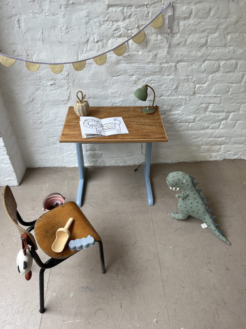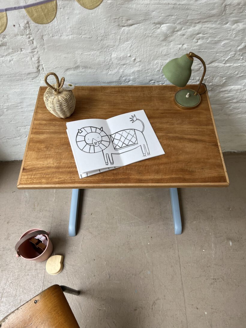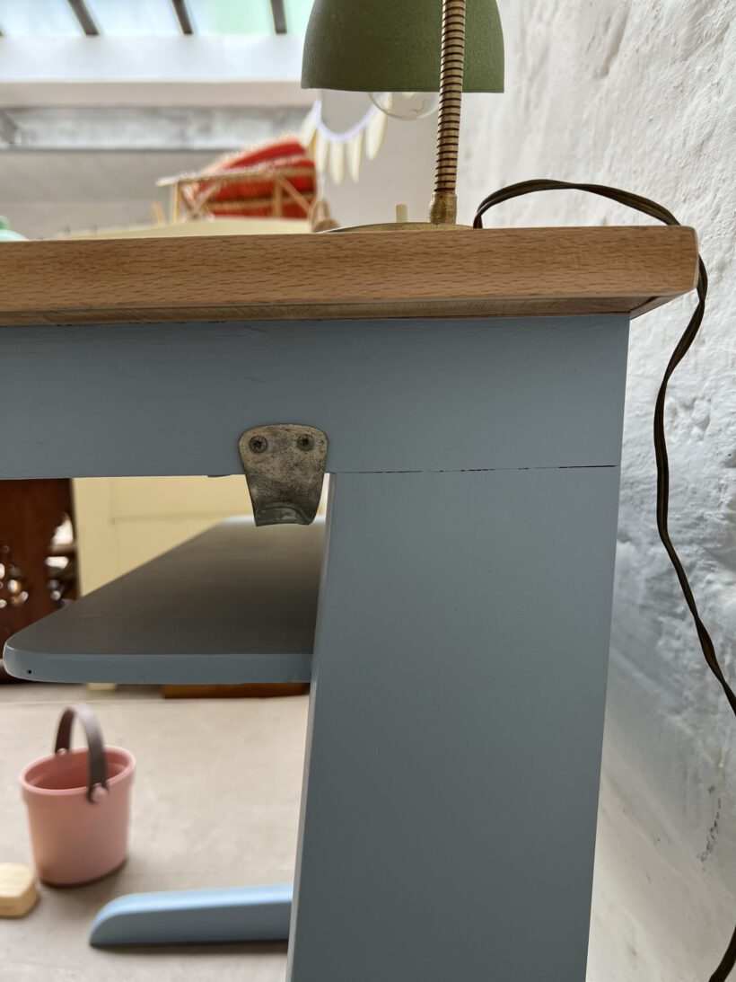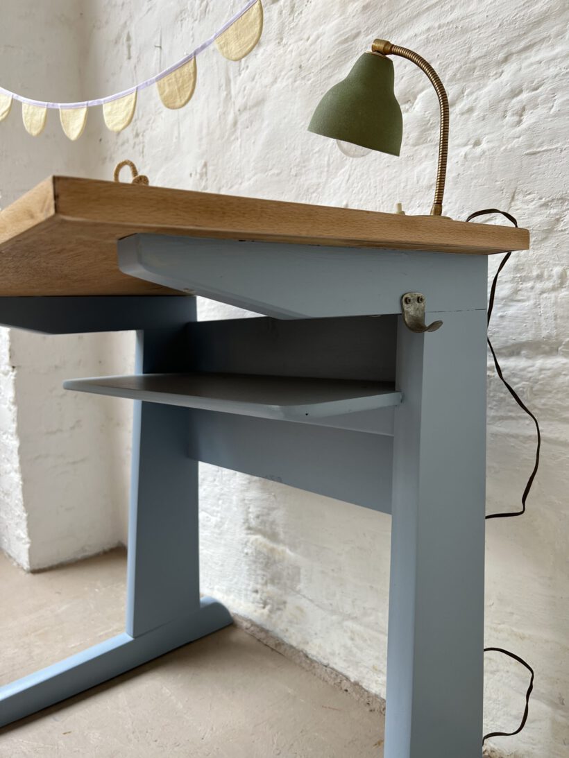 ein zuckersüßes kleines altes Schulpult aus Frankreich im midcentury Design. Gabrielle hat von uns ein schönes mittelblau von Farrow and Ball bekommen, das ganz wunderbar zur Holzfarbe der Tischplatte passt. Auch die haben wir geschliffen und geölt. Gabrielle ist ein hübscher kleiner Schreibtisch für Schulanfänger über die gesamte Grundschulzeit. Das große Fach unter der Tischplatte bietet Platz für jede Menge Hefte & Bücher.