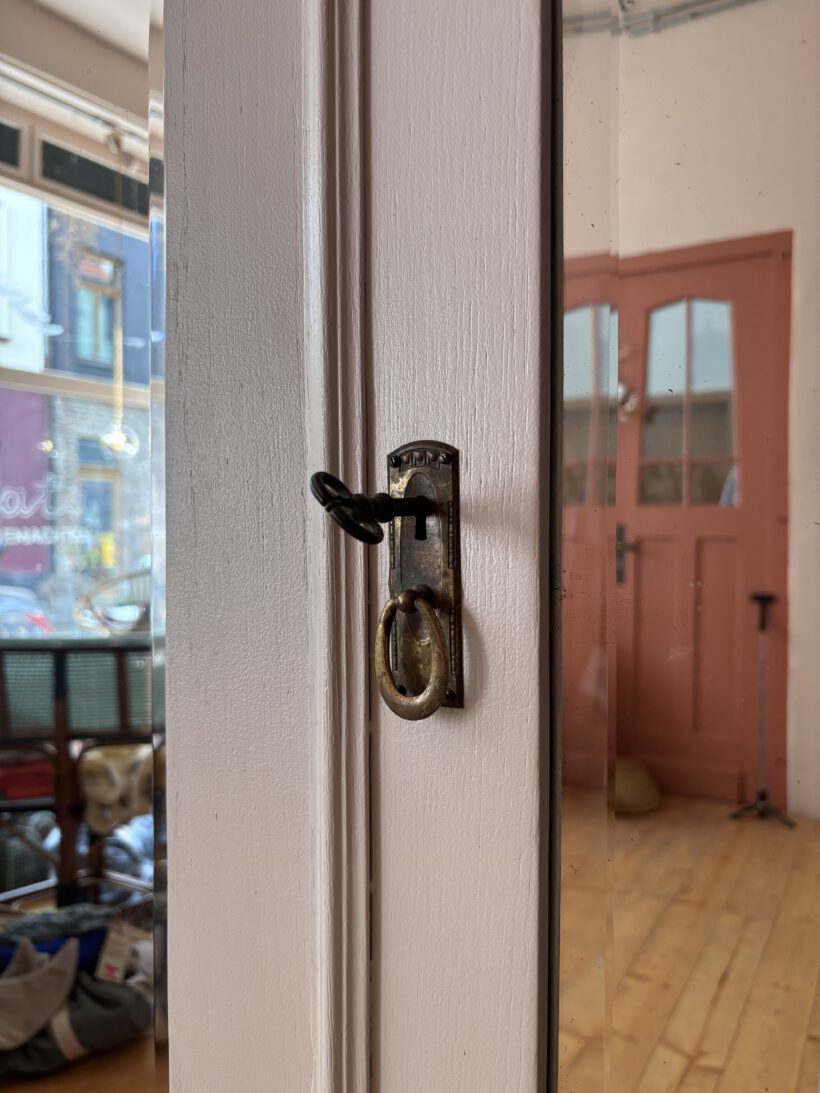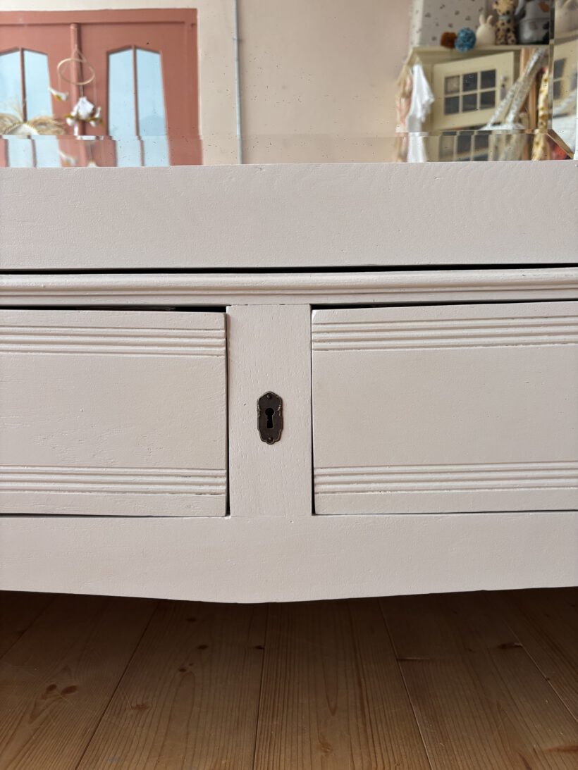 Wir haben in Gautier sehr viel Liebe gesteckt, er hat von uns statt der ursprünglich zwei Türen eine dritte Tür bekommen. Die rechte Seite stand zuvor fest und konnte nicht geöffnet werden. Für den Umbau haben wir im rechten Seitenteil – die Ränder entfernt, Bänder eingezogen, Drehpunkte bestimmt und geschliffen was das Zeug hält. Nun hat er eine charmante dritte Tür, die per Kugelschnapper schließt. Die mittlere schließt per original Schlüssel. Alle Türen laufen einwandfrei.