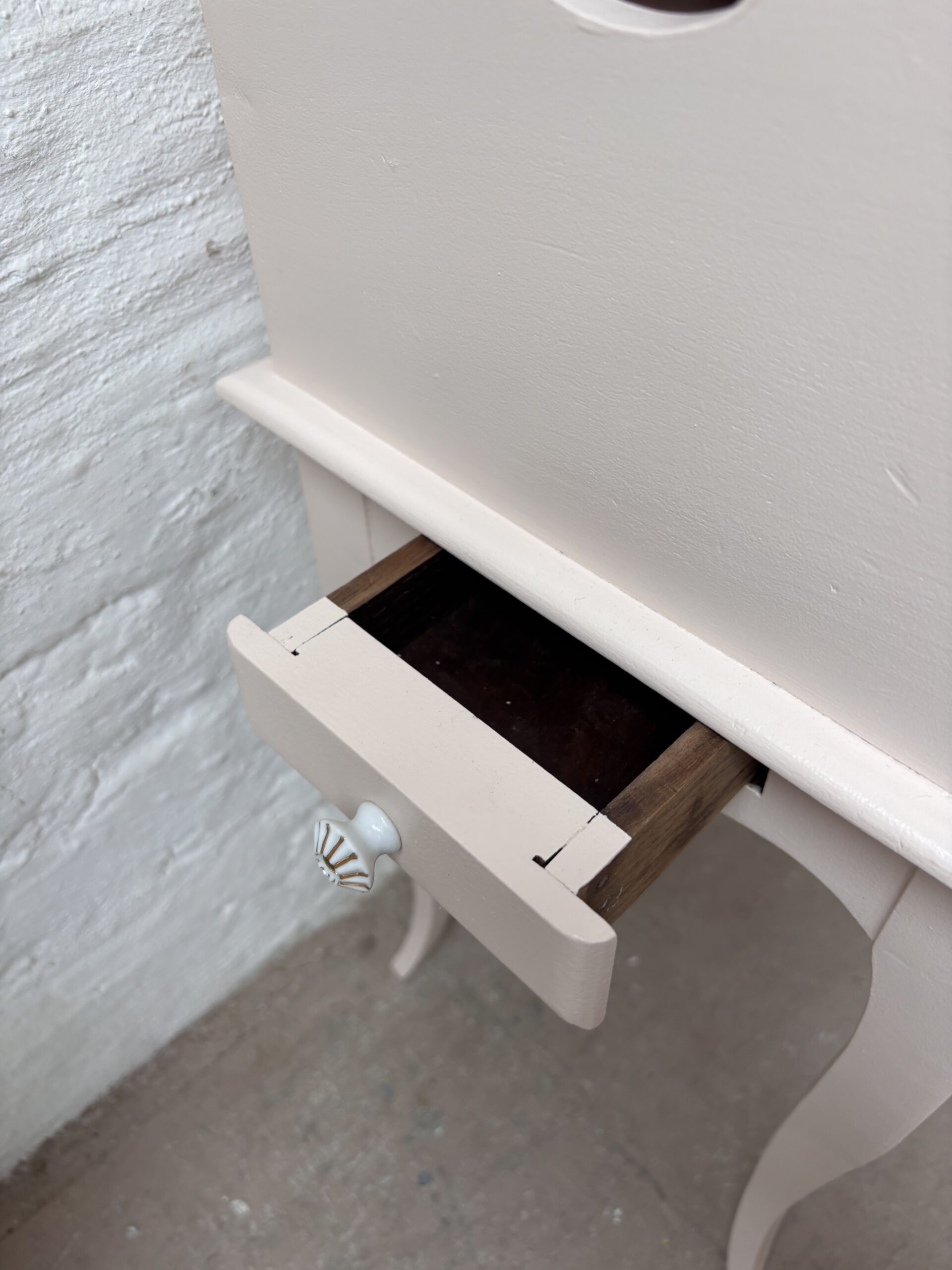 eine wunderschöne kleine Kommode auf eleganten Beinen mit wenig Tiefe. Gefunden im Norden Frankreichs musste sie einfach mit uns mit und wir sind happy, denn sie ist besonders süß. Ganz toll ist die kleine Schublade links an der Seite. Diese hat von uns einen kleinen hübschen Keramikknopf bekommen und sieht so nun besonders hübsch aus. Geneviève passt tatsächlich so gut wie überall hin: ob als kleines Kommödchen oder Beistelltisch – einfach wunderbar.