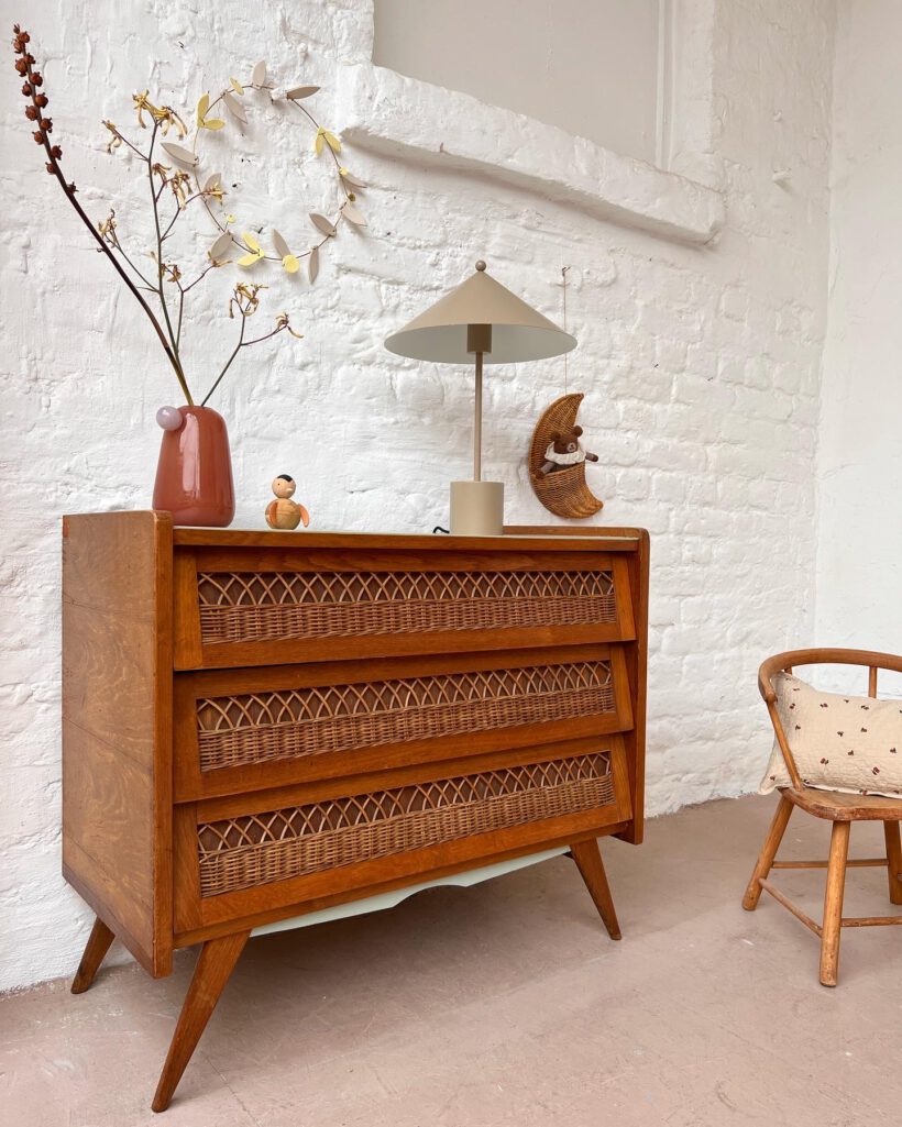 Geraldine‘s Midcentury Design ist sehr besonders, mit der Rattanverzierung an den Schubladen und der mintfarbenen Platte und unteren Verzierung. Sie ist ein Möbel das selten zu finden und selten schön ist;-)
