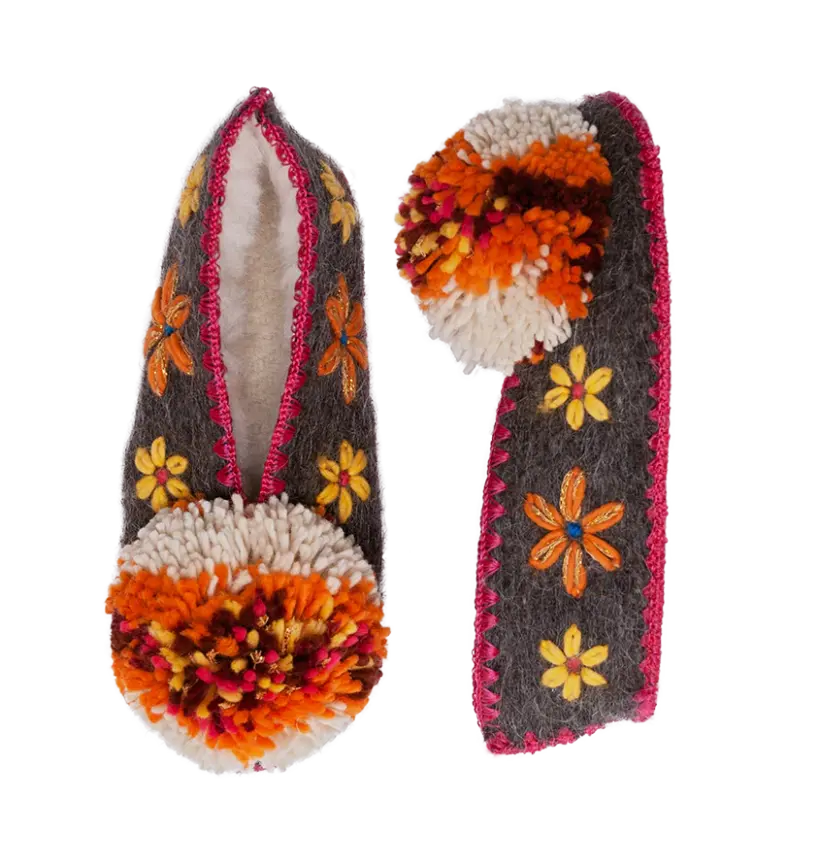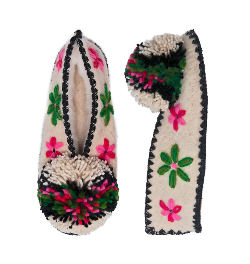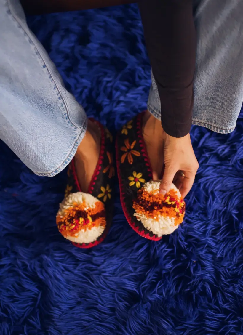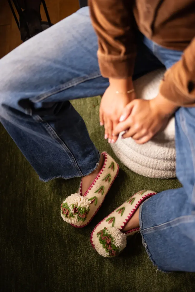 Das Gleiche und doch ganz anders. Vielleicht denkst du, hey,ich kenne diese Hausschuhe aus meinem Urlaub auf einer der schönen griechischen Inseln. Auch Julia und Denise haben sich in die Souvenirversion des griechischen Hausschuhs verguckt und ihm ihren eigenen Twist verpasst. Zunächst einmal haben sie die Hausschuhe aus 100 % Schafwolle hergestellt, der Pompon wurdeein gutes Stückgrößer und sie haben die ursprünglichen Verzierungen auf den Hausschuhen zurückgebracht. Eine Ode an die griechische Handwerkskunst.
