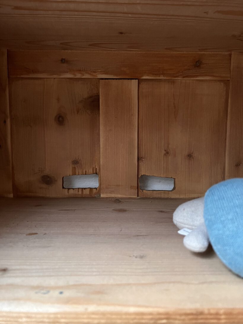 Helen hat innen vier Ablagefächer. Der Schlüssel ist vorhanden. Hinten in der Rückwand wurden Helen im Laufe der Jahre zwei Löcher zugefügt – vermutlich für das Verstauen von Elektrogeräten. Dies stören die Konstruktion nicht und auch nicht den Inhalt. Sie sind klein;-)