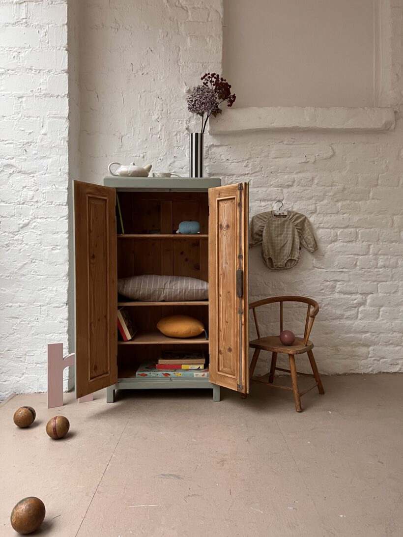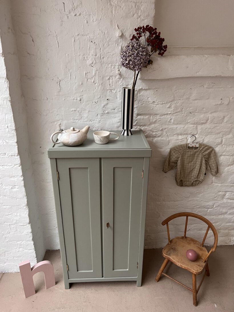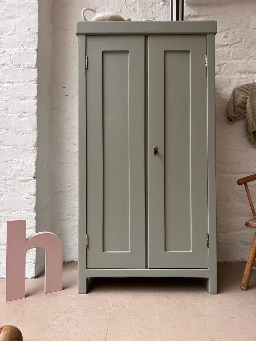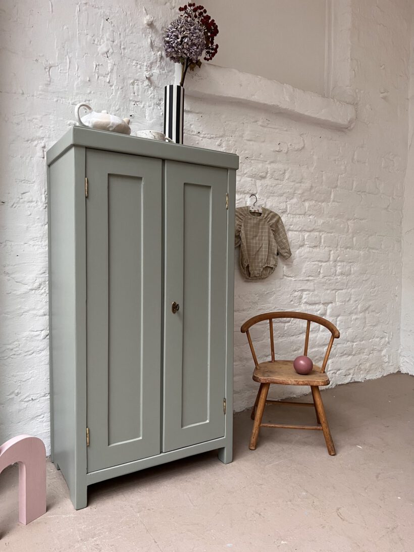 Helen ist gerade mal 60 cm breit und trägt trotz schmaler Breite zwei Türen. Das ist äußerst selten und sehr charmant. Ihre Größe ist perfekt für kleine Räume die Eyecatcher Potenzial suchen. Wir haben Helen in eine unserer Lieblingsfarben getaucht – ein Salbeigrau von Farrow and Ball. Dafür wurde sie geschliffen, grundiert und zwei Mal lackiert.