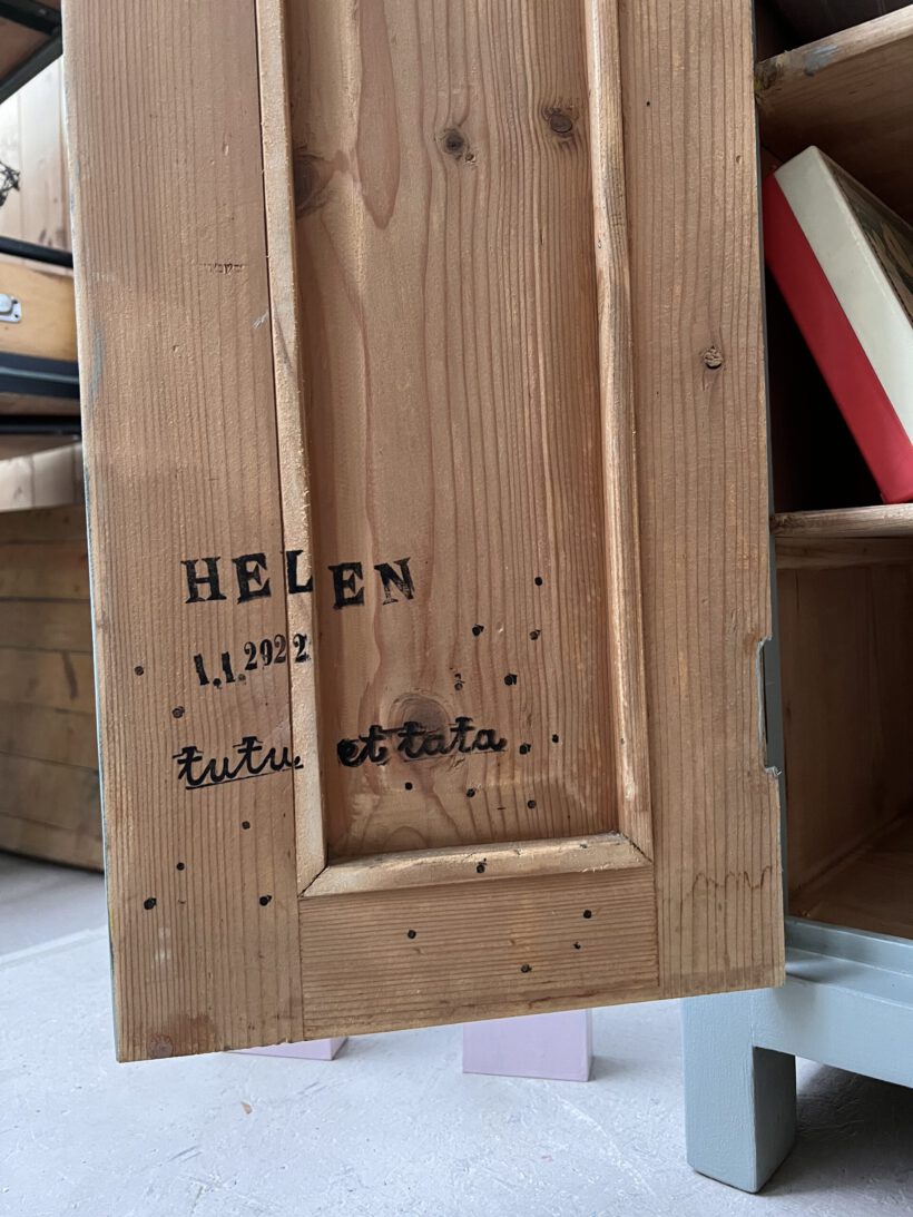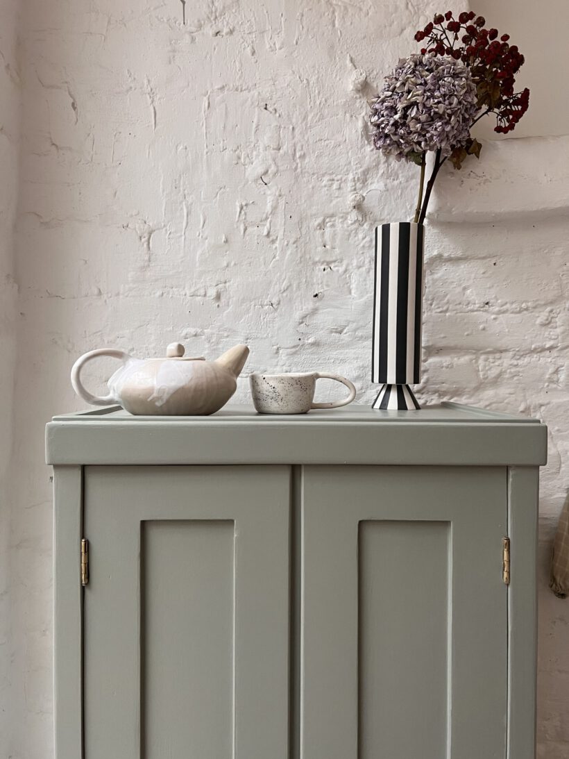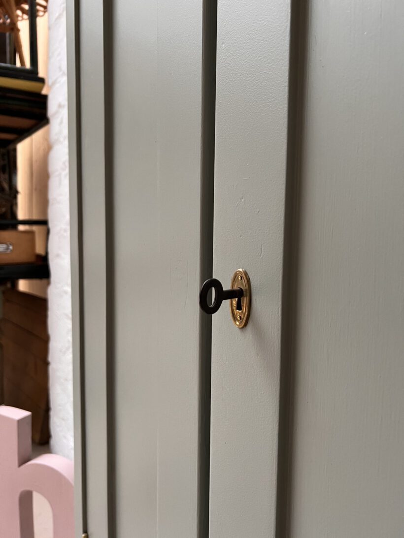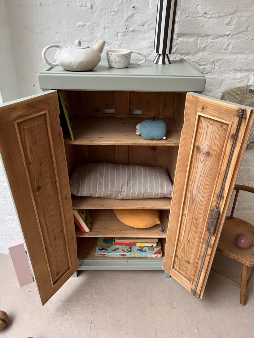 Helen ist gerade mal 60 cm breit und trägt trotz schmaler Breite zwei Türen. Das ist äußerst selten und sehr charmant. Ihre Größe ist perfekt für kleine Räume die Eyecatcher Potenzial suchen. Wir haben Helen in eine unserer Lieblingsfarben getaucht – ein Salbeigrau von Farrow and Ball. Dafür wurde sie geschliffen, grundiert und zwei Mal lackiert.